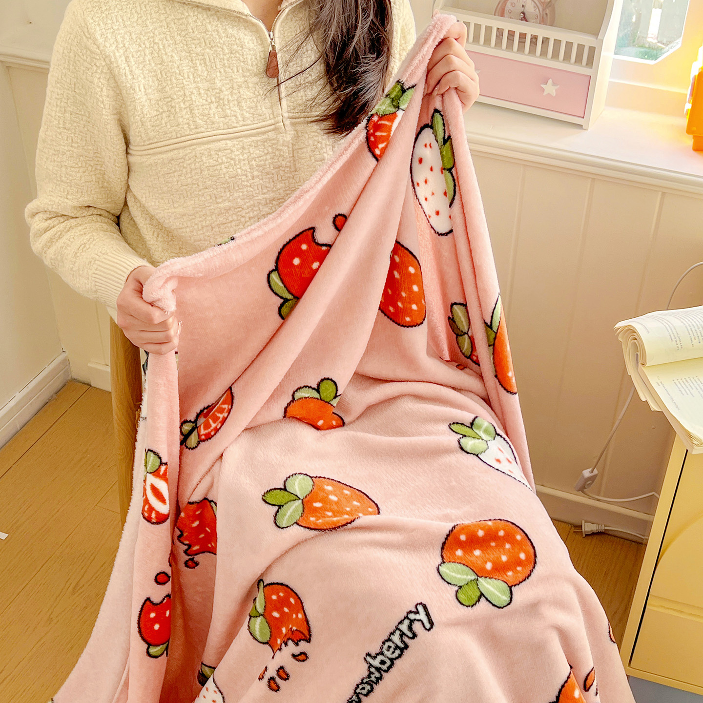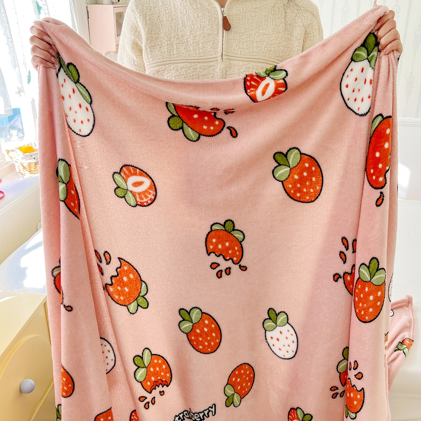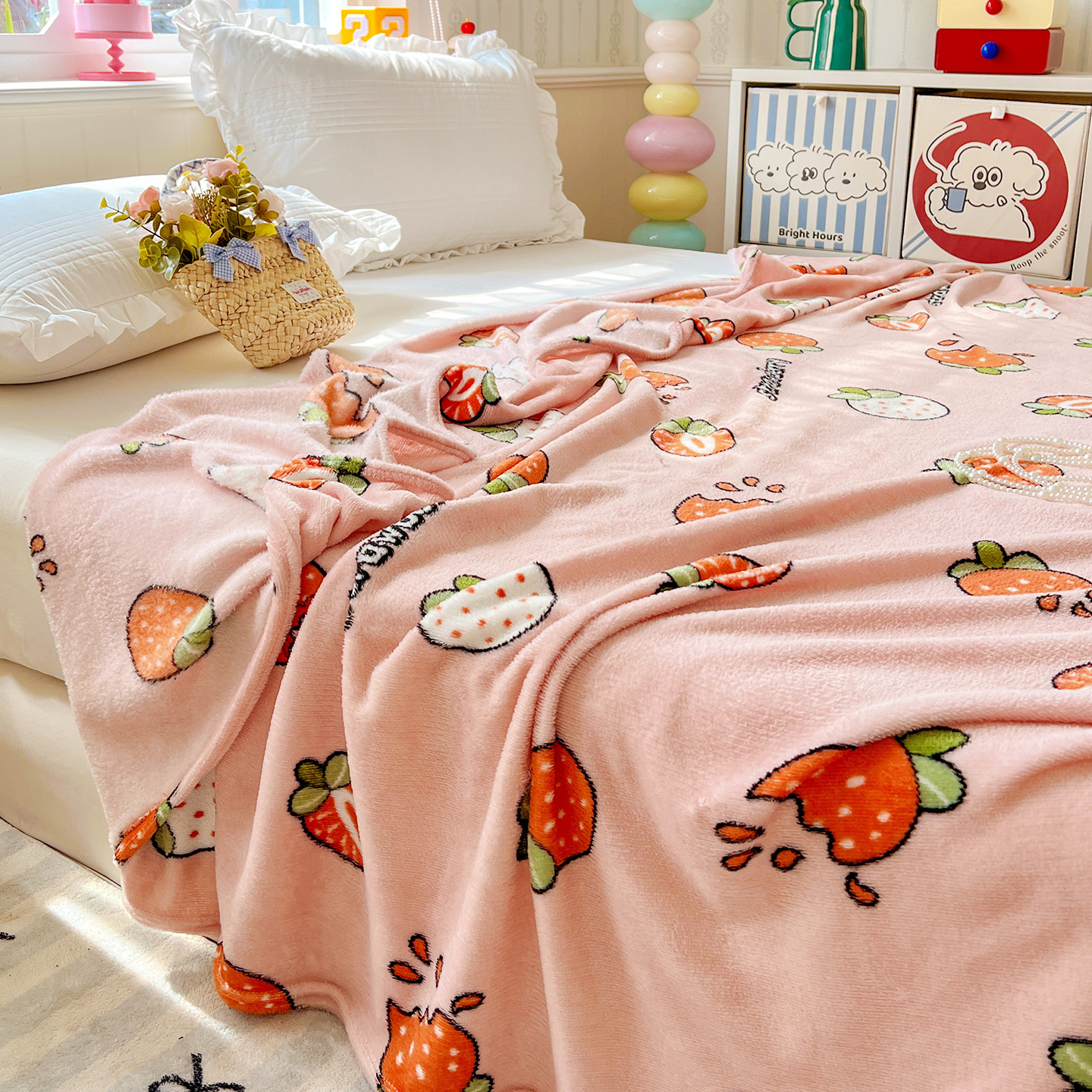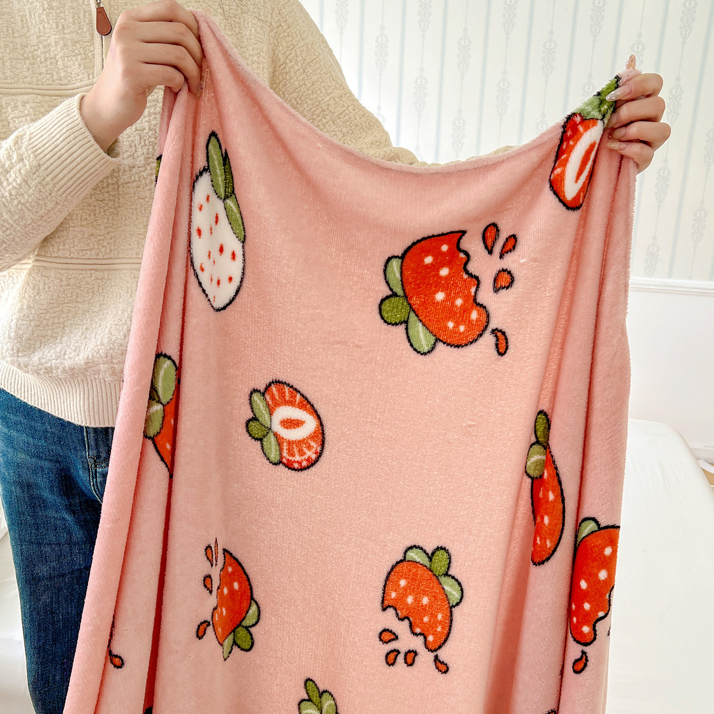 商品名称:悦织湾家纺 2026新款印花法兰绒毛毯牛奶绒盖毯春秋空调毯儿童床单小被子 奶油草莓