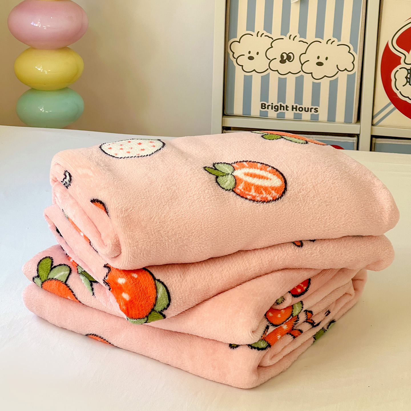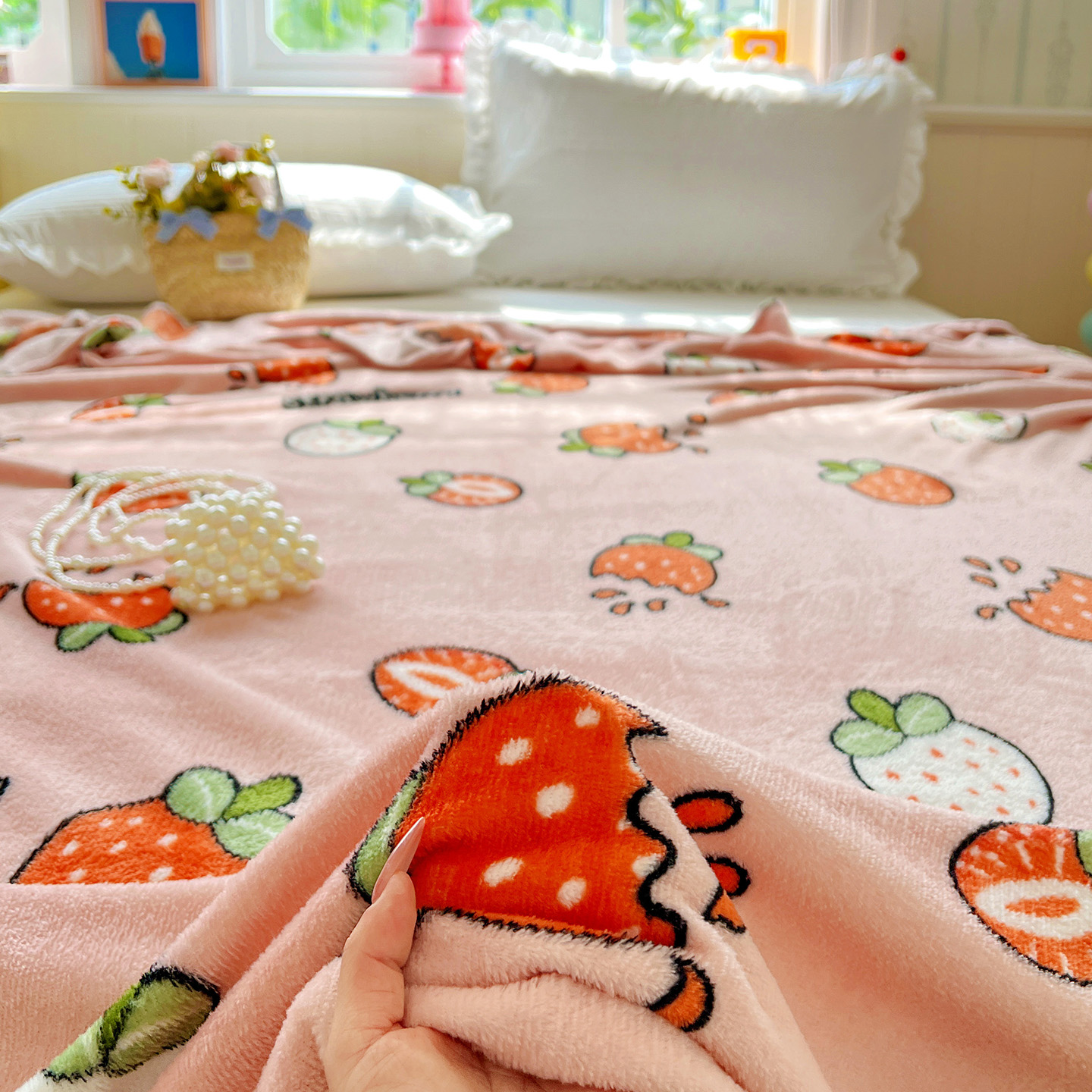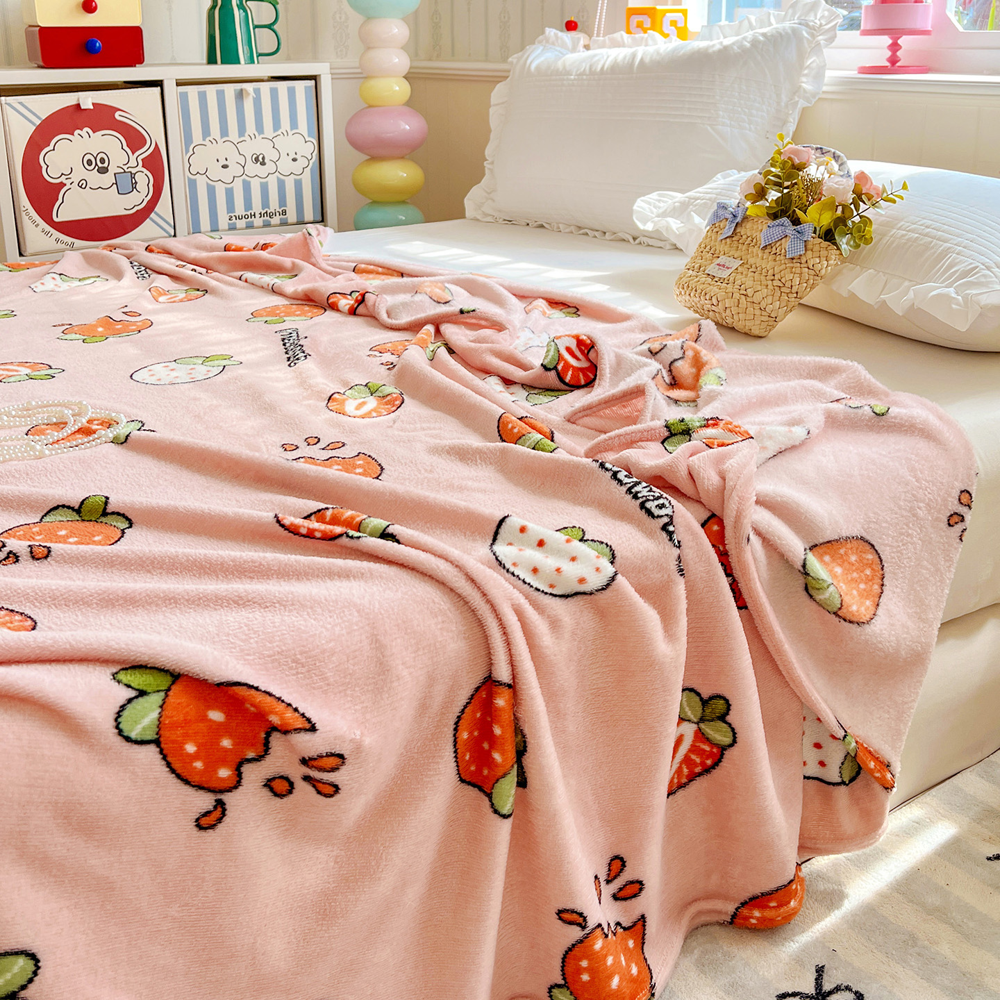 悦织湾家纺 2026新款印花法兰绒毛毯牛奶绒盖毯春秋空调毯儿童床单小被子 奶油草莓