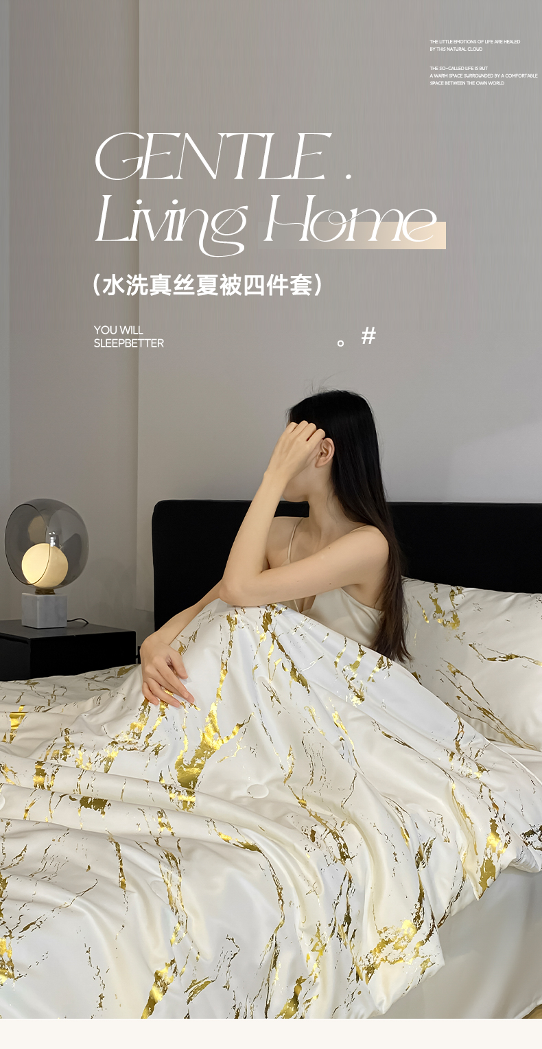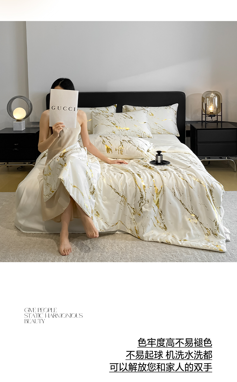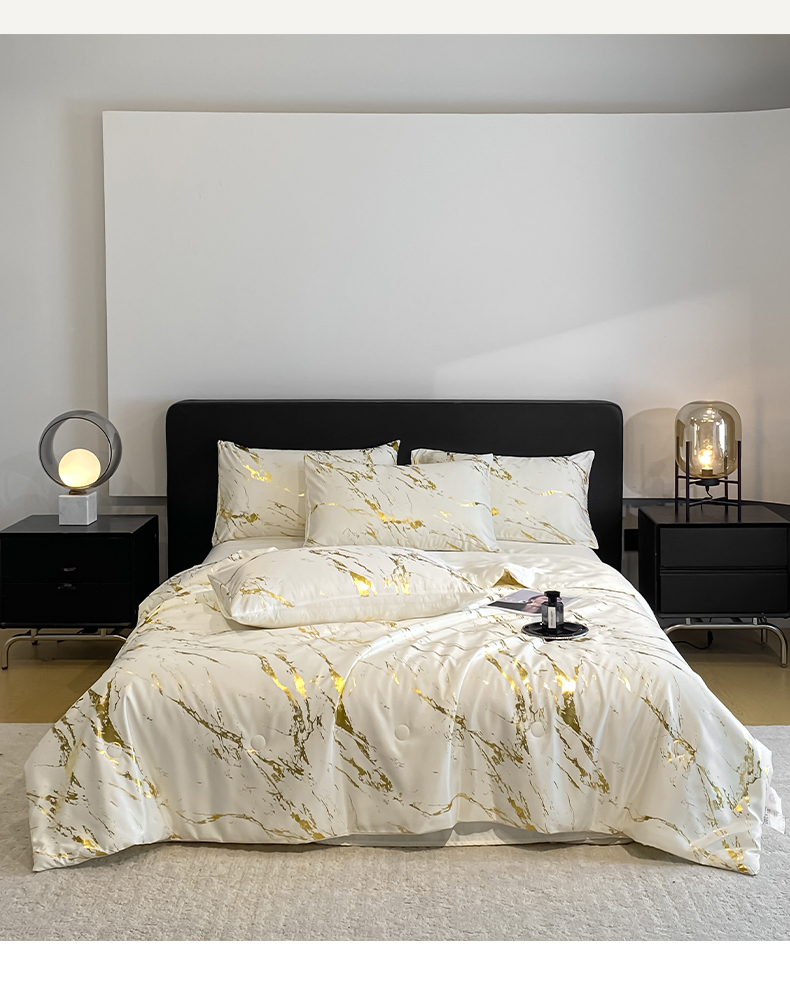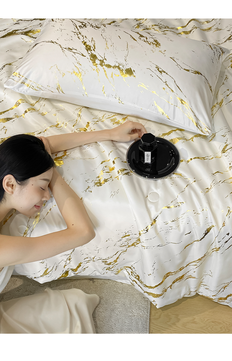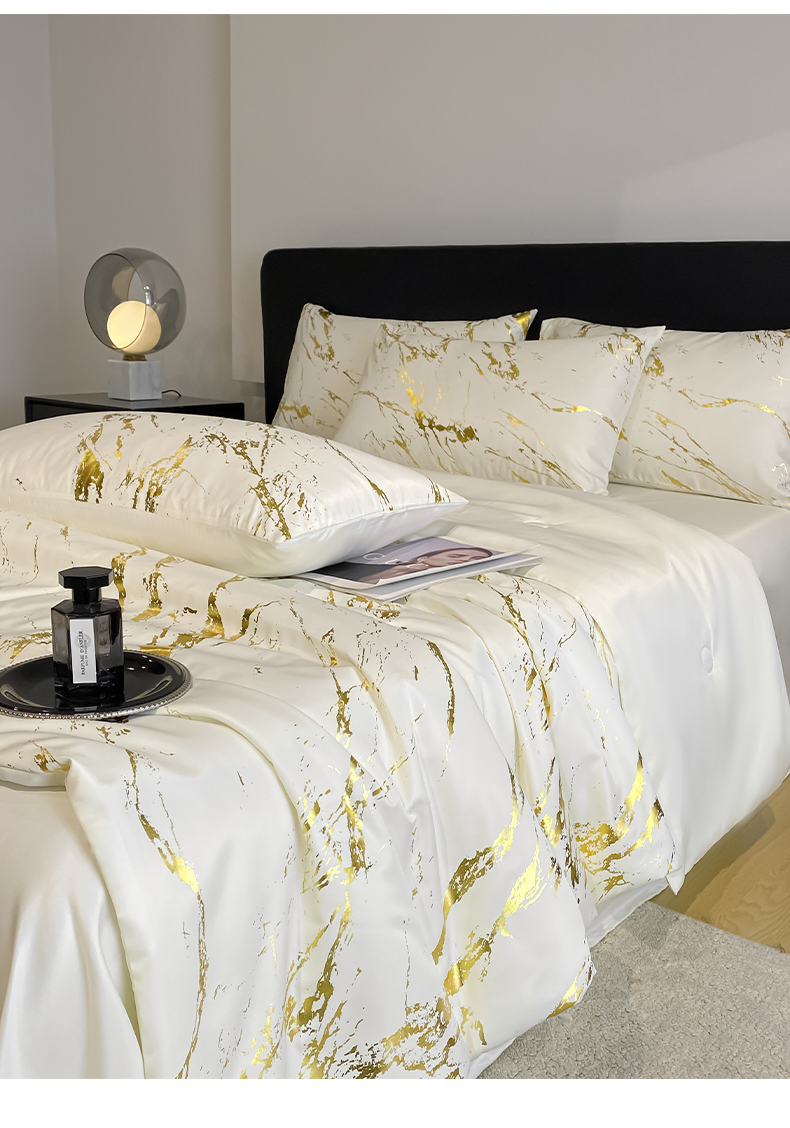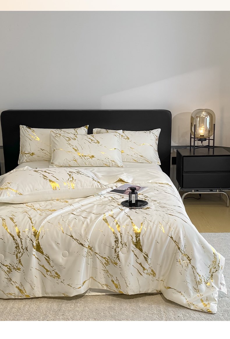 (总)宇航家纺 2026新款简约大理石纹烫金水洗真丝夏被四件套
