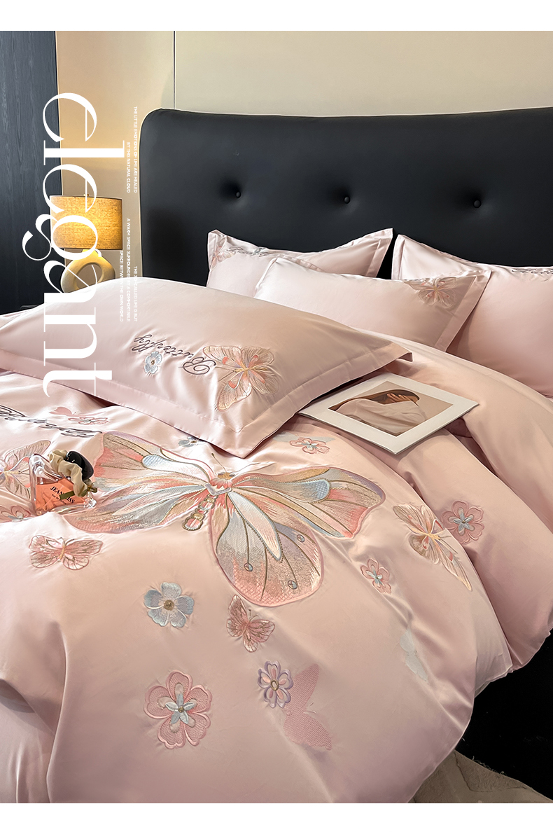 绘萱家居 2026直播爆款纯棉100%全棉纯棉绣花四件套圆角吊边床单款纯色百分百 蝶舞牡丹-粉
