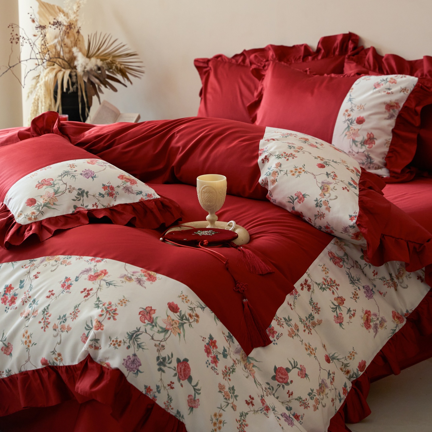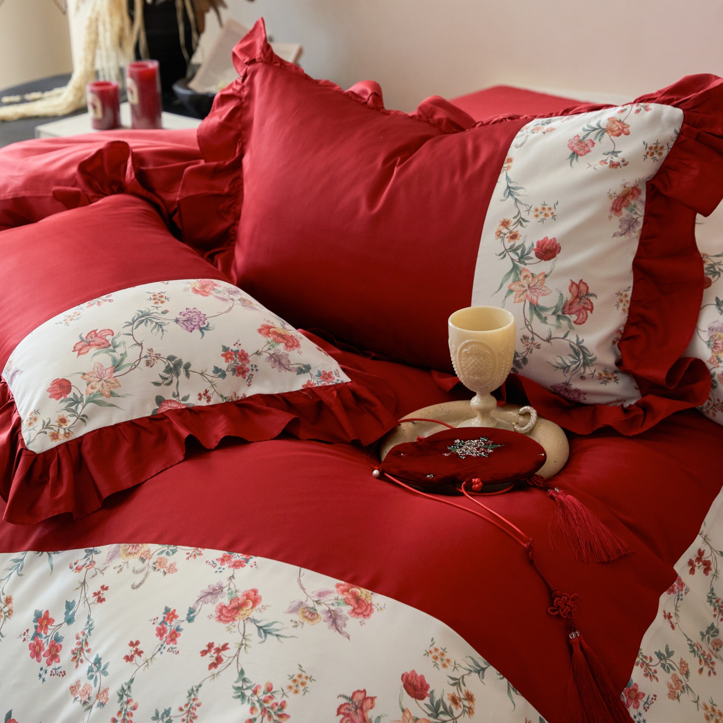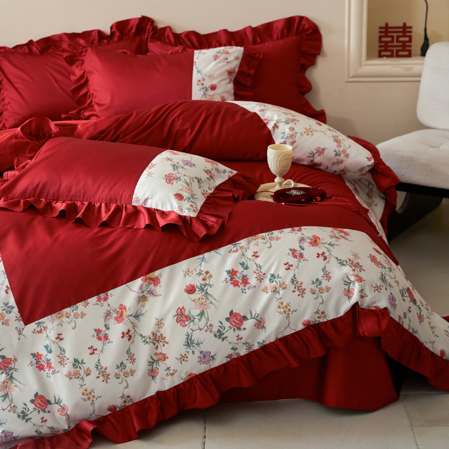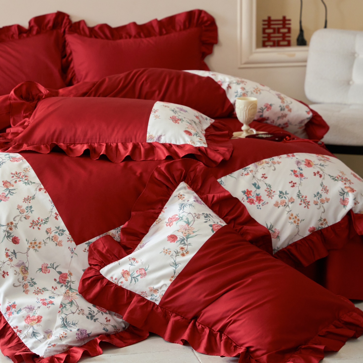 (总)优然居家纺 2025春夏新款木耳边喜字蝴蝶结小爱心复古红四件套-小欢喜,小欢喜
