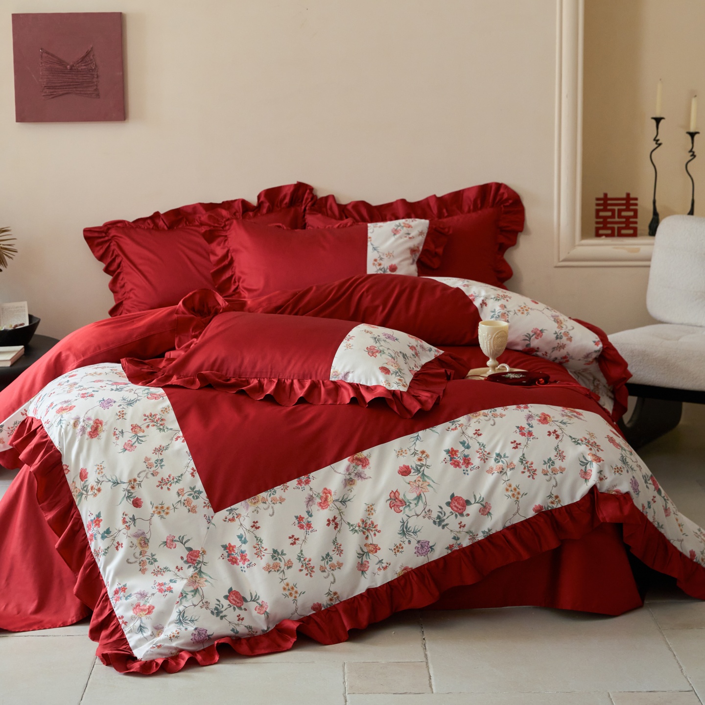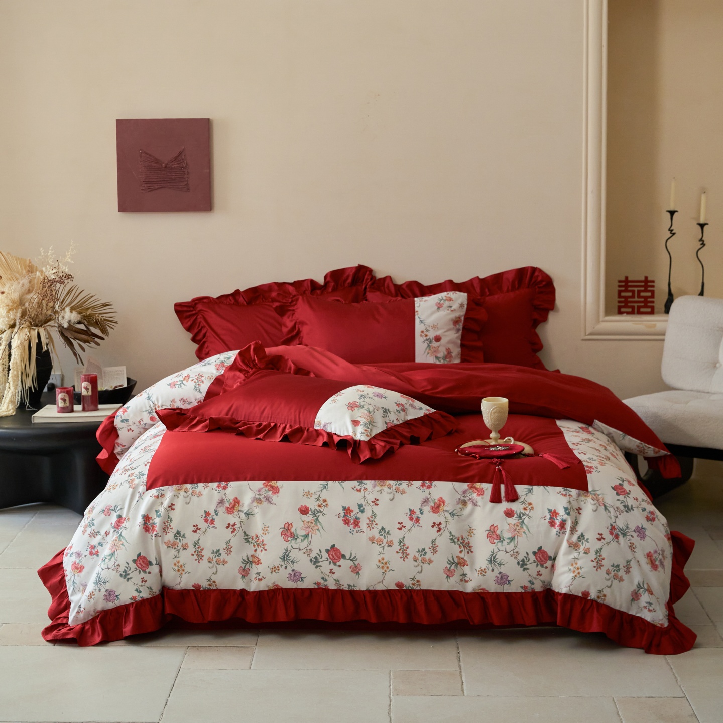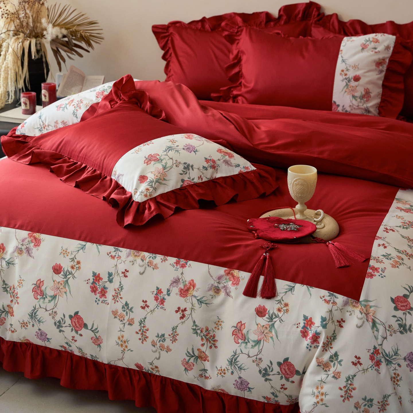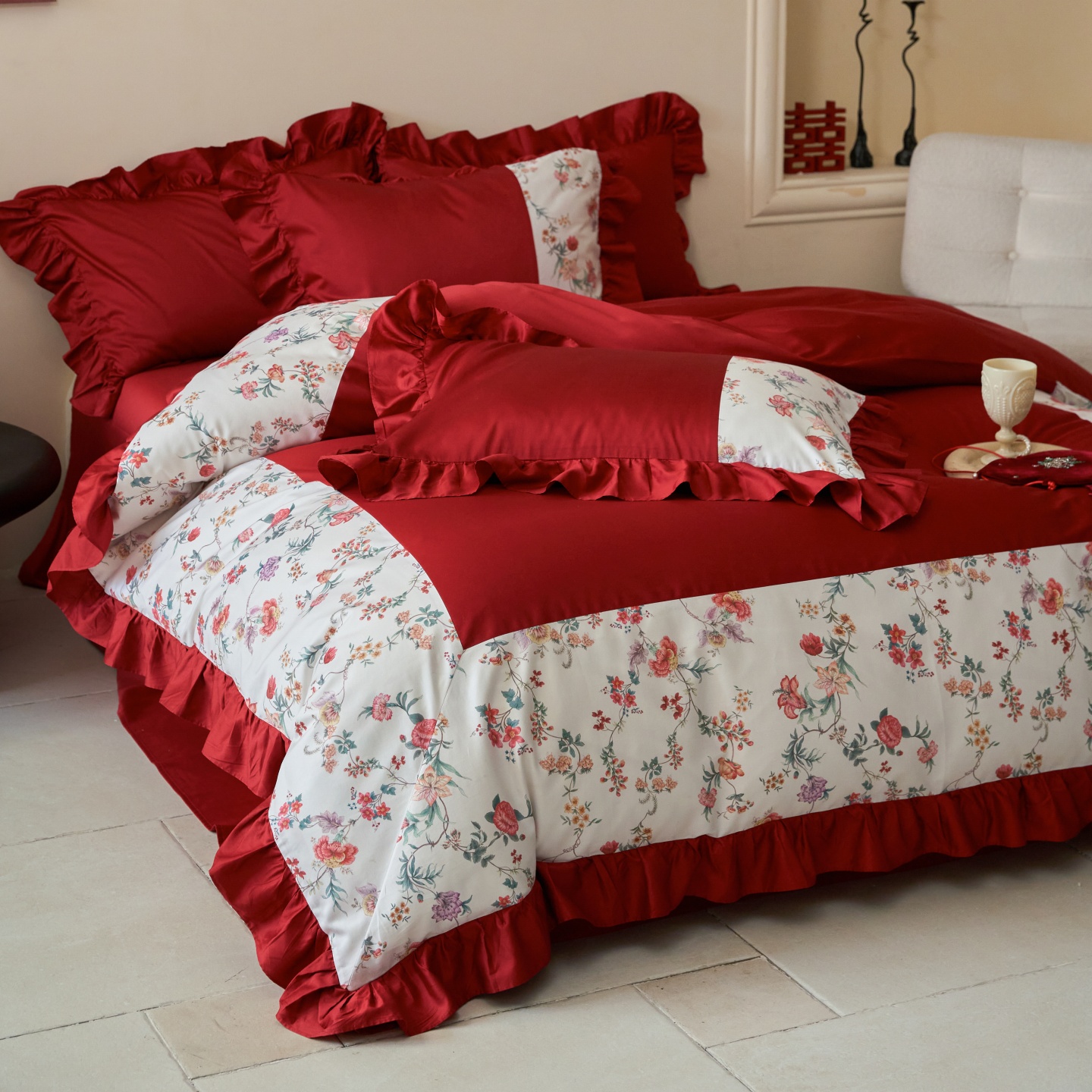 (总)优然居家纺 2025春夏新款木耳边喜字蝴蝶结小爱心复古红四件套-小欢喜,小欢喜