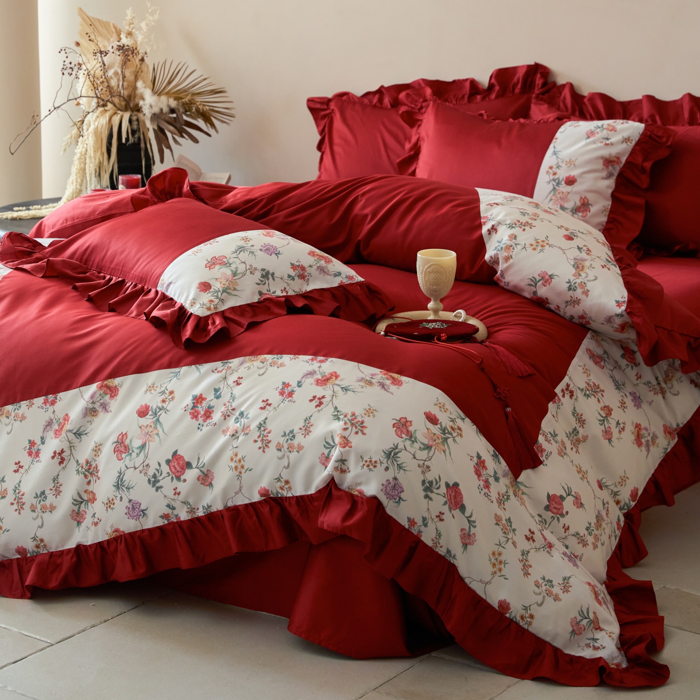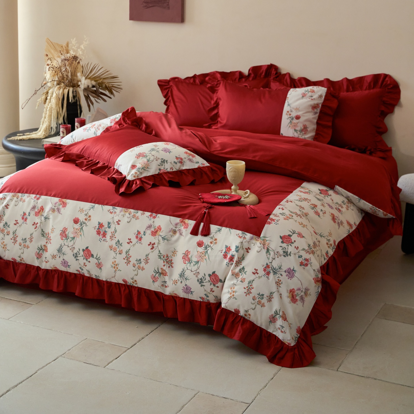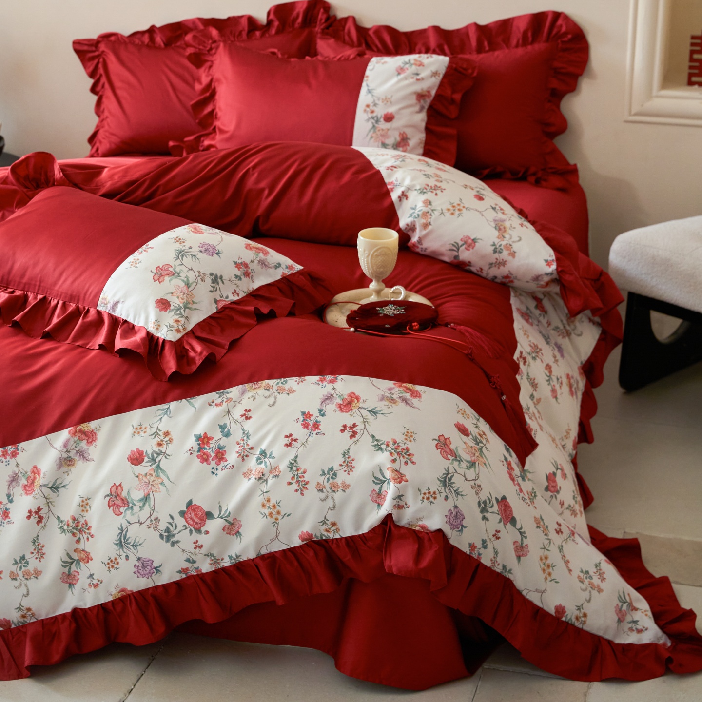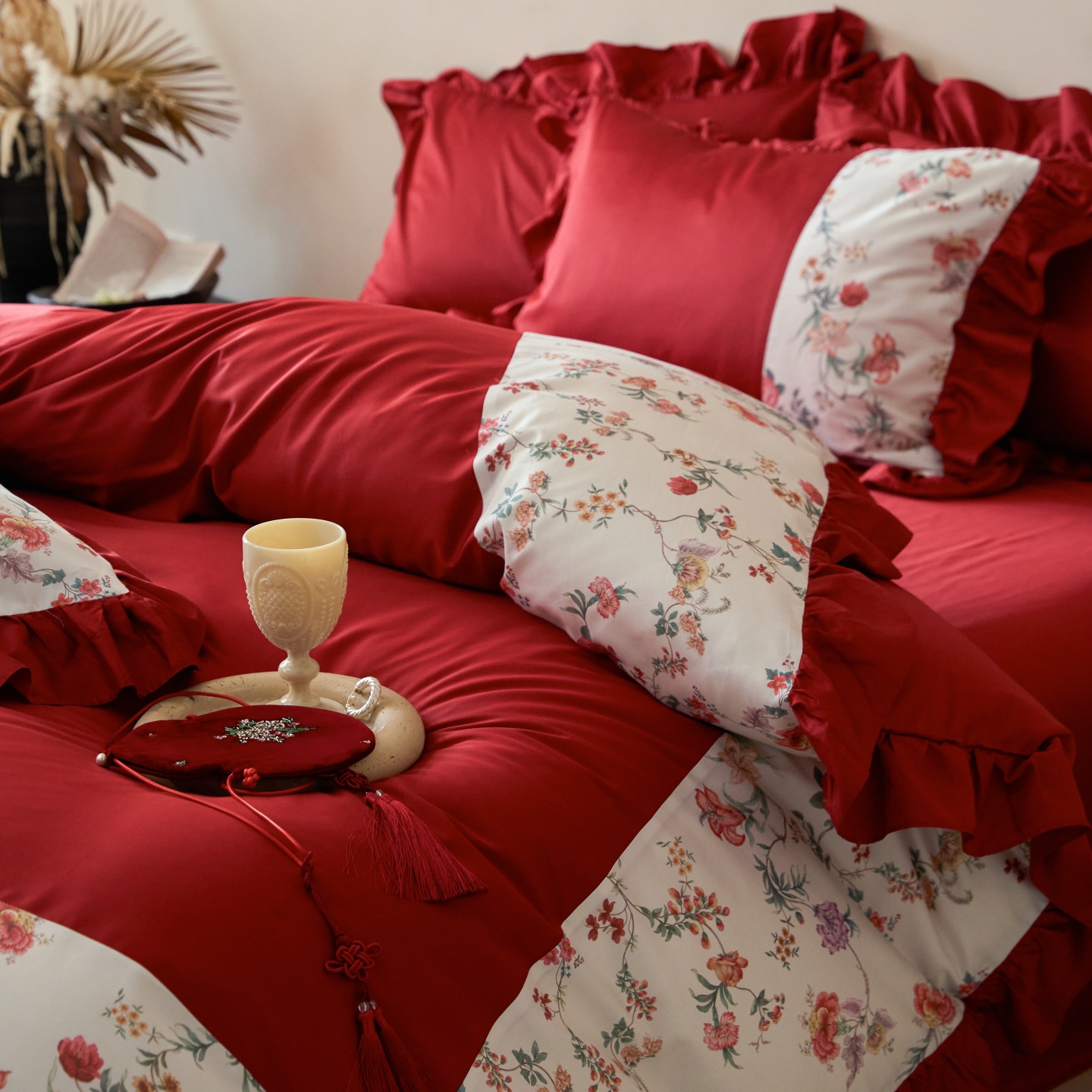 (总)优然居家纺 2025春夏新款木耳边喜字蝴蝶结小爱心复古红四件套-小欢喜,小欢喜