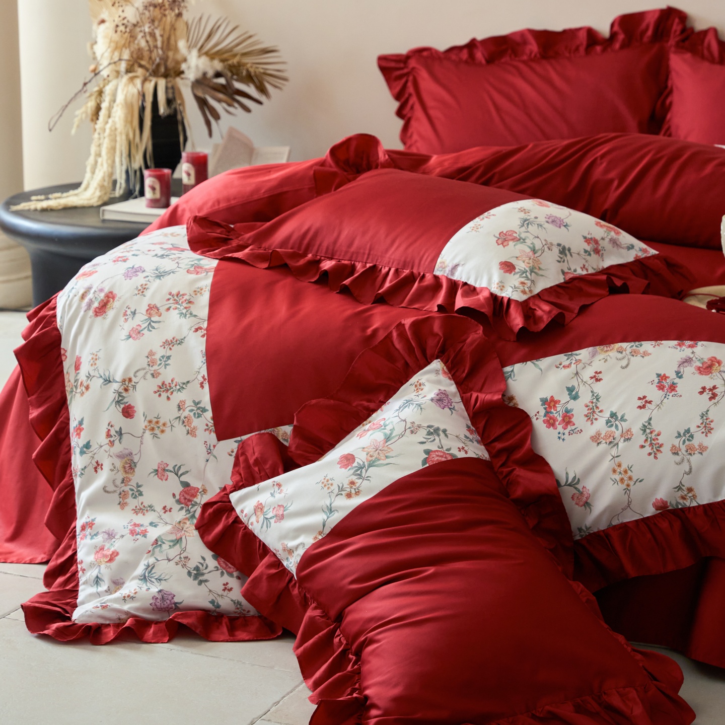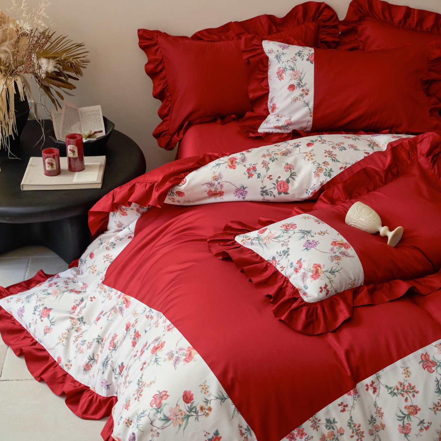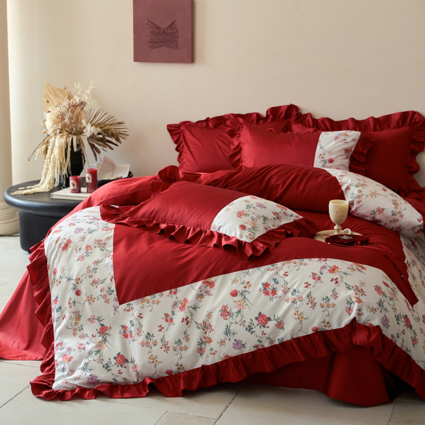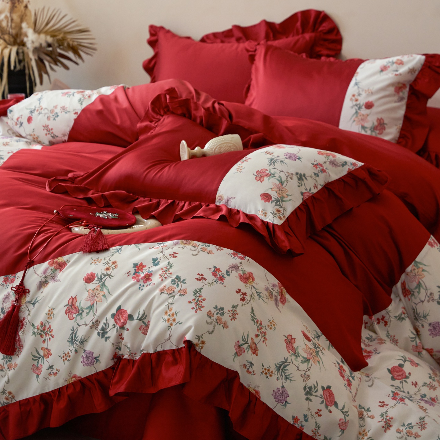(总)优然居家纺 2025春夏新款木耳边喜字蝴蝶结小爱心复古红四件套-小欢喜,小欢喜