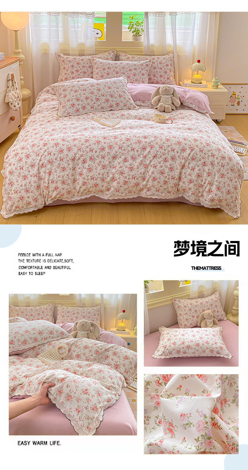 (总)豫见家纺 2026新款A类仿棉云感纱花边四件套,浪漫花叙,梦境之间,芊芊花海,碎花眠语,暗香,草莓多多,春风里,梵高印象,粉豹纹,狗狗家族,蝴蝶梦,琥珀流光,花漫漫,花影如梦,浪漫蔷薇,栗色木马纹,木马乐园,年华,日光漫游,赛琳娜,山茶左岸,线条表情狗,小鱼心事,雨沫蝴蝶结,紫色花野,紫藤花开