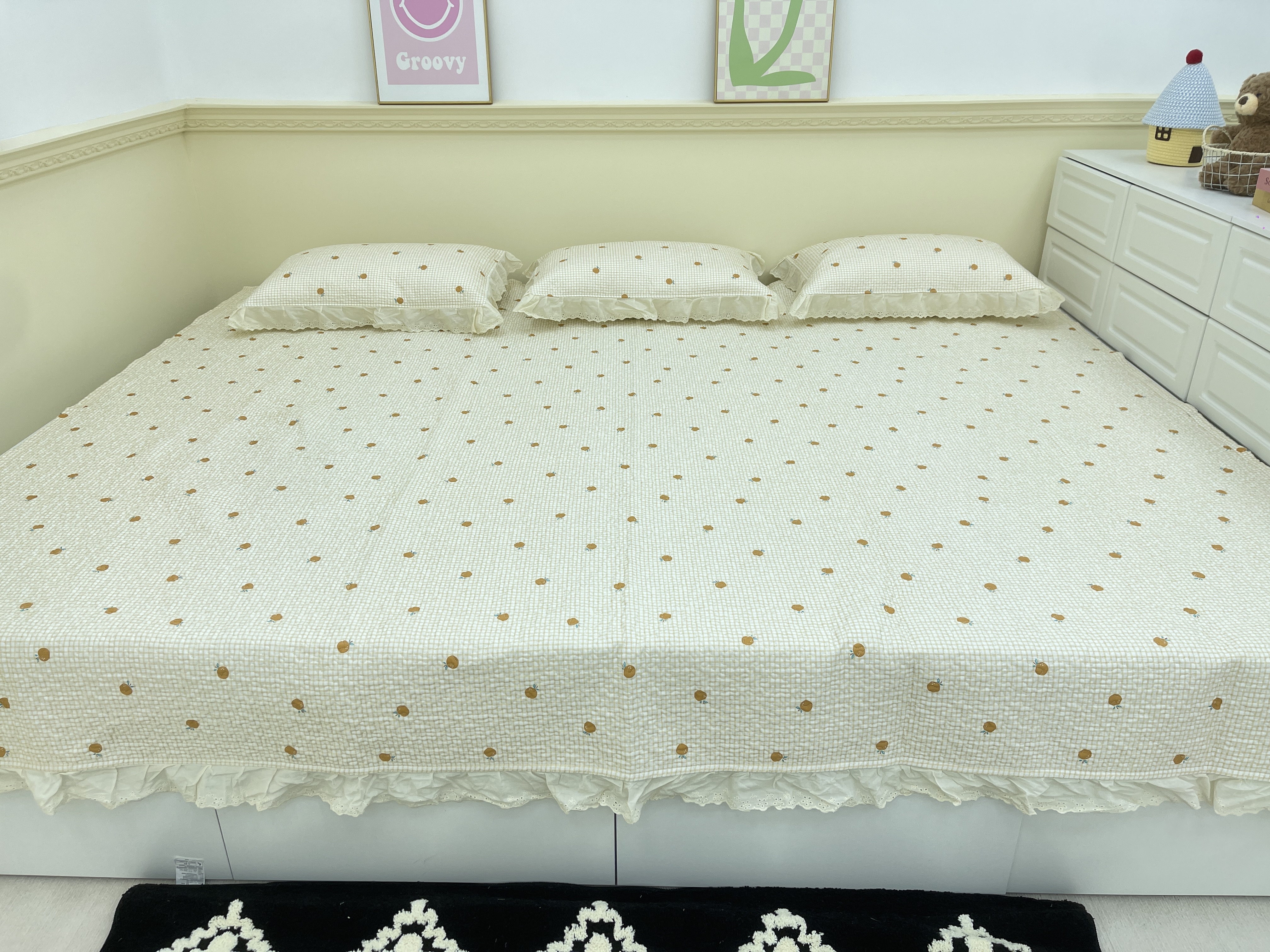 • 91家纺网 家纺一手货源 找家纺 (总)禧瑞谷 2026新款法式纯棉床盖韩版花边床盖三件套四件套,白底波点,草莓熊,粉底草莓,粉格子蝴蝶结,格调蓝色,格子蝴蝶结蓝色,海盐兔,可爱鹅,林间花叙,莓果点点,梦境,蜜橘奶盖,缪格子蝴蝶结,奶茶波点,奶油草莓,奶油小狗,七彩草莓,香香格子,小红果,小新一家,笑脸,心想柿成,星星人