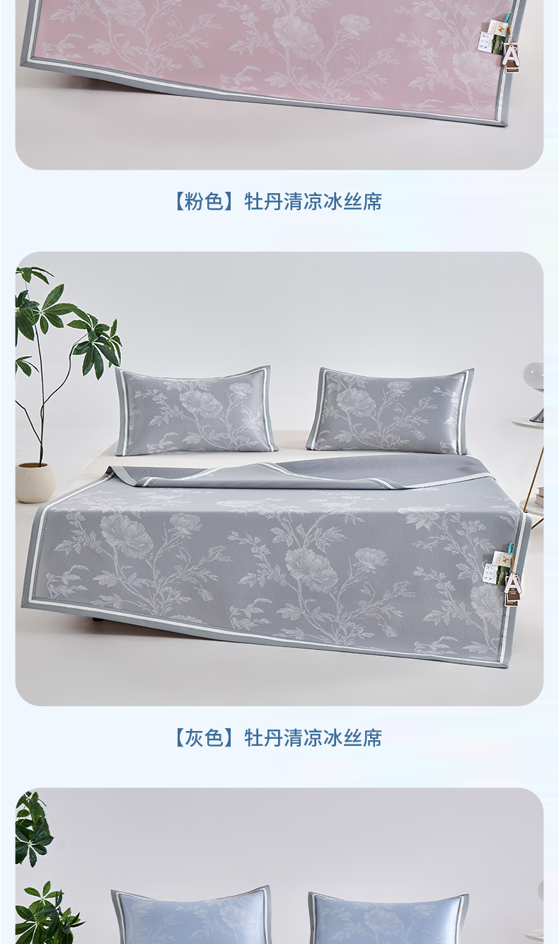 (总)小牛席业 2026新款牡丹清凉大提花冰丝席凉席席子,粉色,灰色,蓝色,香槟