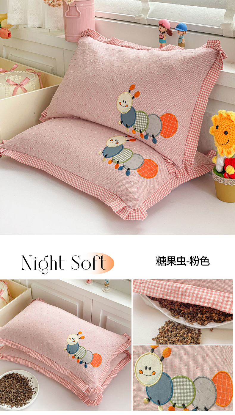 商品名称:梦叶草 2026新款全棉色织荞麦枕糖果虫荞麦枕枕头枕芯 糖果虫-粉色