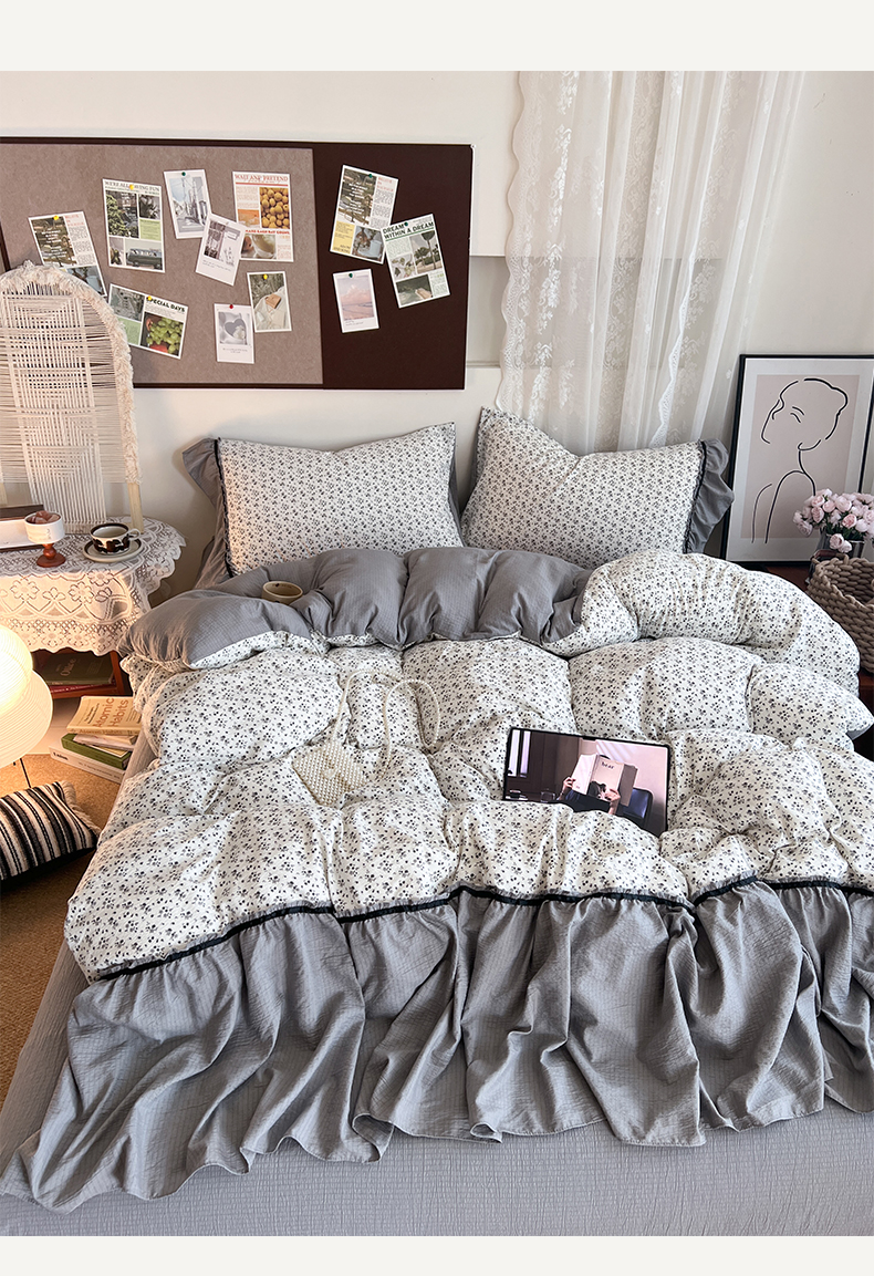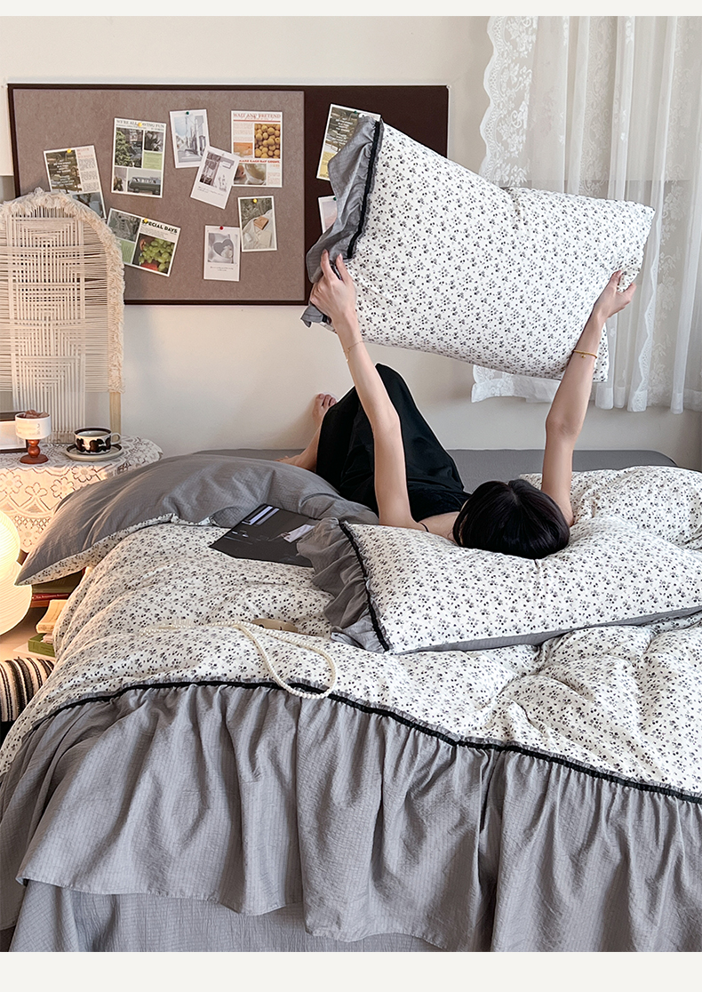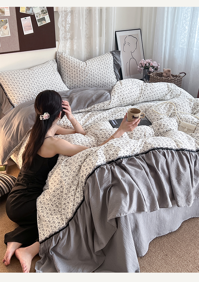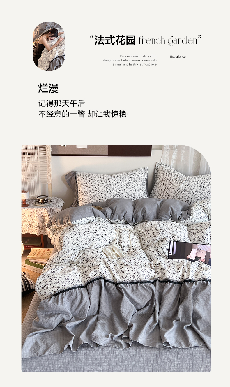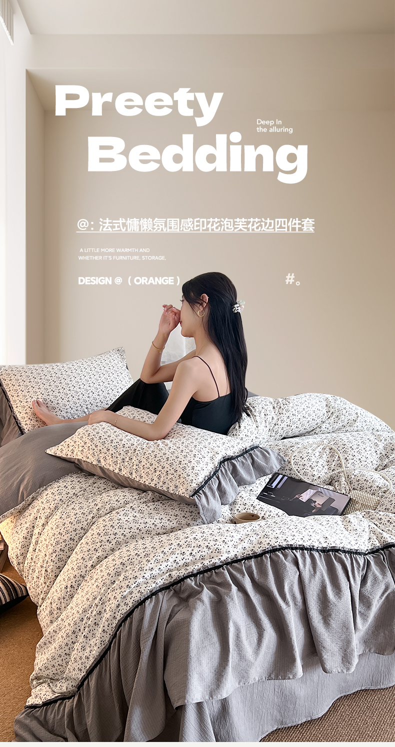 晨曦家纺 2026新款韩系法式慵懒氛围感印花泡芙花边四件套 雾灰庄园