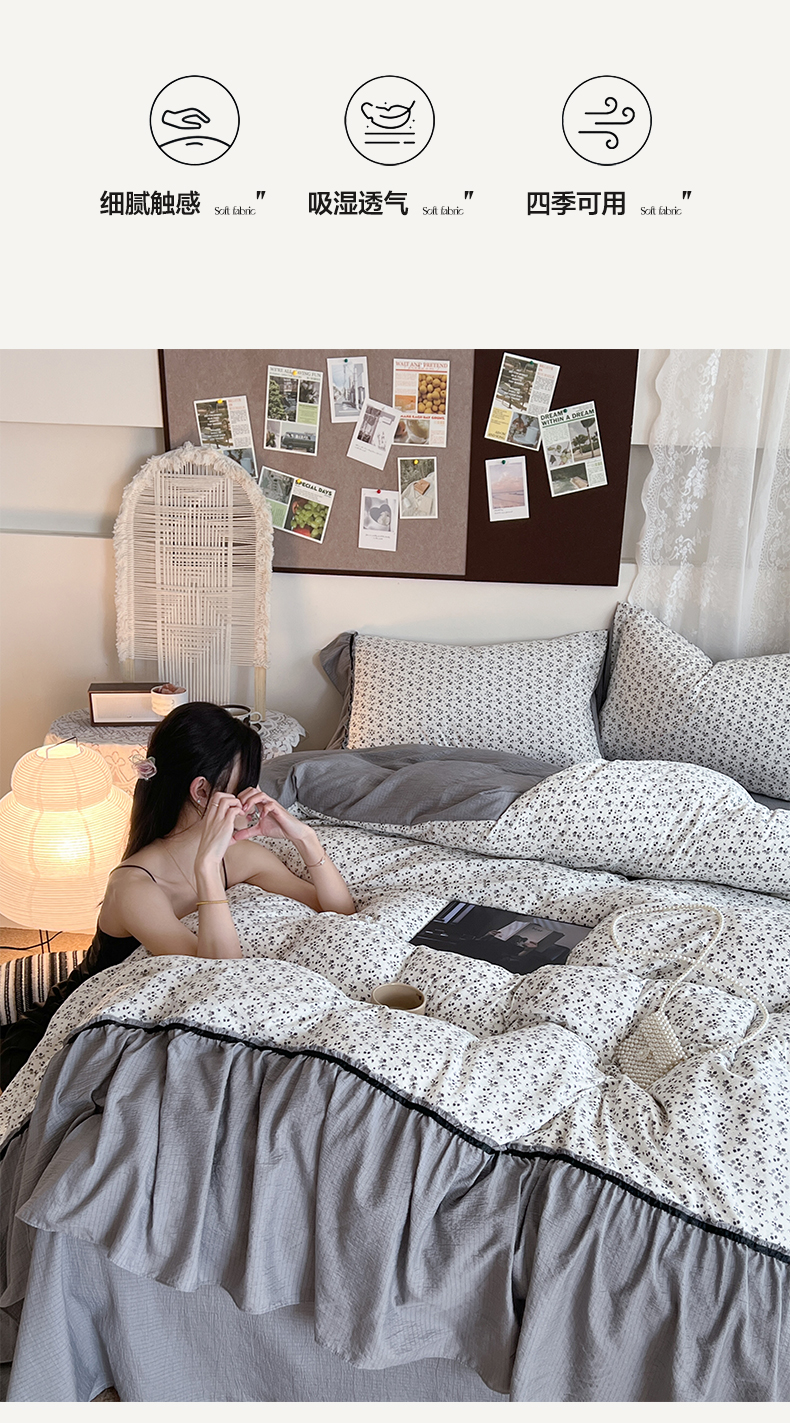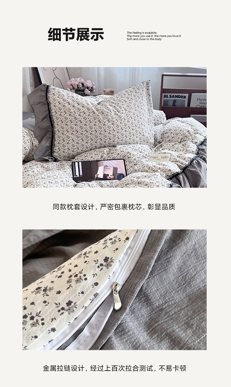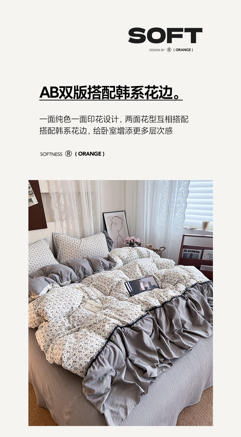 商品名称:晨曦家纺 2026新款韩系法式慵懒氛围感印花泡芙花边四件套 雾灰庄园