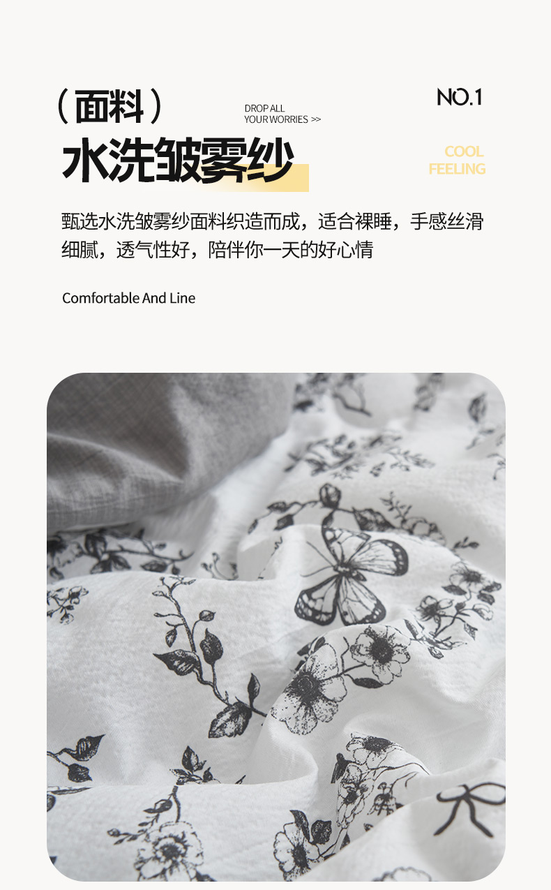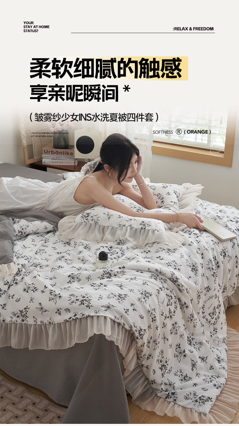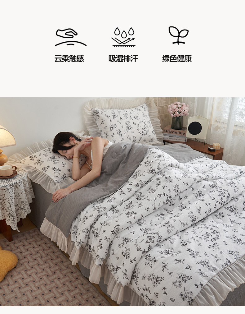 当前位置: 91家纺网 > 商品网购 > 床品套件 > 四件套 > 夏被四件套 > 晨曦家纺 2026新款皱雾纱水洗夏凉被夏被四件套少女ins风韩版 素墨蝶语