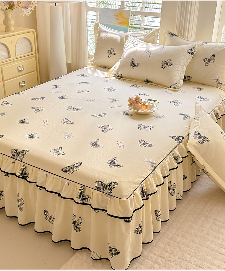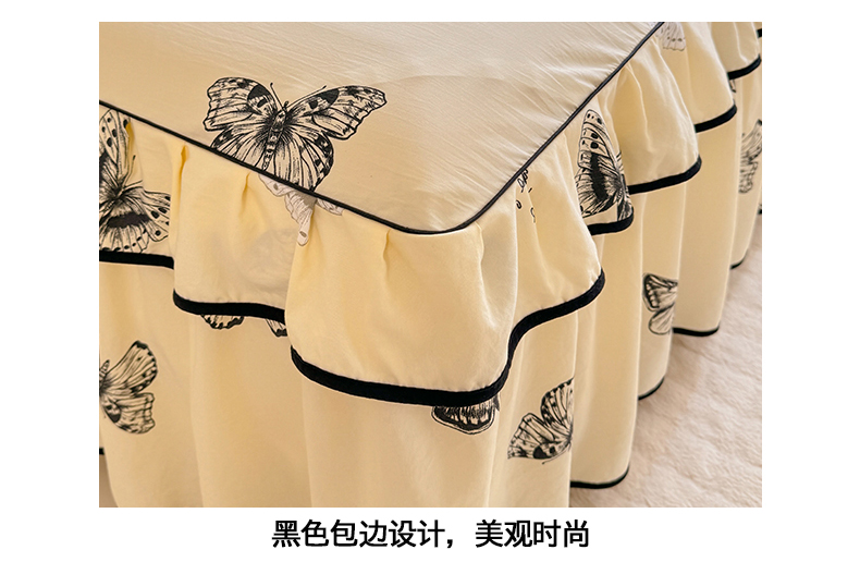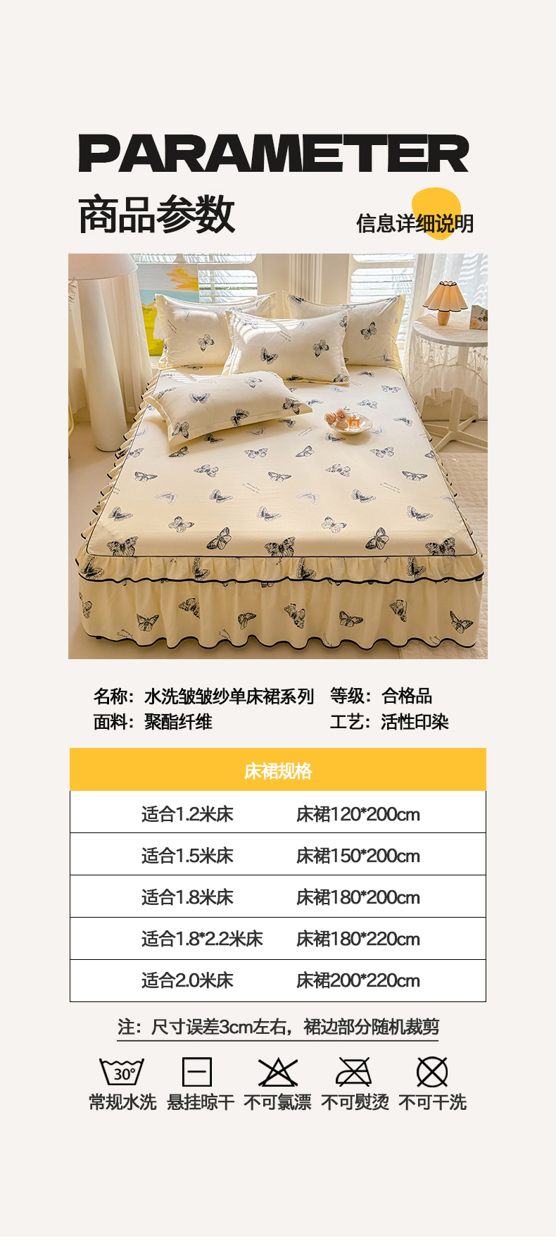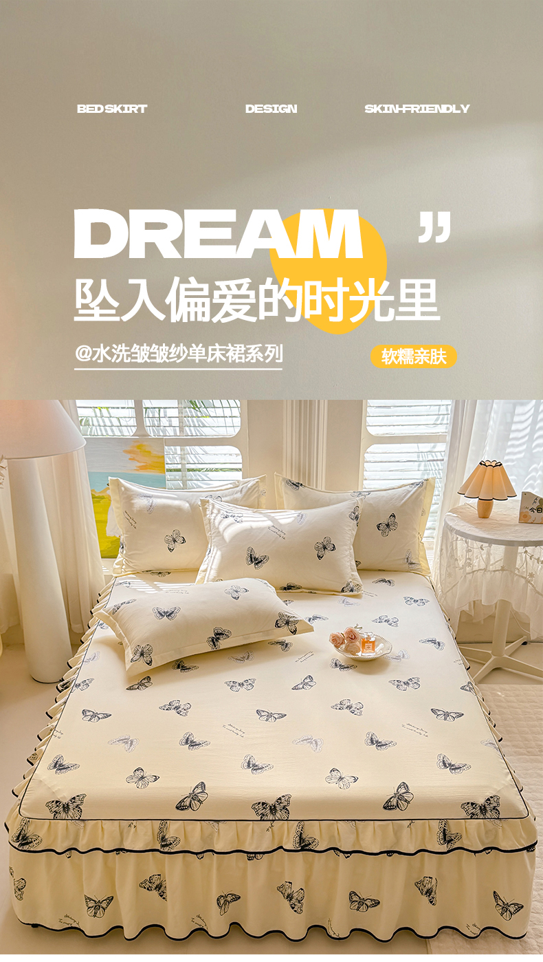 • 91家纺网 家纺一手货源 找家纺 优家居 2026新款A类水洗棉床裙单件三件套皱皱纱韩版公主风花边床罩直播爆款外贸定制 蝶舞芳华