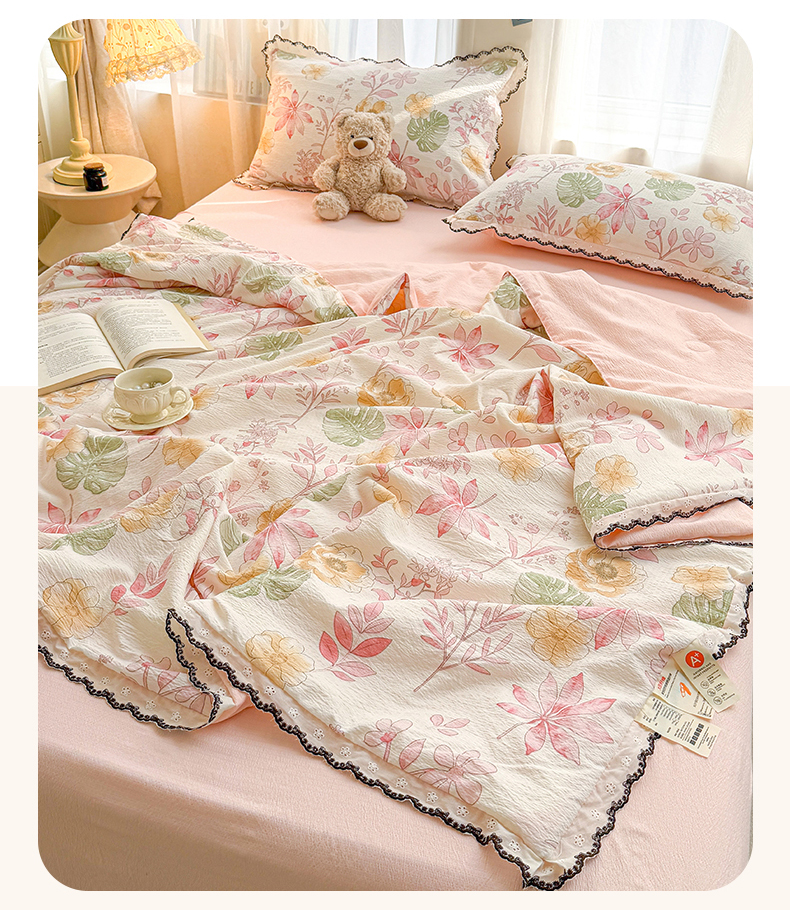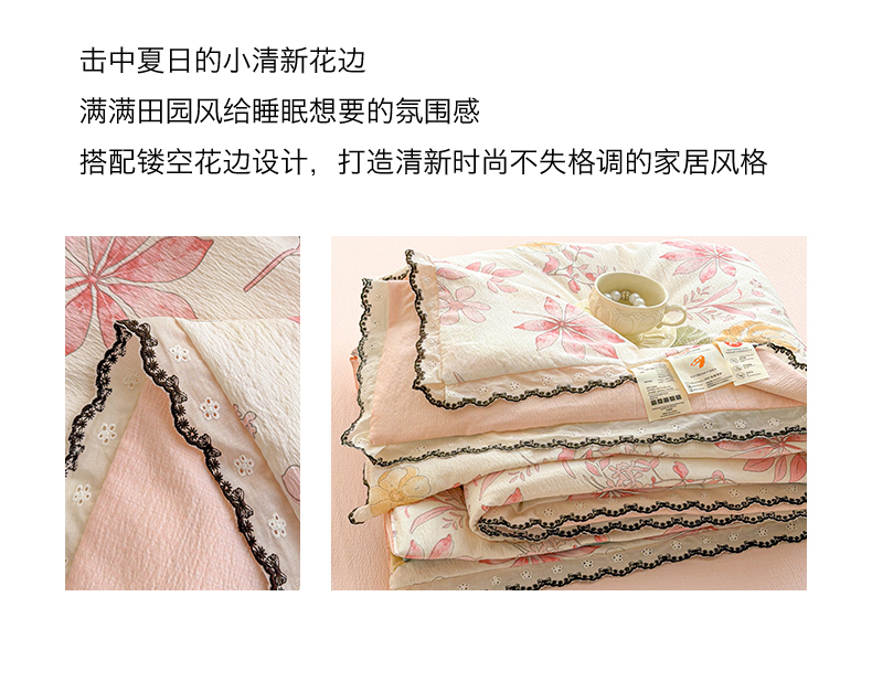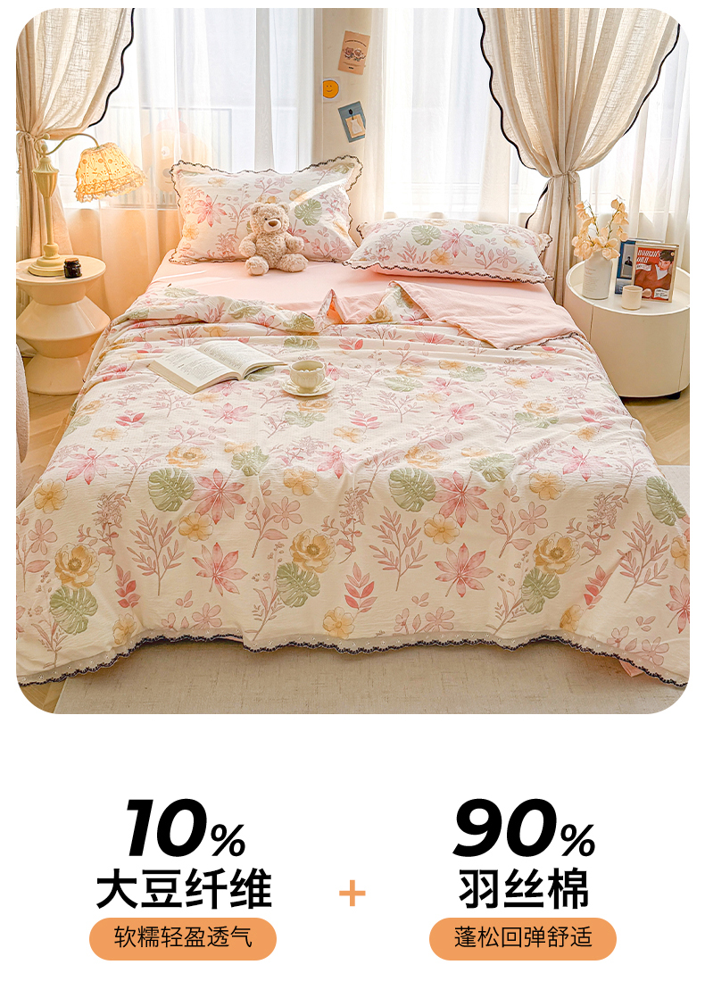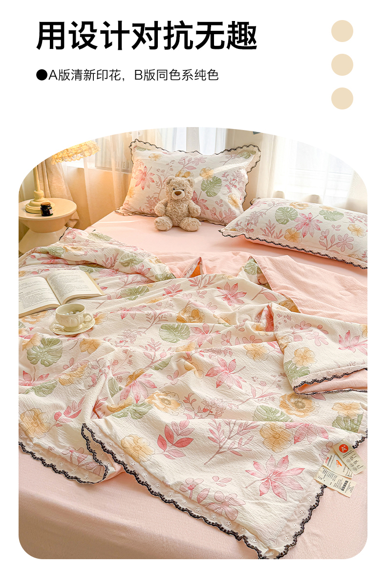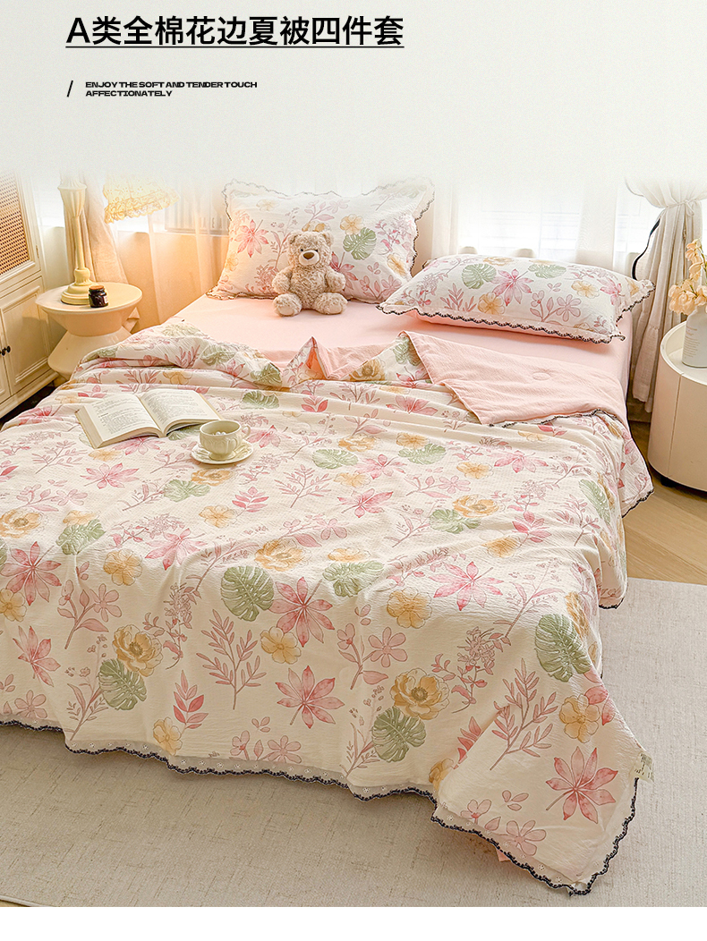 • 91家纺网 家纺一手货源 找家纺 招财星家纺 2026新款A类全棉花边云感双层纱大豆纤维夏被四件套夏被夏凉被空调被(带质检报告买家秀) 花边款-缤纷花朵