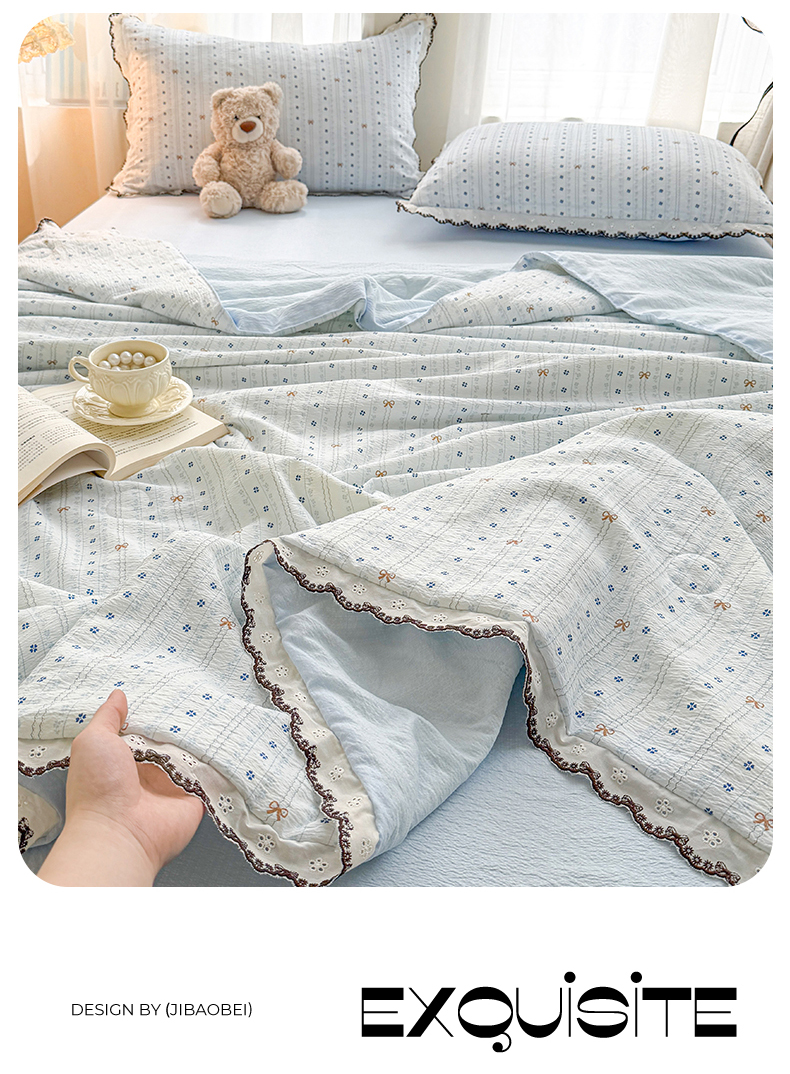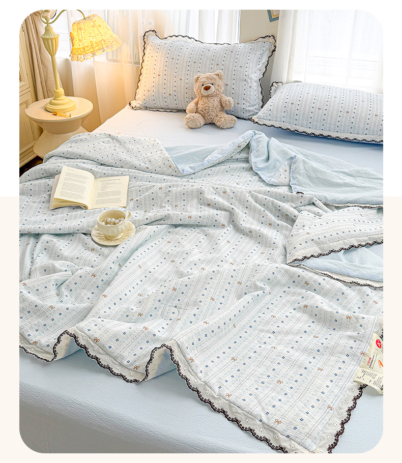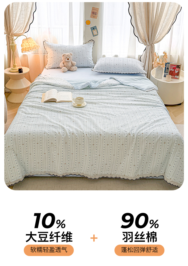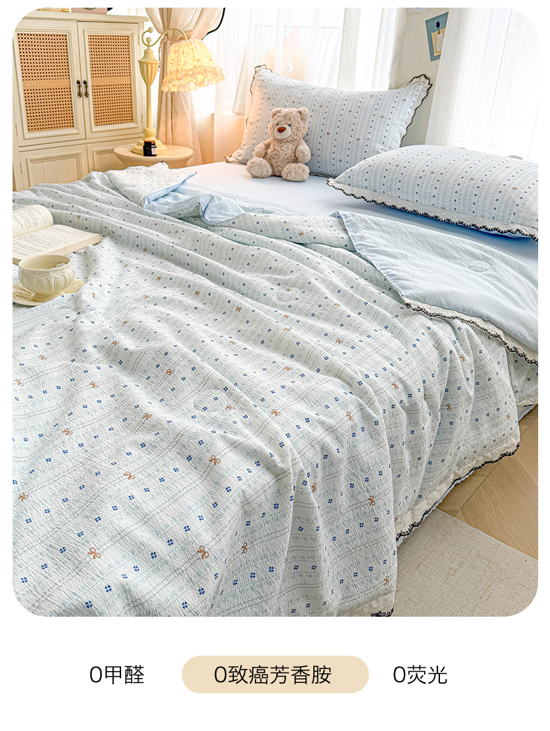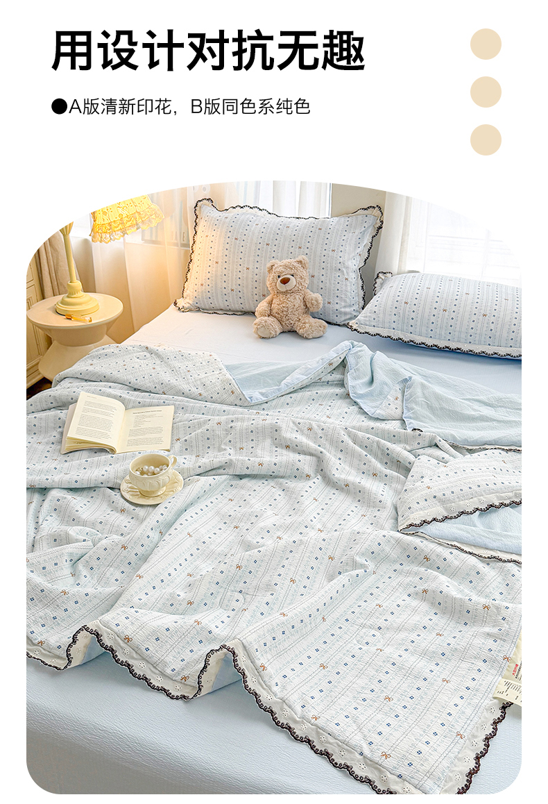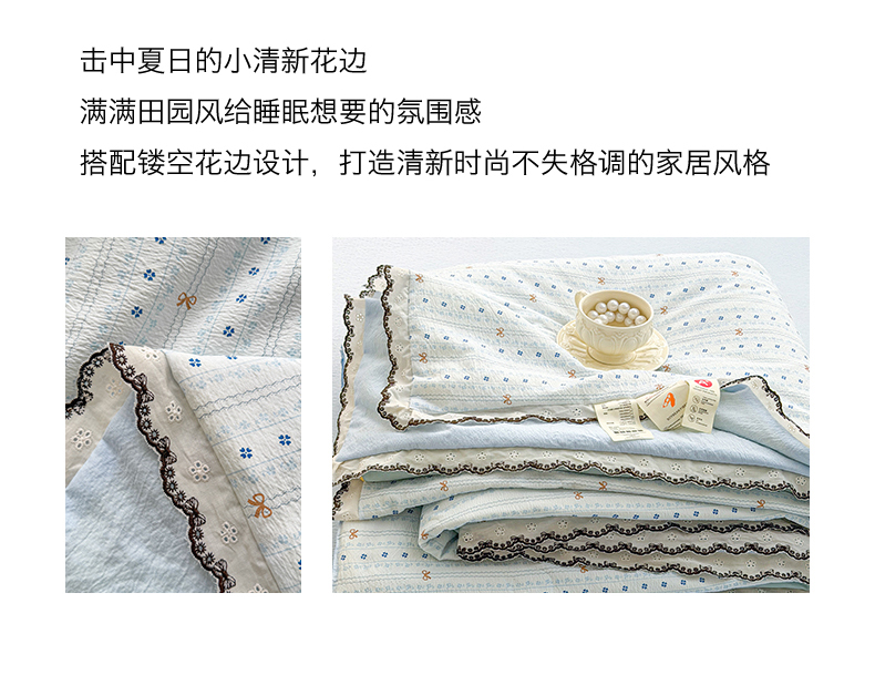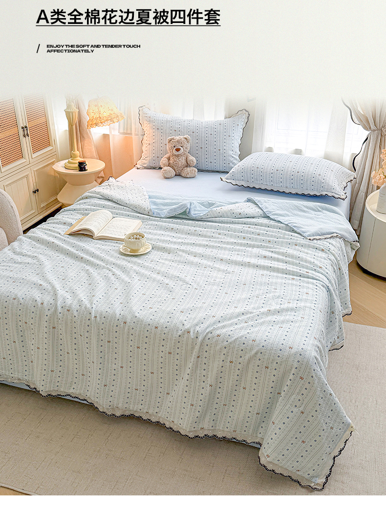 招财星家纺 2026新款A类全棉花边云感双层纱大豆纤维夏被四件套夏被夏凉被空调被(带质检报告买家秀) 花边款-幸运结-蓝
