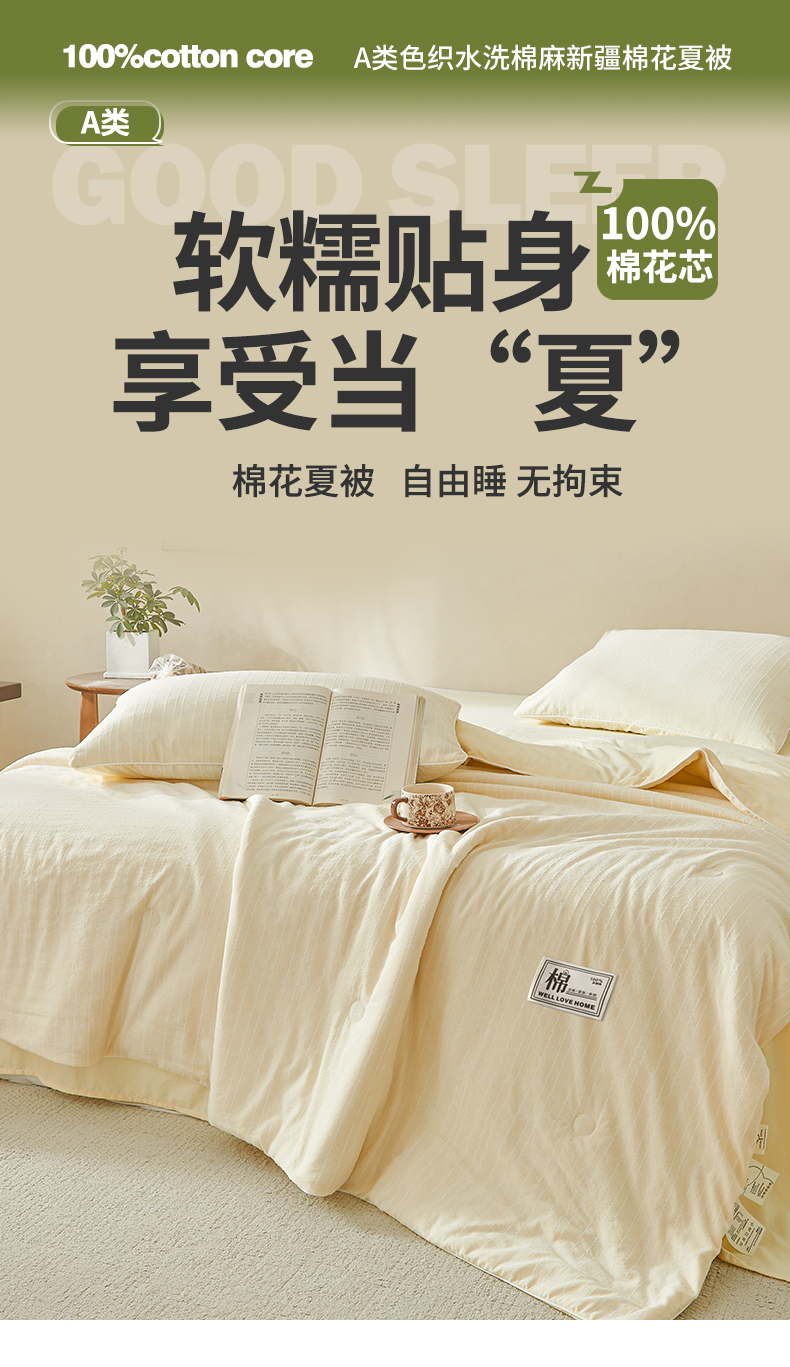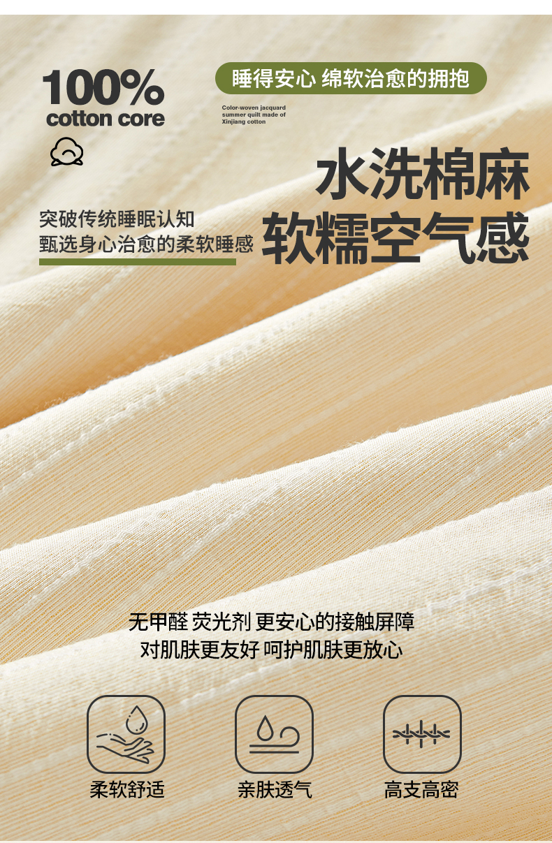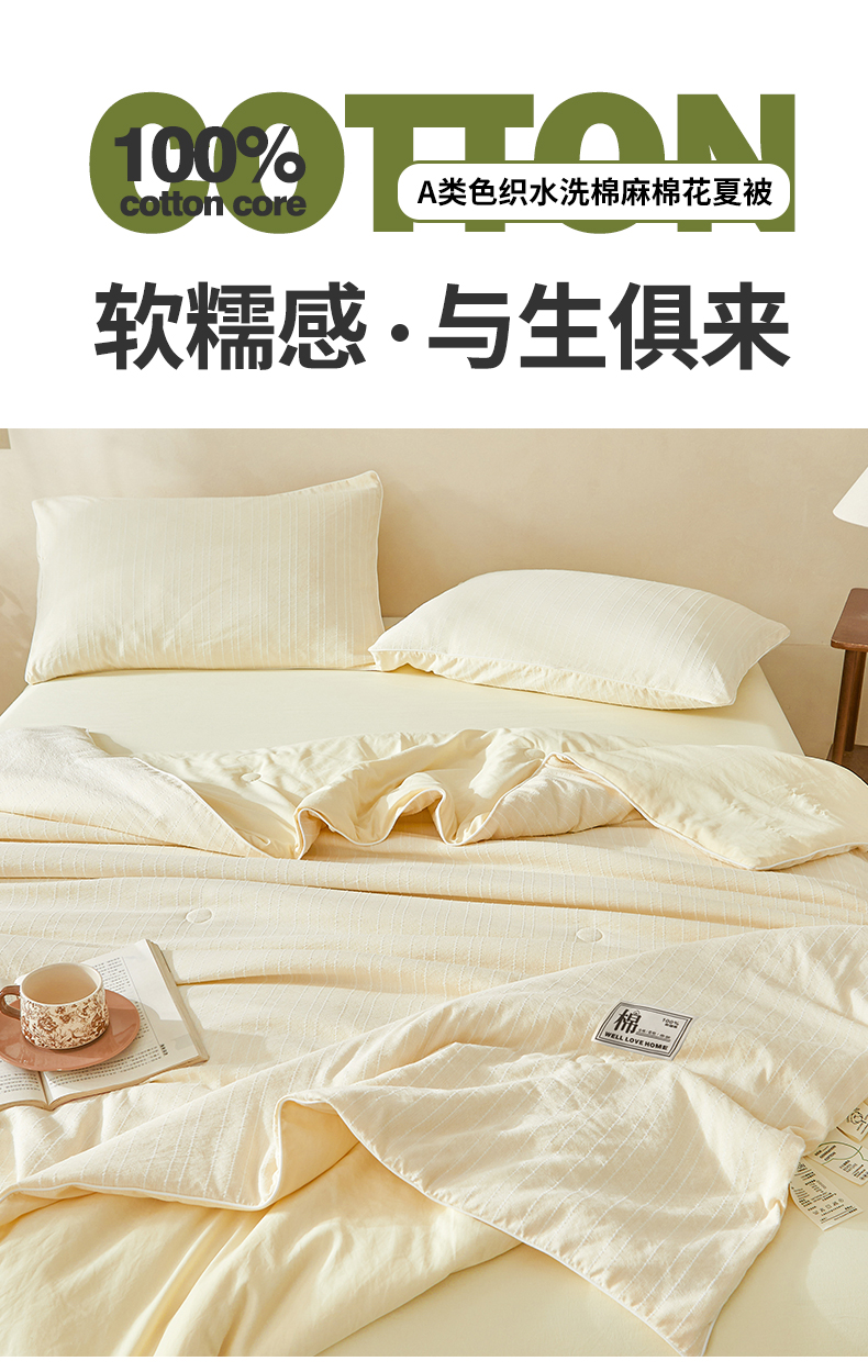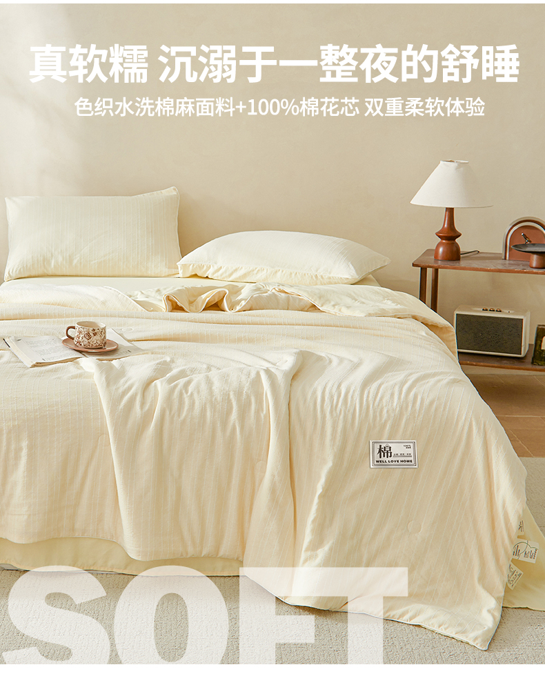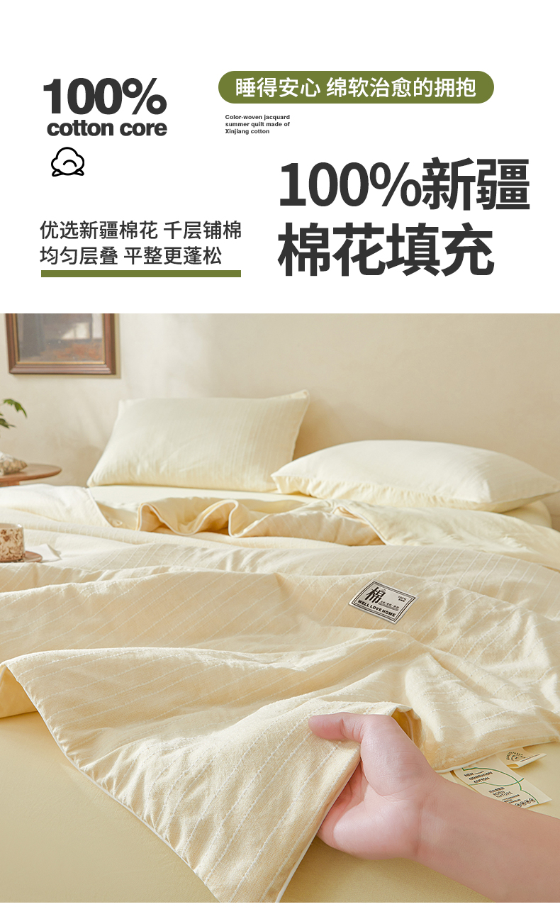 晓时候 2026新款色织水洗棉麻100%新疆棉花被夏被全棉被子夏凉被空调被 奶芙黄