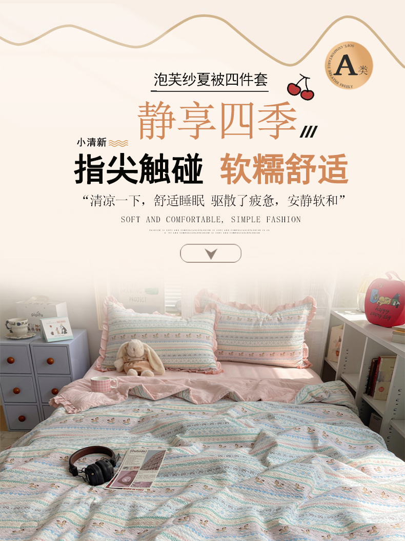 (总)迪梦姿家纺 2026新款高克重泡芙纱泡泡纱床盖款四件套系列,紫雾花蝶集,灰樱桃,春日甜桃心米,纯宅熊,猫咪集粉,躲猫猫,花野兔眠,旧街星星,莓系花伐,描线小猫咖,木马小花团,浅沙花影黄,浅沙花影蓝,田园兔,甜喵块块,甜心咖絮,甜心木马卷,兔仔花田,小兔裙边,星野蝴蝶结,悦悦小兔,只闻花香