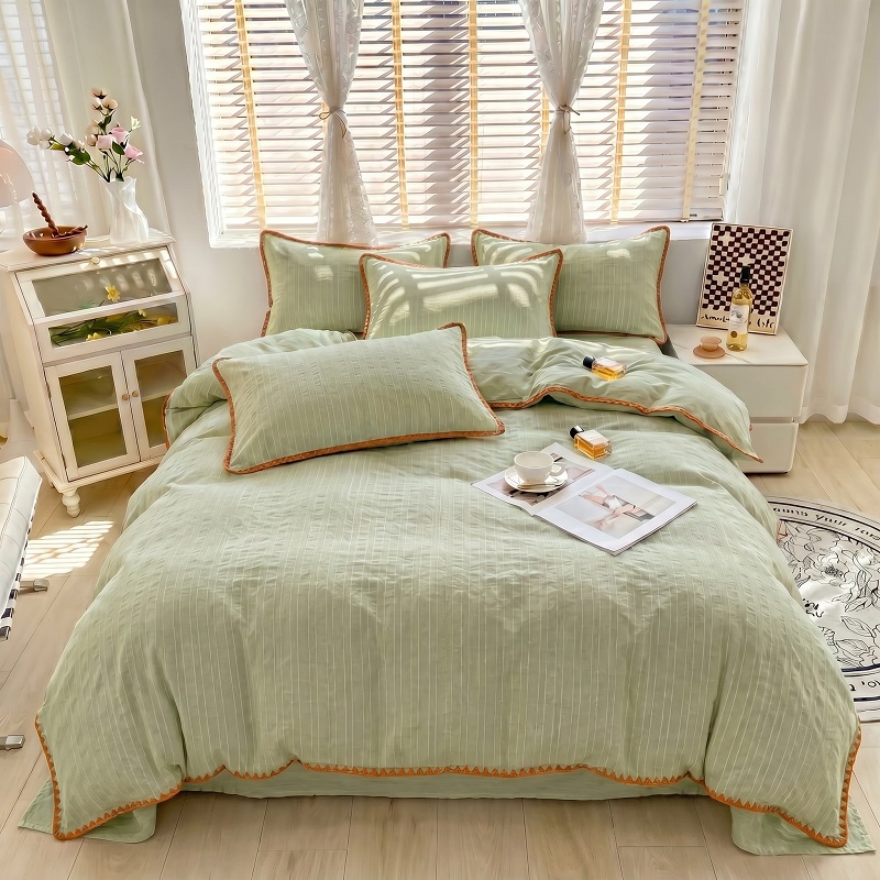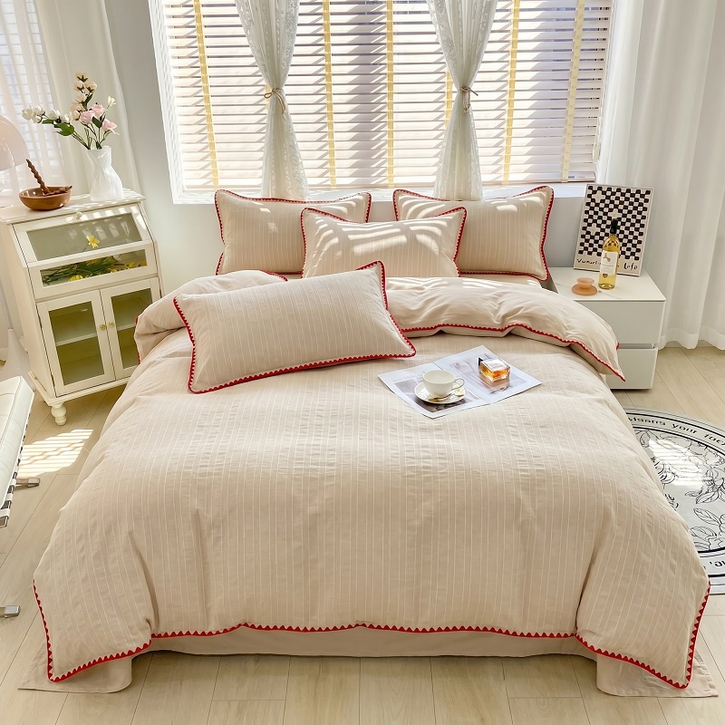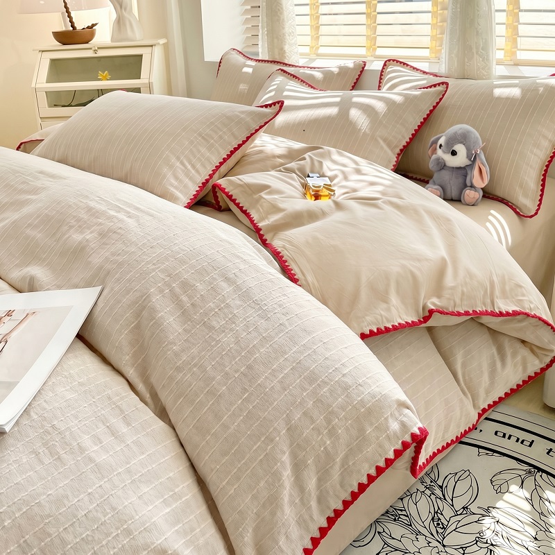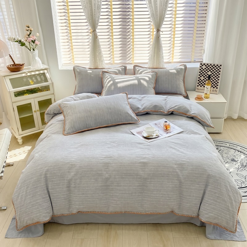 当前位置: 91家纺网 > 商品网购 > 床品套件 > 四件套 > 化纤普通四件套 > 韩秀家纺 2026新款阳离子贝壳绣四件套亚麻风双层纱色织提花四件套 可可奶咖