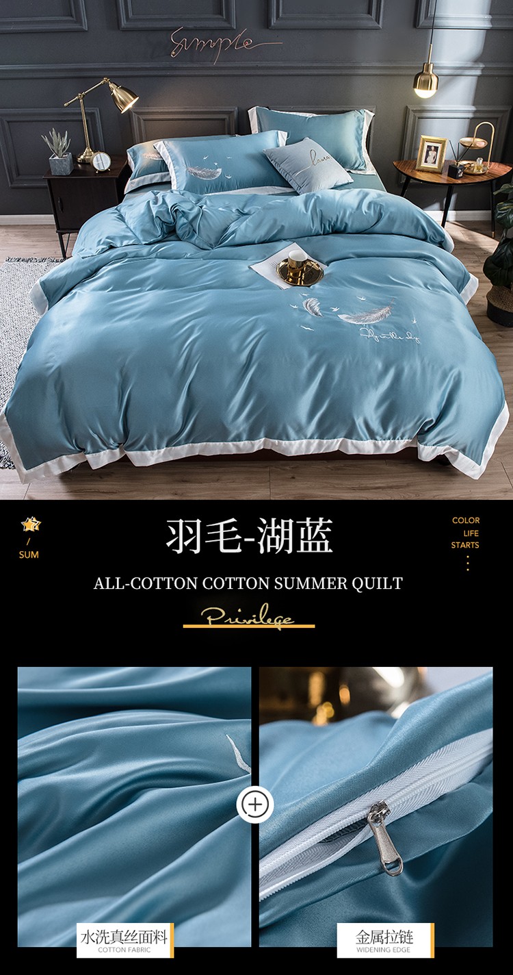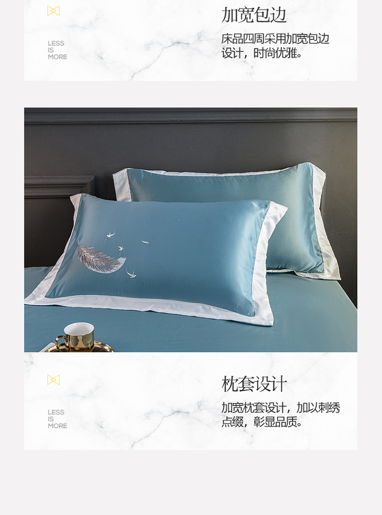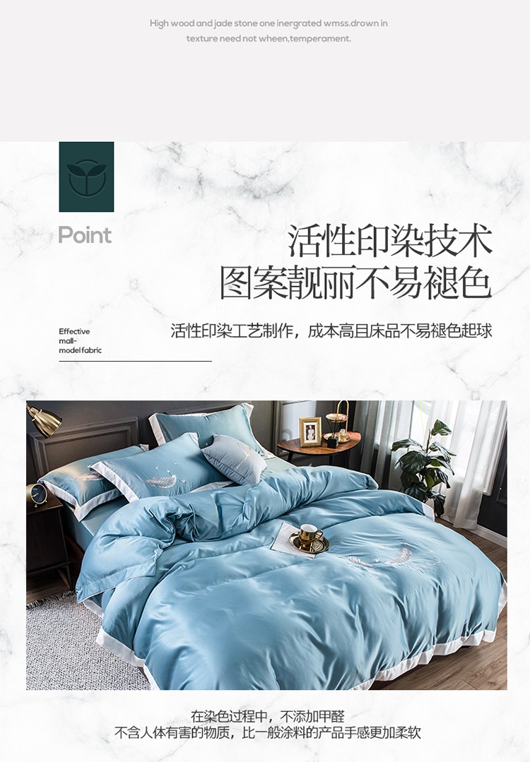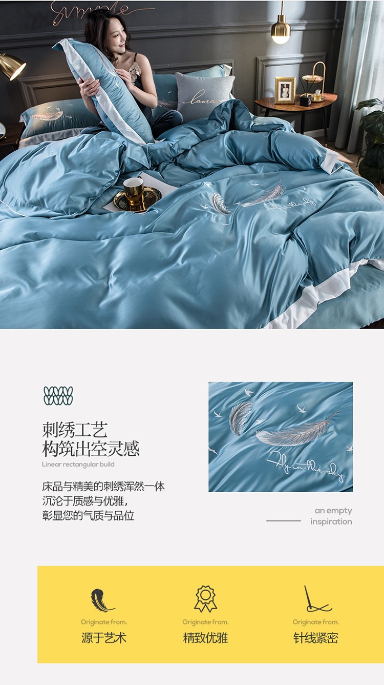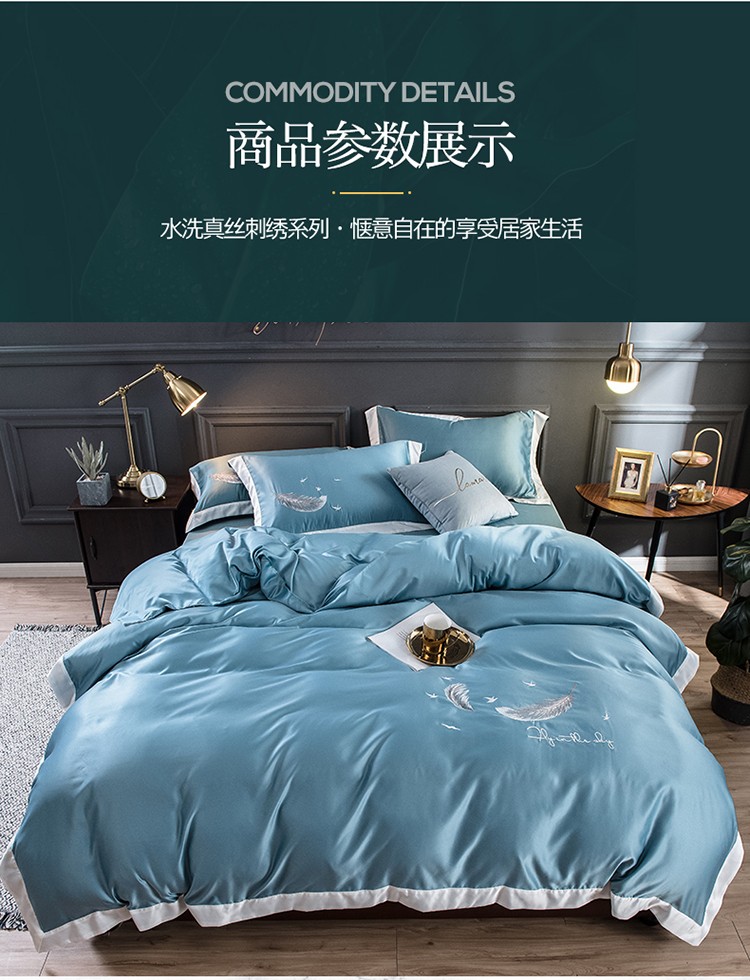 商品名称:骏腾 2022新款纯色水洗真丝刺绣四件套 羽毛-湖蓝