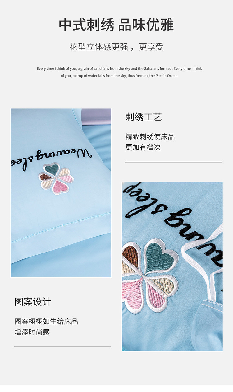 U品汇 2021春夏新品60s长绒棉绣花全棉刺绣四件套四叶草 蒂芙尼蓝