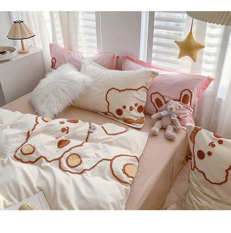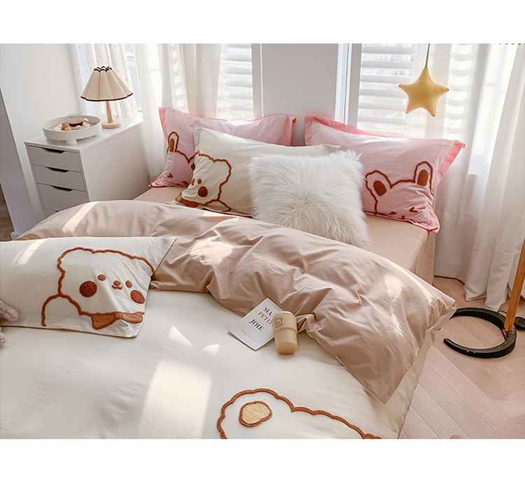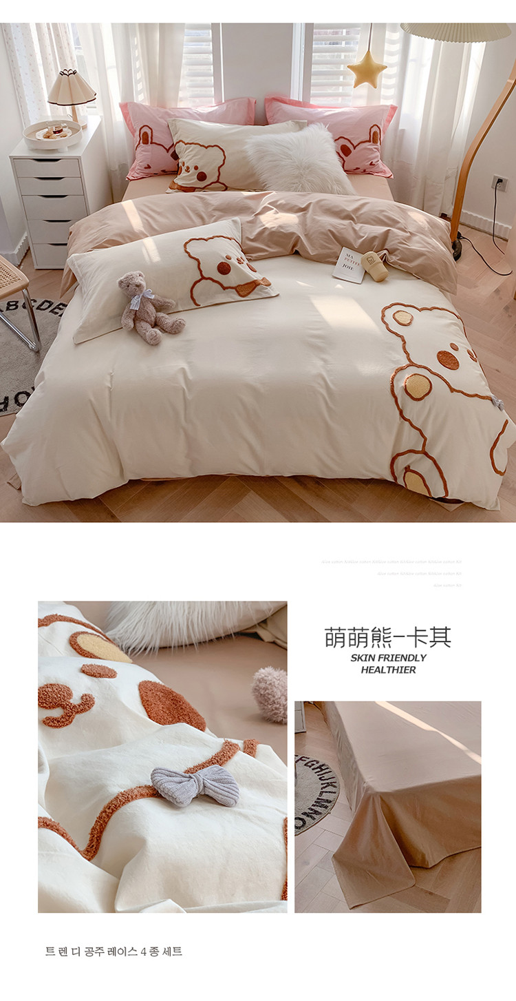 蜜柚2021全棉水洗棉卡通毛巾绣小清新床单四件套萌萌熊-卡其