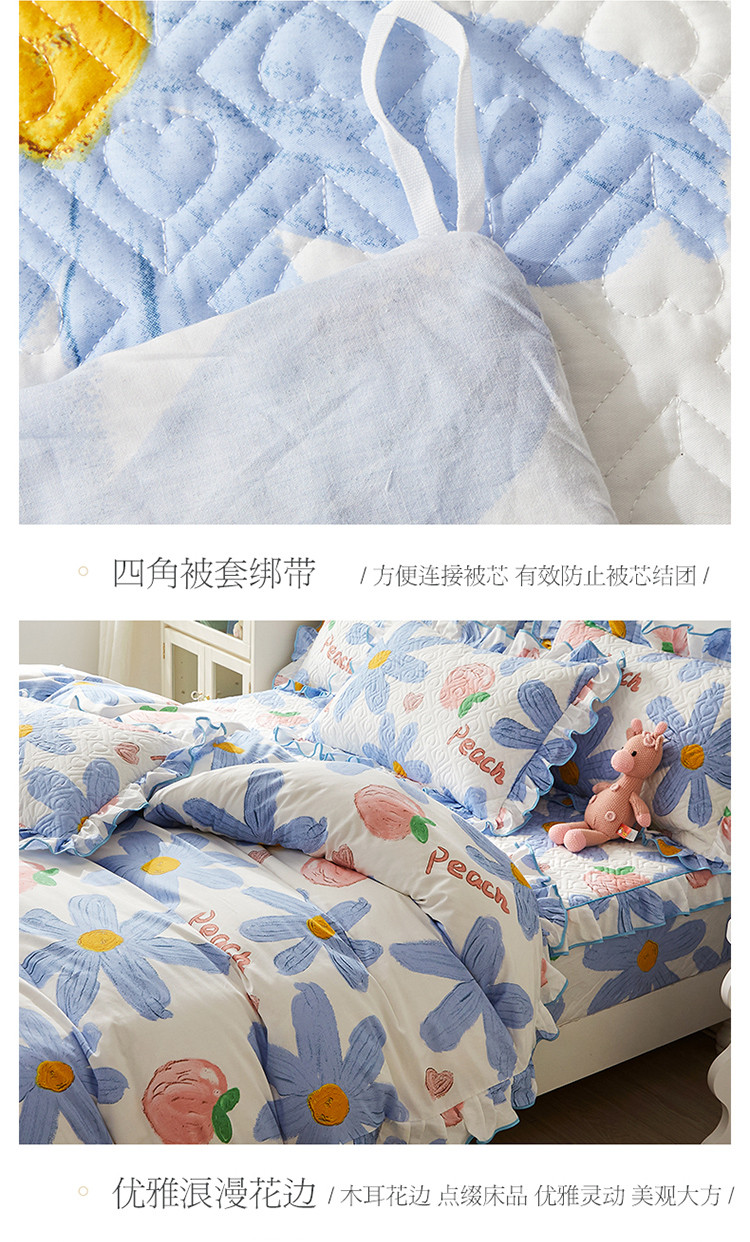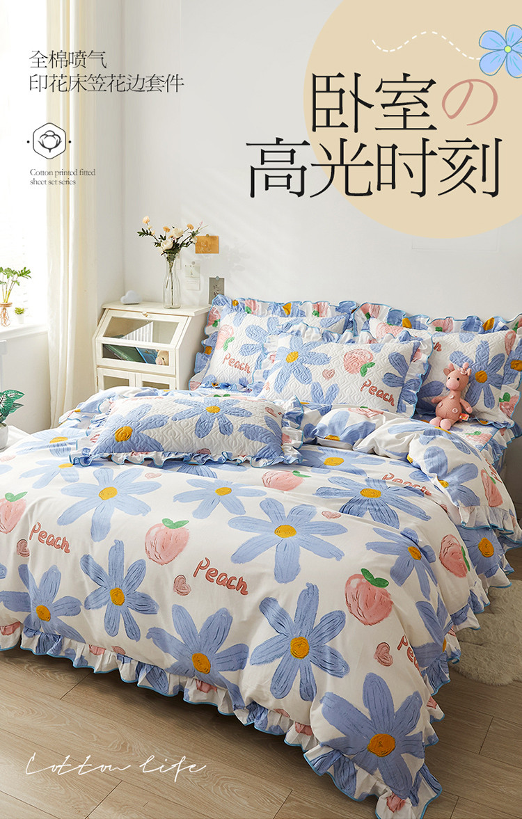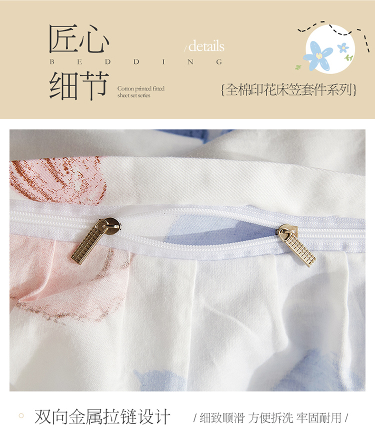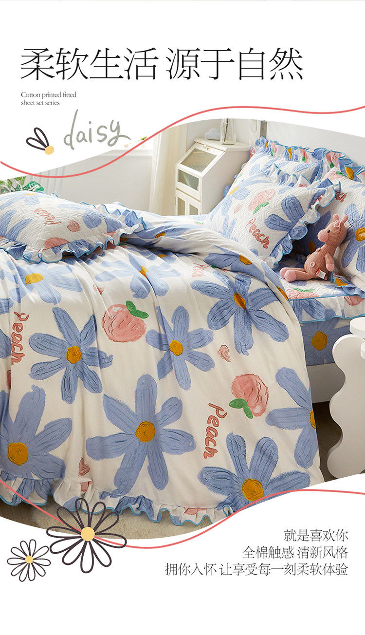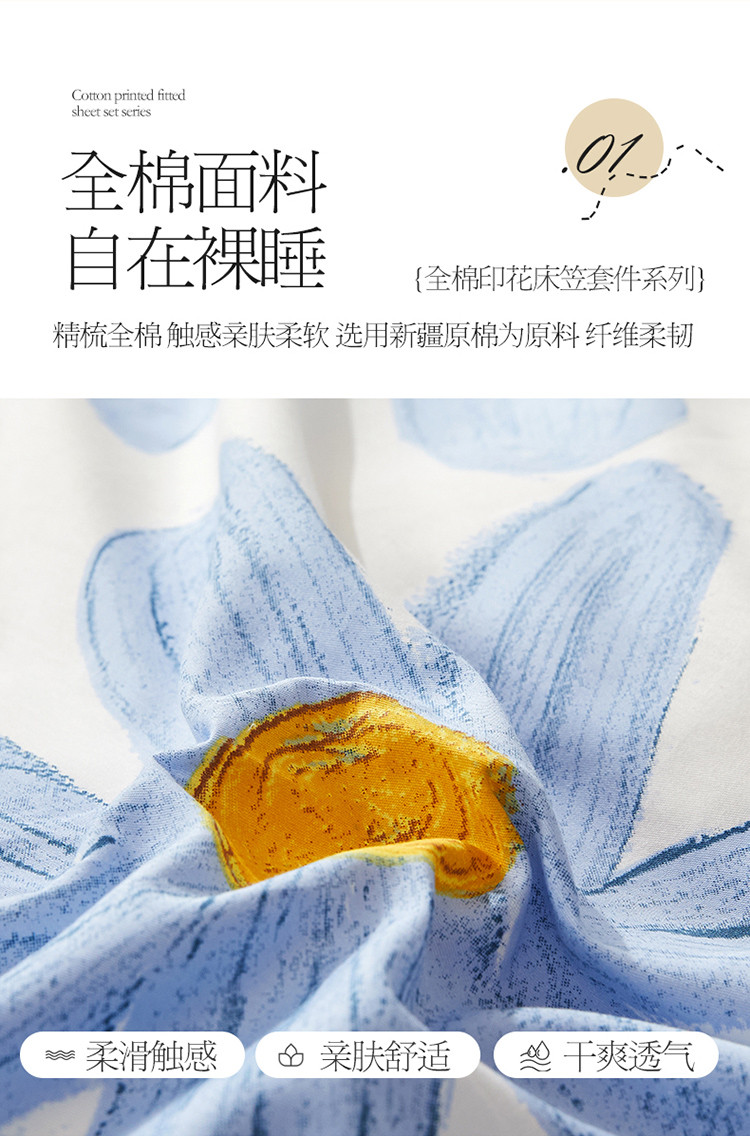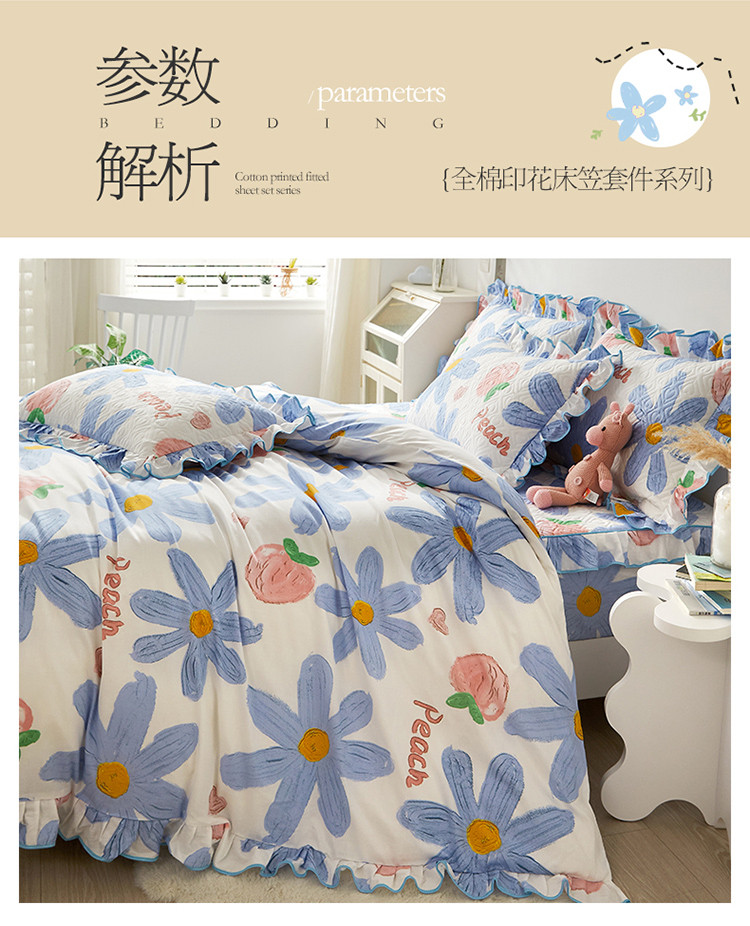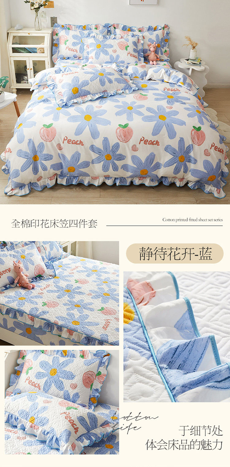 当前位置: 91家纺网 > 商品网购 > 床品套件 > 四件套 > 全棉普通四件套 > 宜凡家纺 2023新款全棉印花花边床笠款四件套 静待花开蓝