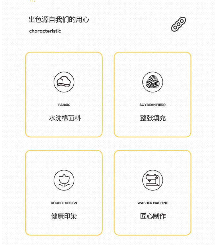 • 填充纤维种类: 大豆蛋白改性聚酯纤维