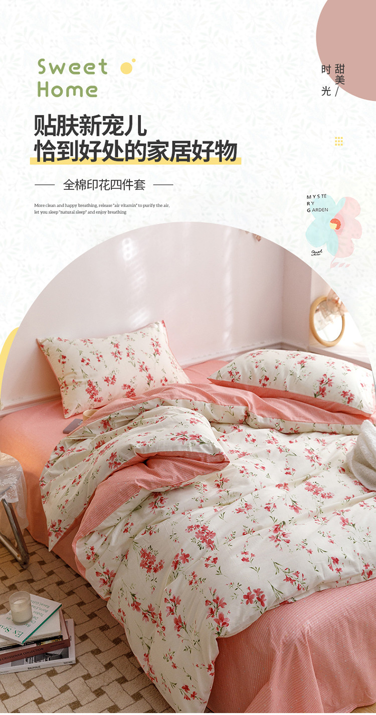 (总)沐棉家居 2025新款全棉印花四件套,安娜花园,春风慕颜,春色满园,淡香花语,蝴蝶结,花梦,可爱熊猫,露丝,嘻嘻兔,幸福小兔,优雅花朵,紫花小羊,紫藤蔓蔓