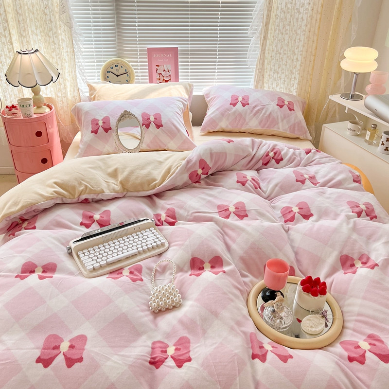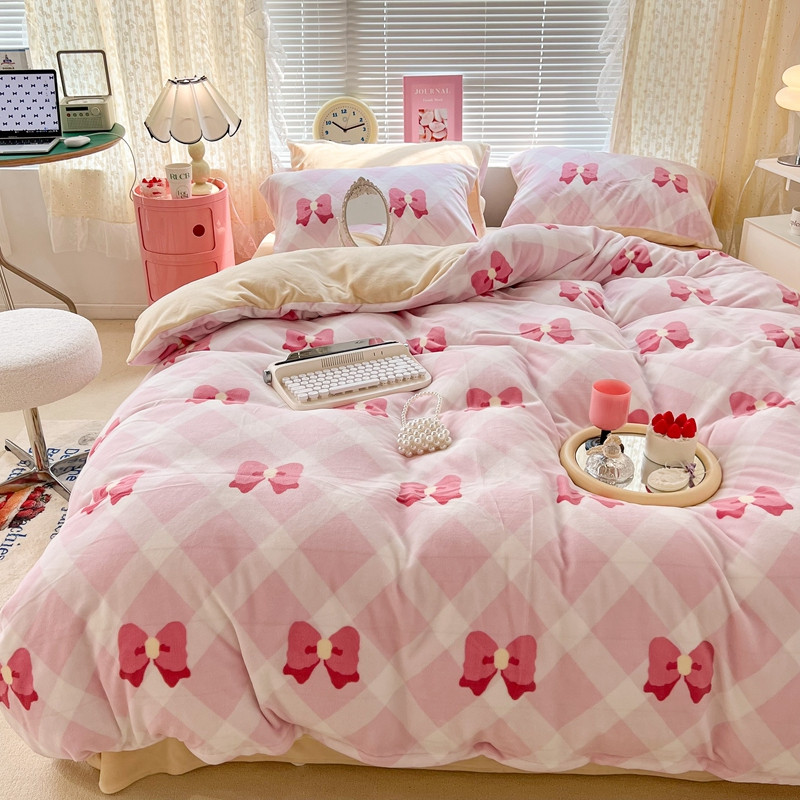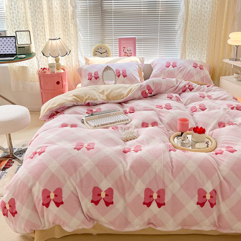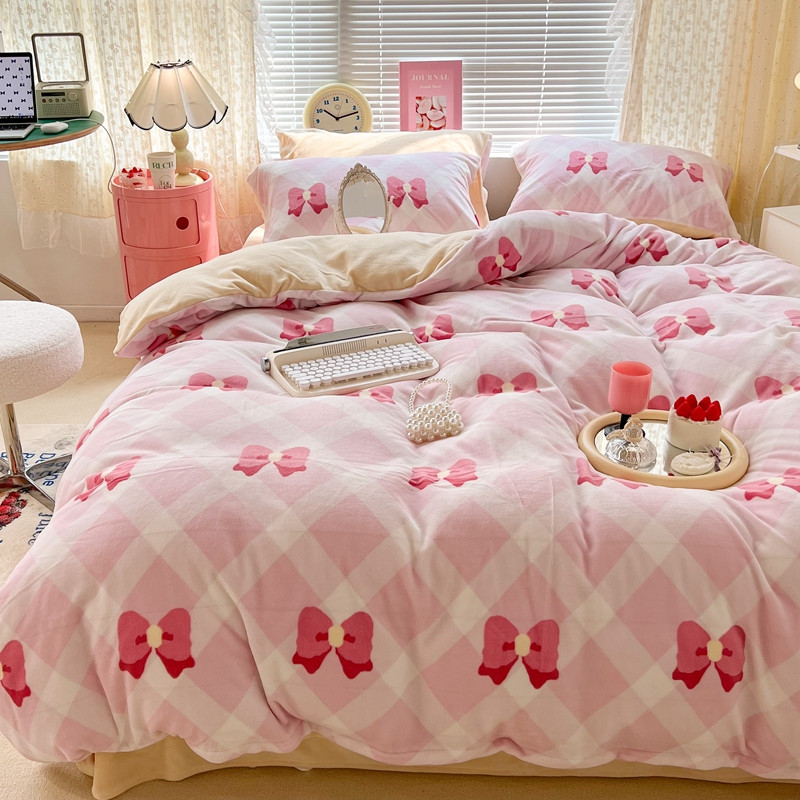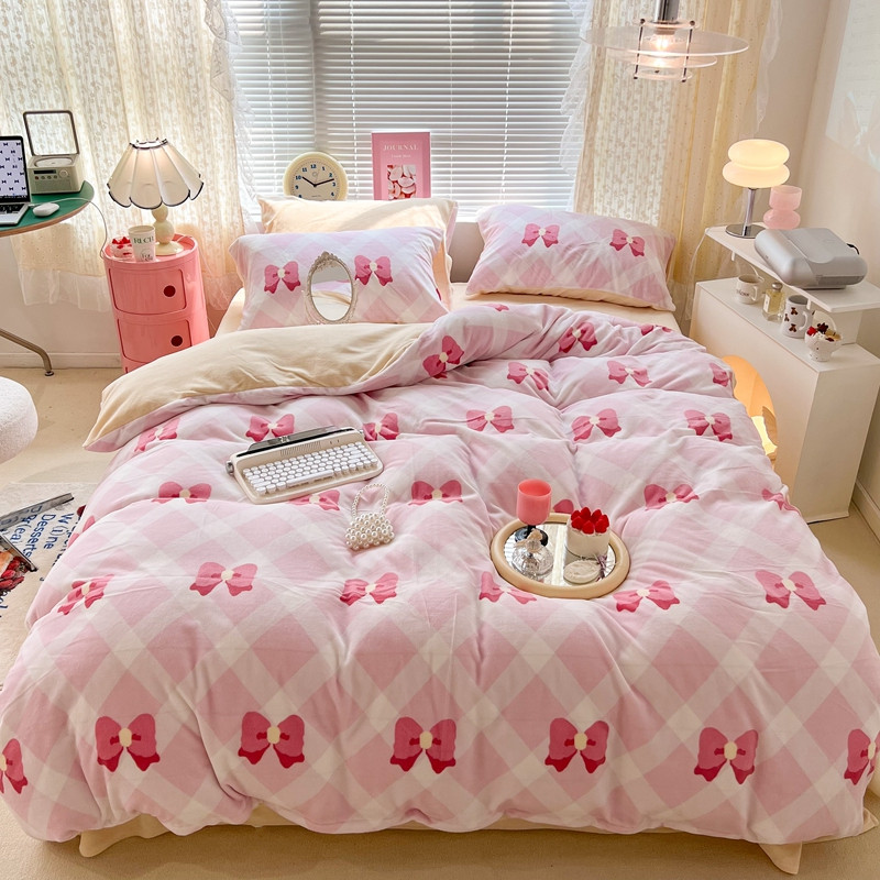 昔可 2022新款牛奶绒少女小清新系列四件套 菱格蝴蝶结粉