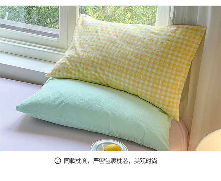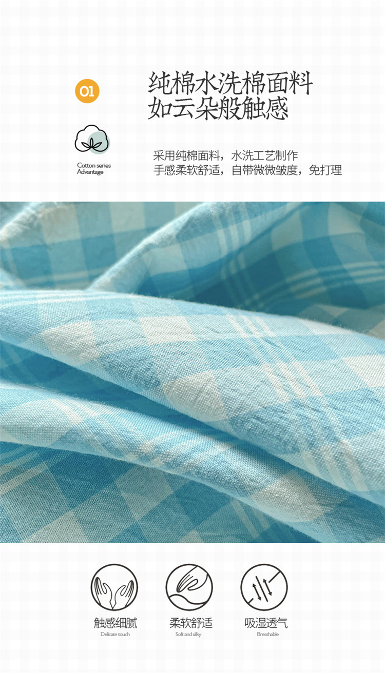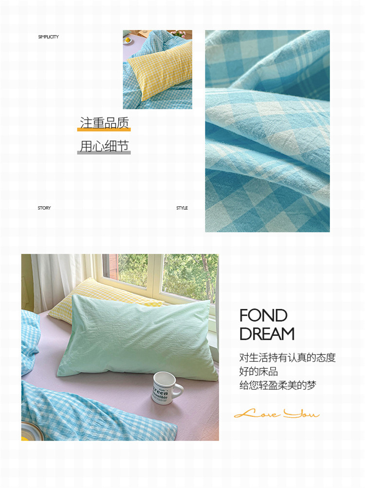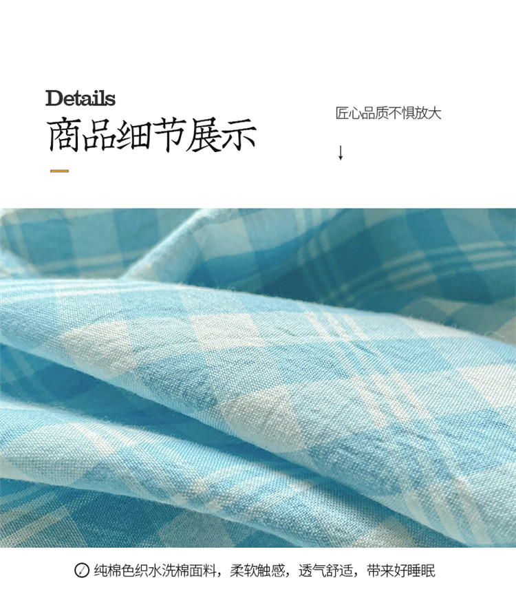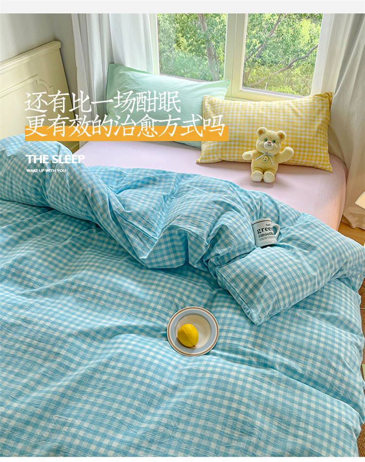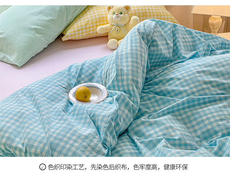 桃子家居 ins纯棉色织水洗棉韩系奶油撞色格子四件套 baby蓝格
