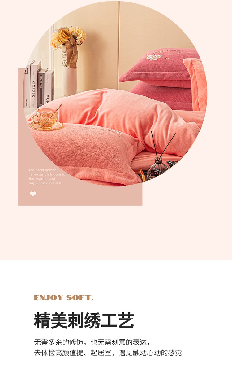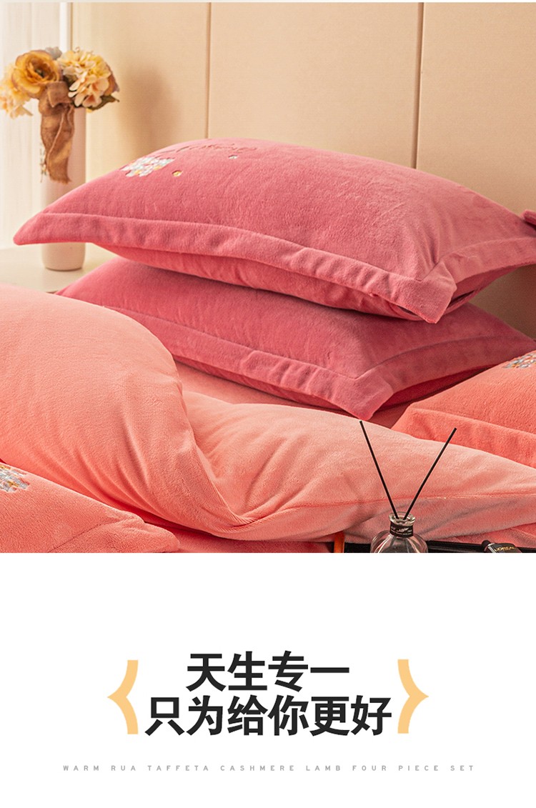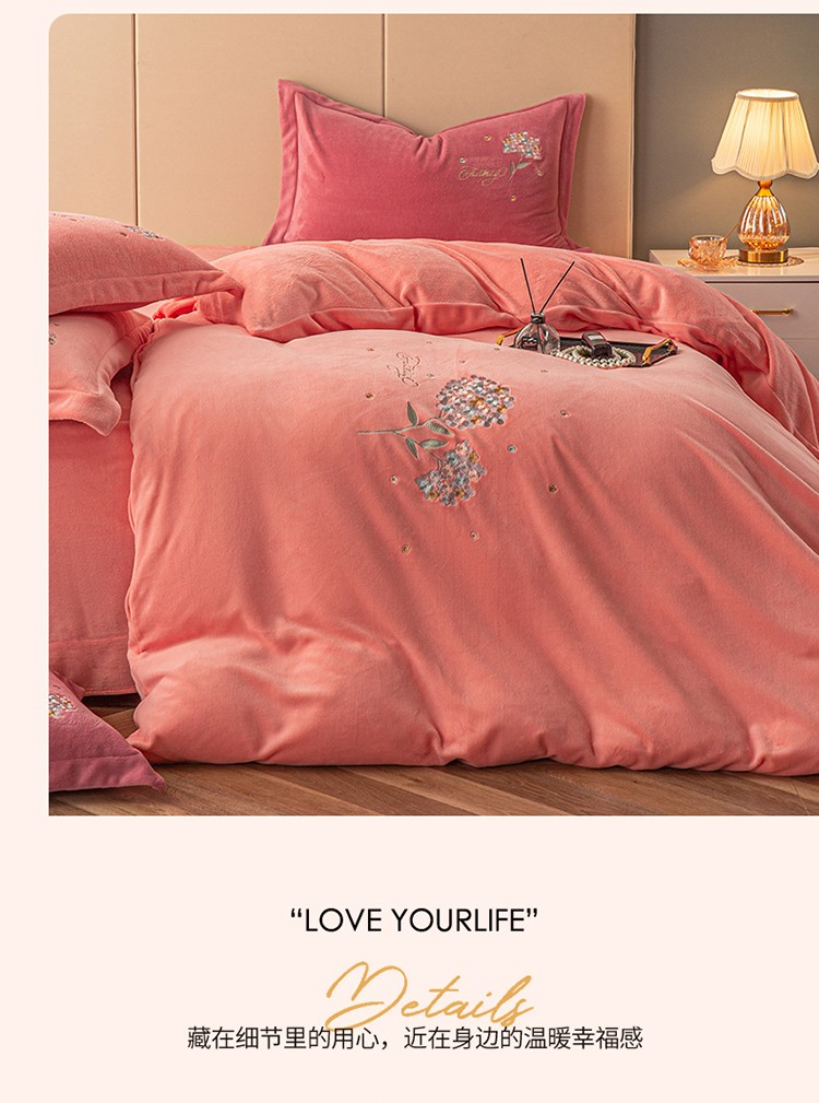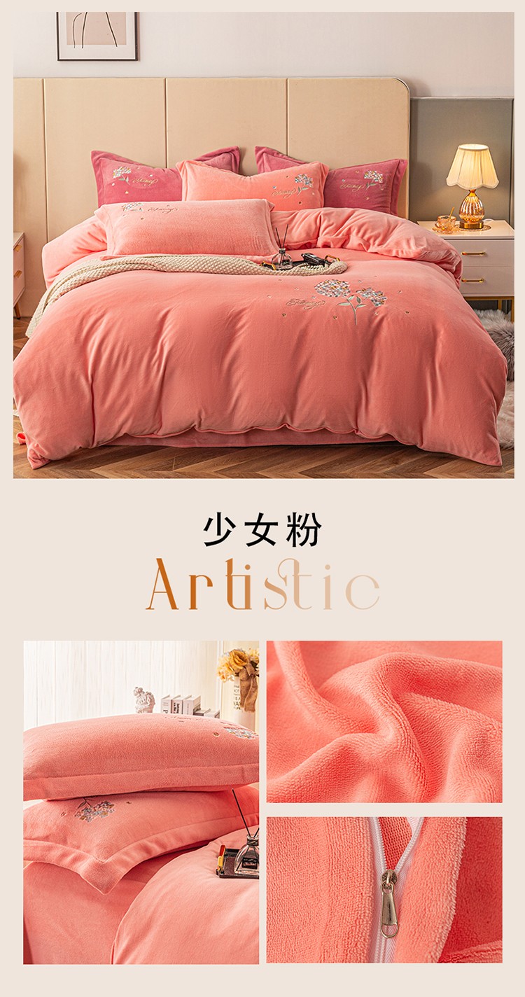 商品名称:名品优仓 2022新款刺绣牛奶绒200克四件套-绣花球 少女粉