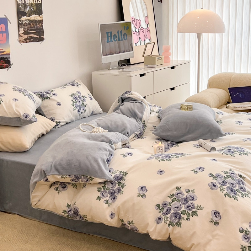 昔可 2022新款梦幻公主风系列棉加绒印花四件套 法式蓝玫瑰