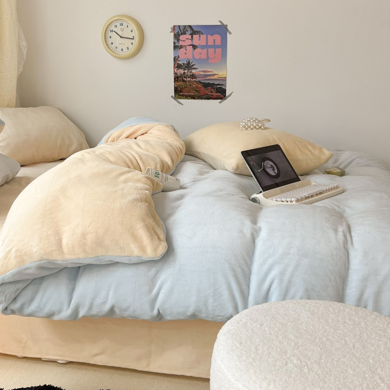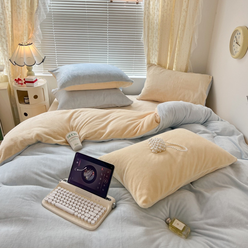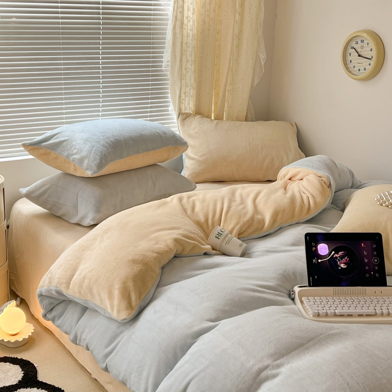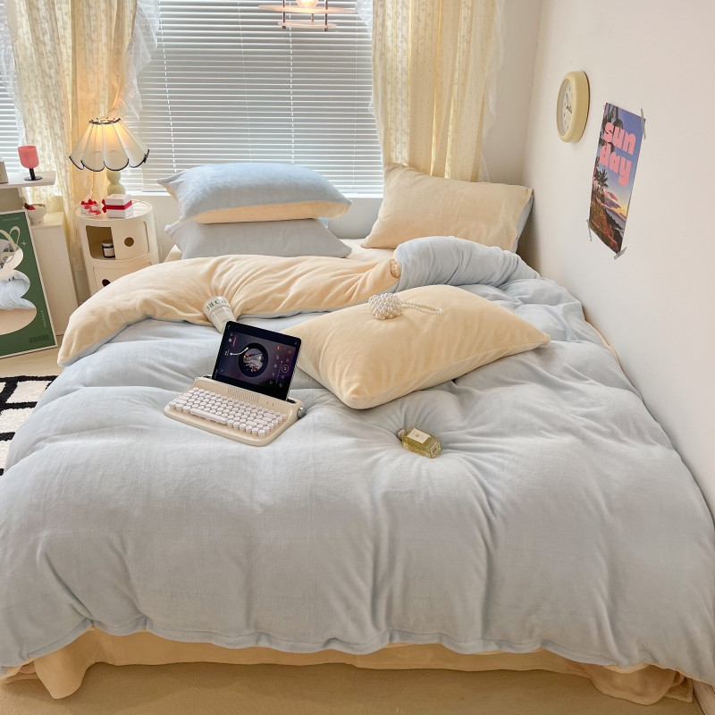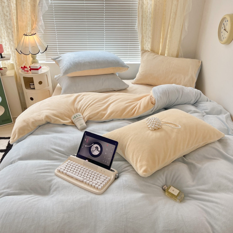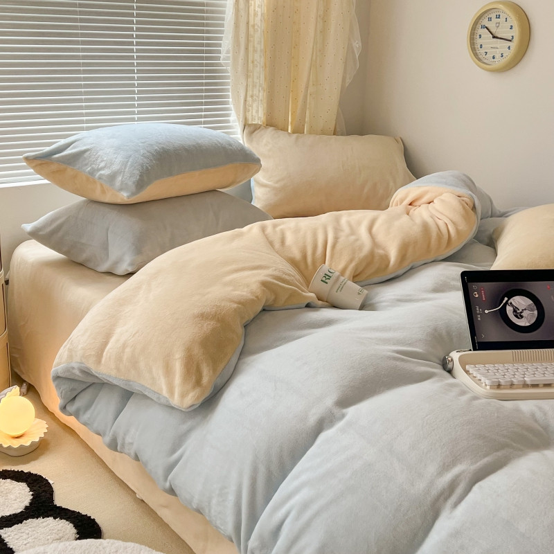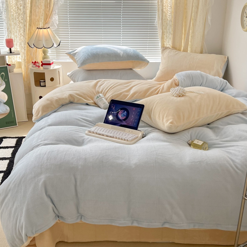 昔可 2022新款奶油双拼系列牛奶绒四件套 奶油蓝拼黄