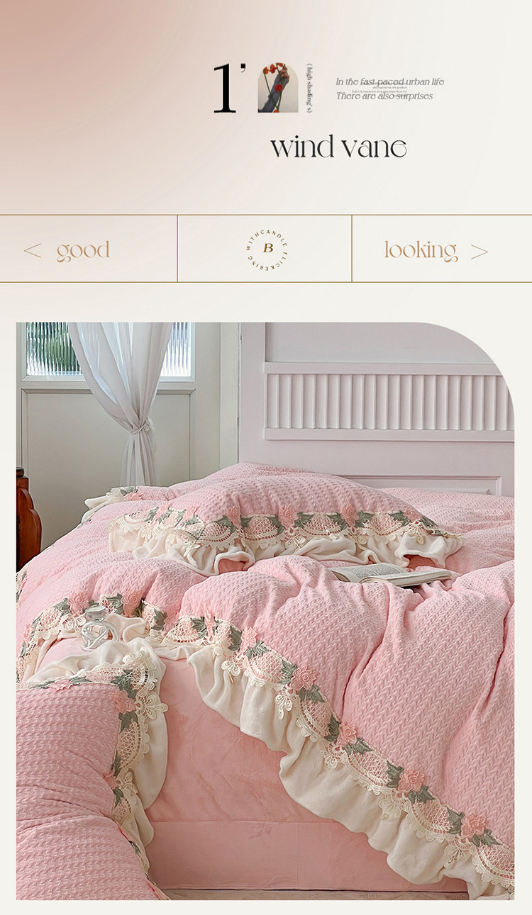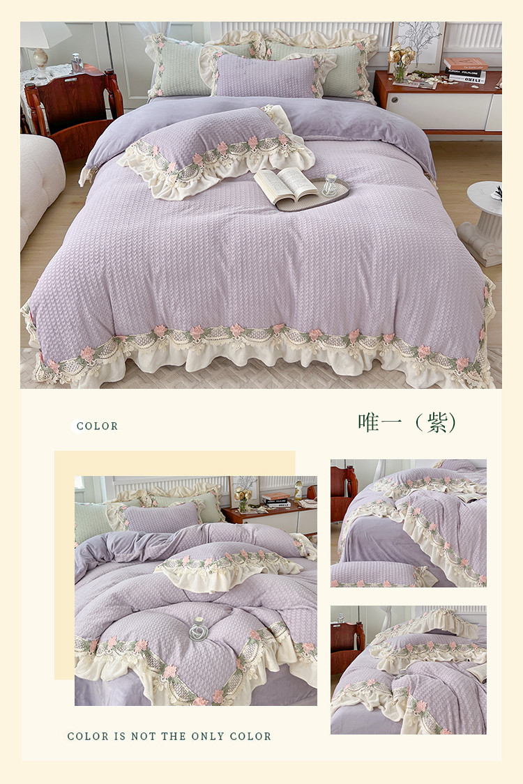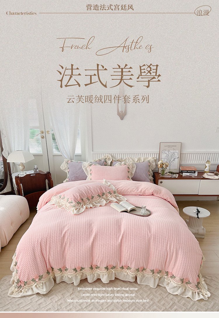 商品名称:总玛奇朵 高定蕾丝边全消光云芙暖绒四件套-唯 一(场景1)