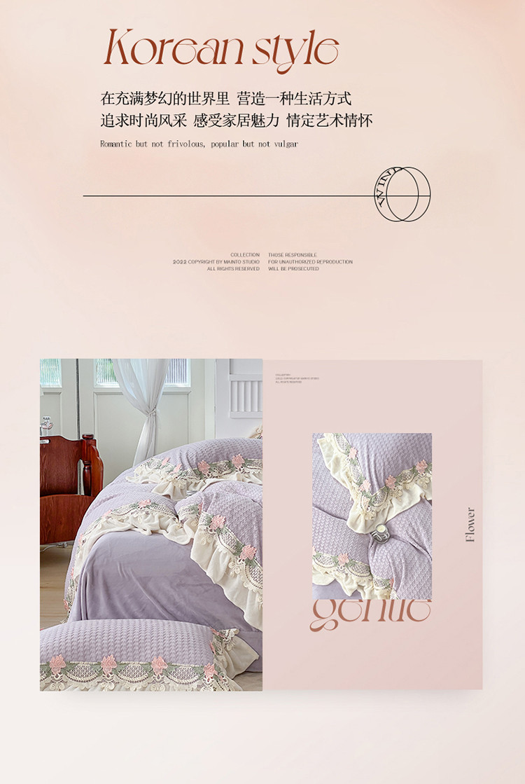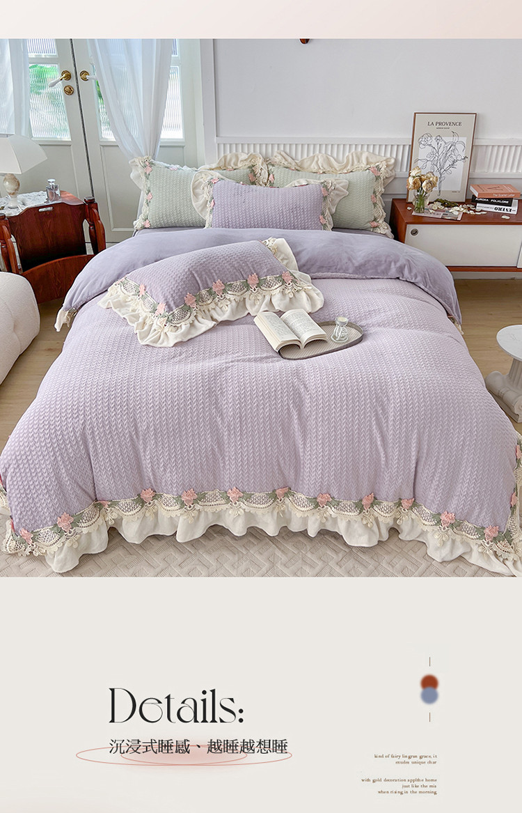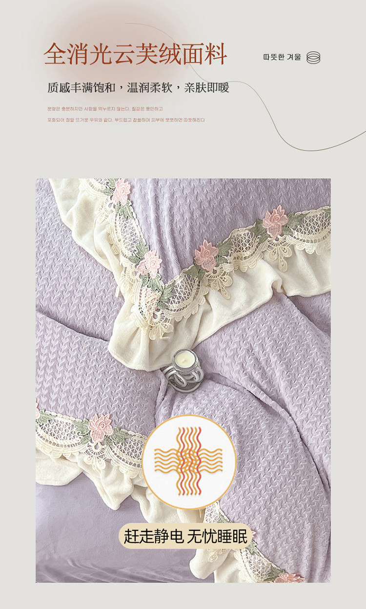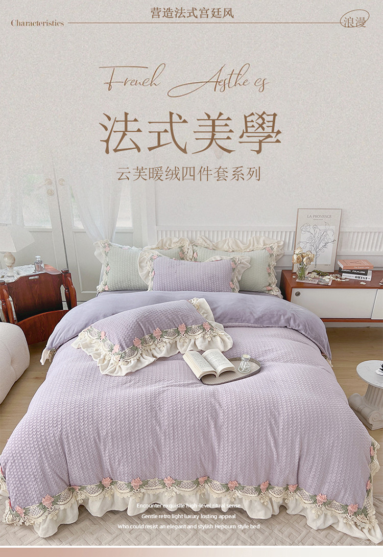 玛奇朵 高定蕾丝边全消光云芙暖绒四件套-唯 一(场景2) 唯一(紫)