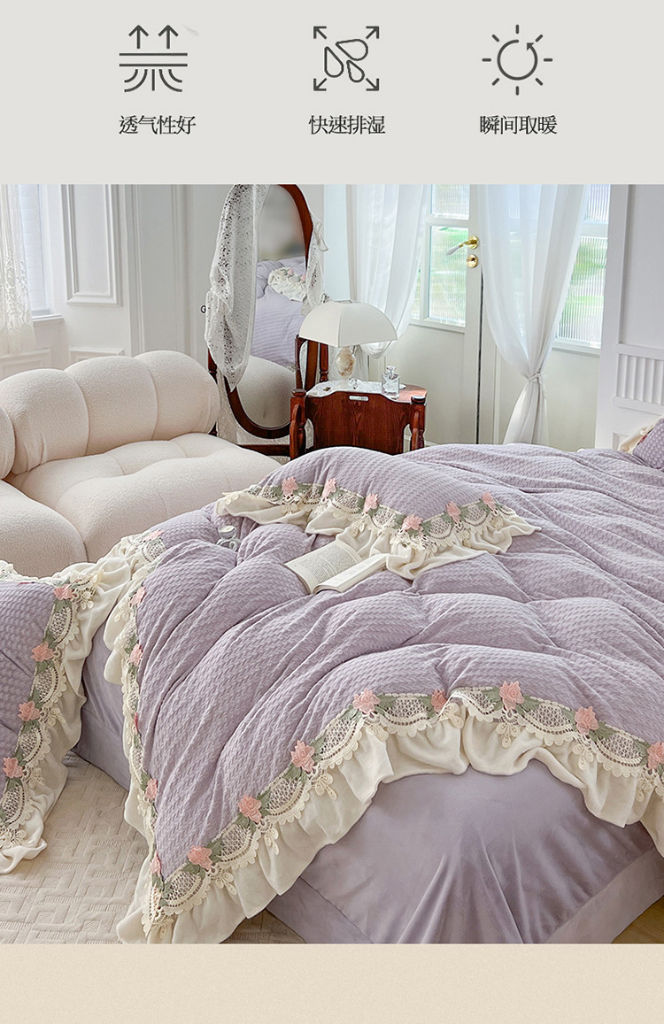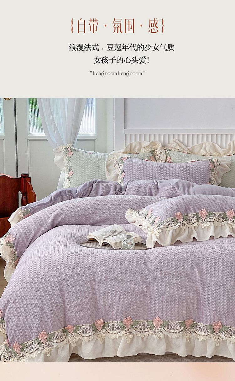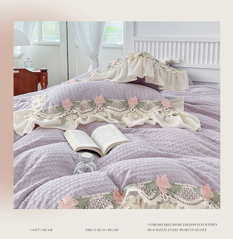 商品名称:玛奇朵 高定蕾丝边全消光云芙暖绒四件套-唯 一(场景2) 唯一(紫)