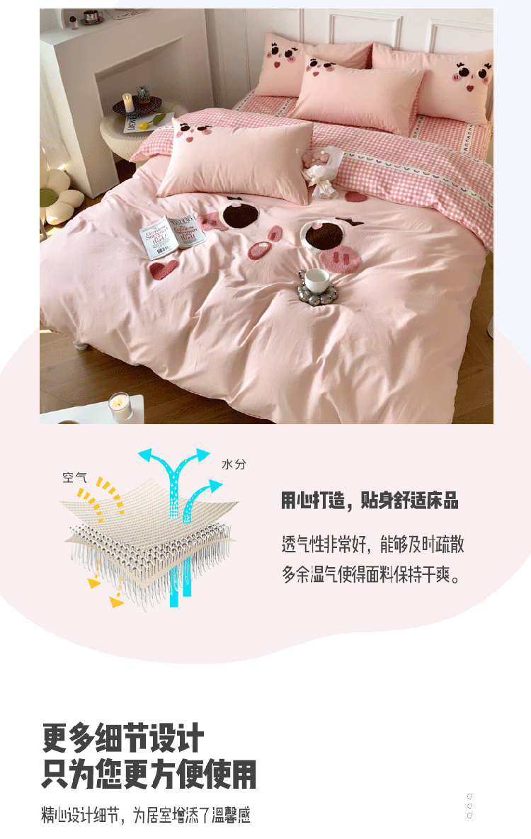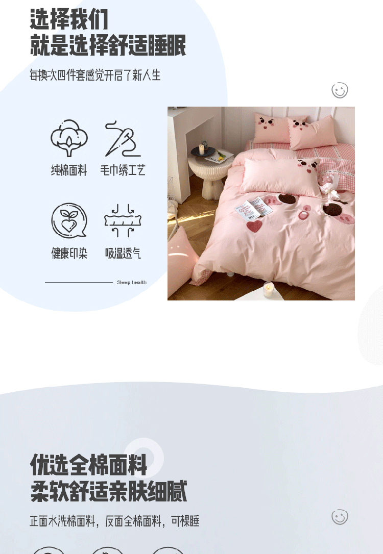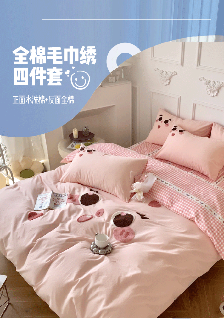 当前位置: 91家纺网 > 商品网购 > 床品套件 > 四件套 > 全棉普通四件套 > 三朵 2023新款全棉水洗棉毛巾绣花四件套 笑脸