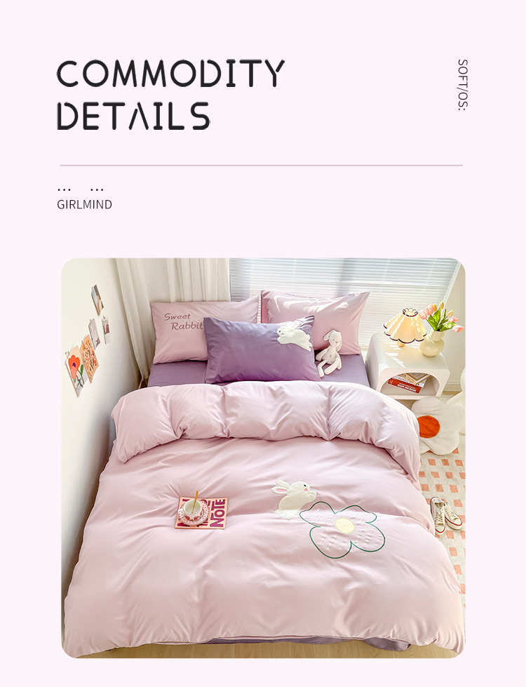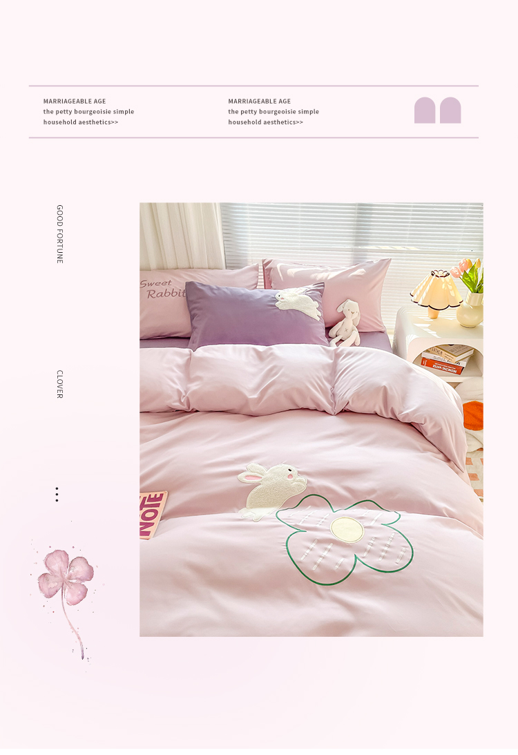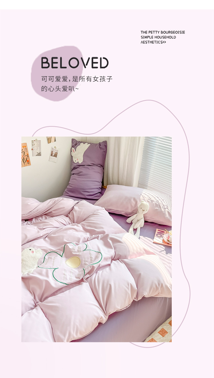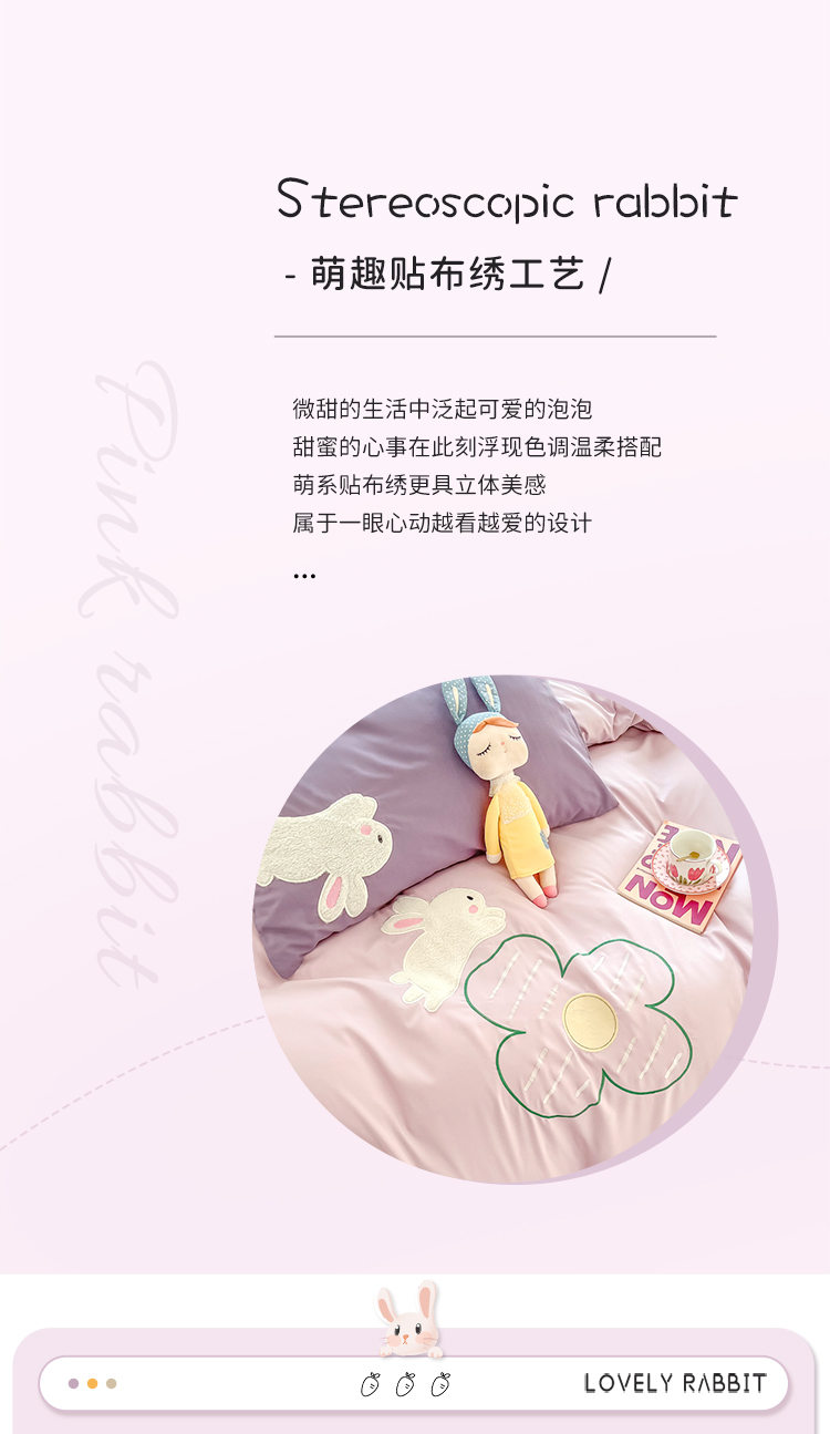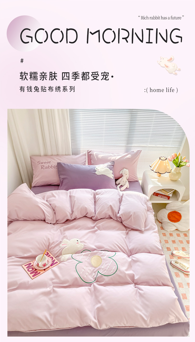 当前位置: 91家纺网 > 商品网购 > 床品套件 > 四件套 > 化纤普通四件套 > 尤米 2023新款亲肤萌趣贴布绣工艺有钱兔撞色四件套 有钱兔-浅紫