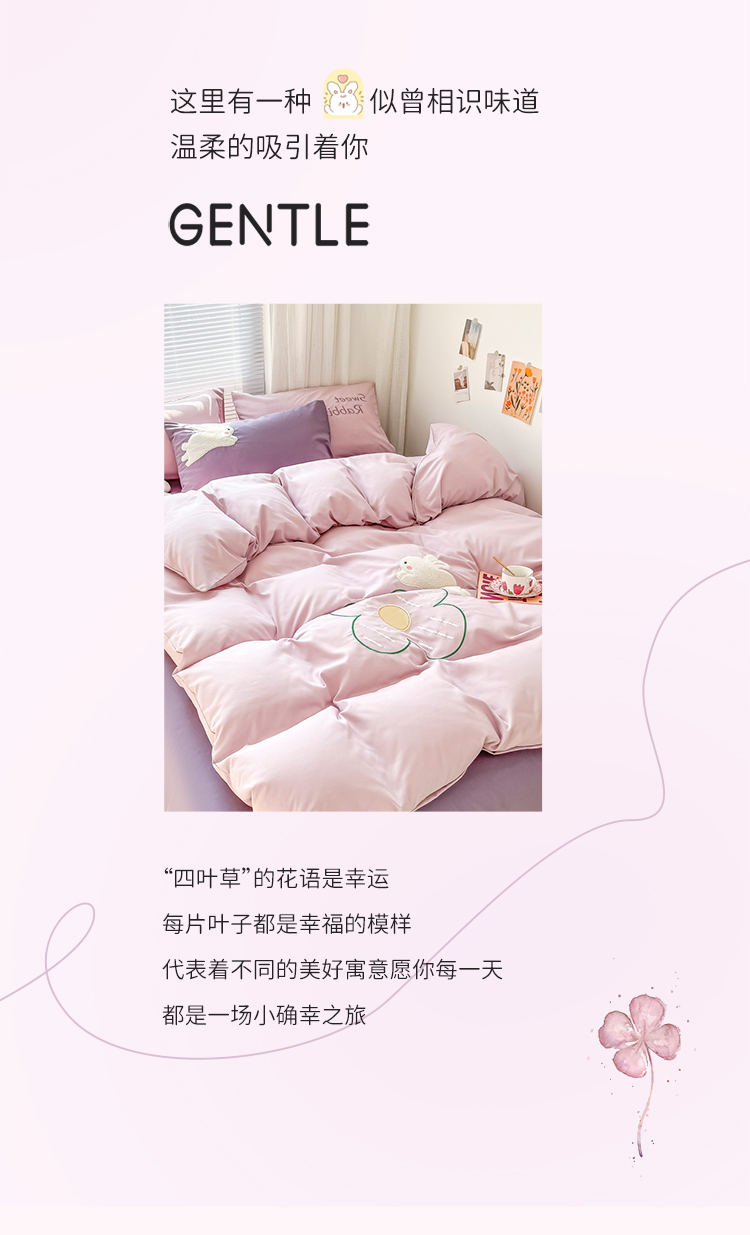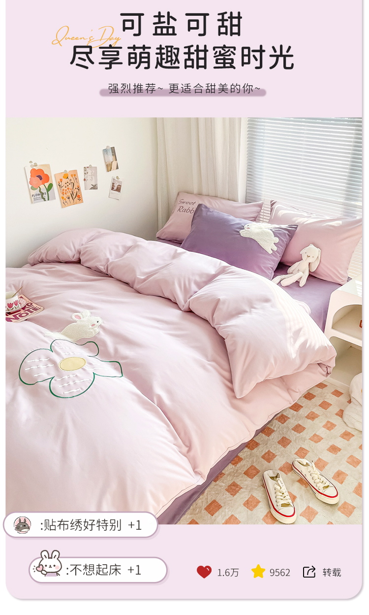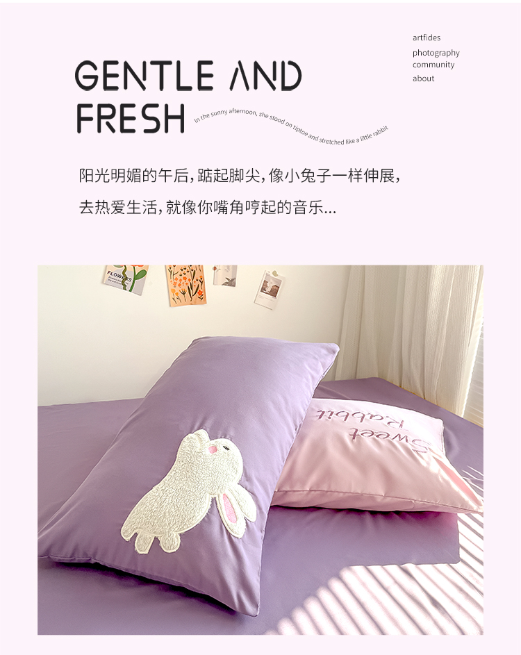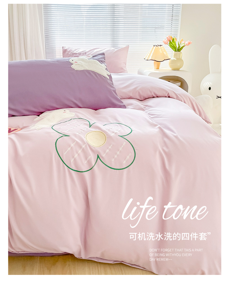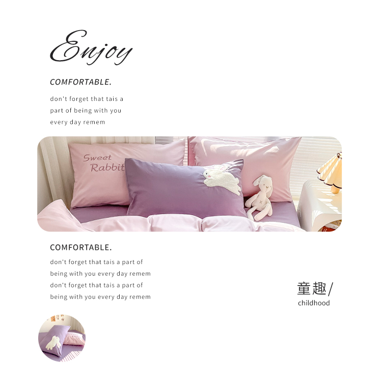 当前位置: 91家纺网 > 商品网购 > 床品套件 > 四件套 > 化纤普通四件套 > 尤米 2023新款亲肤萌趣贴布绣工艺有钱兔撞色四件套 有钱兔-浅紫