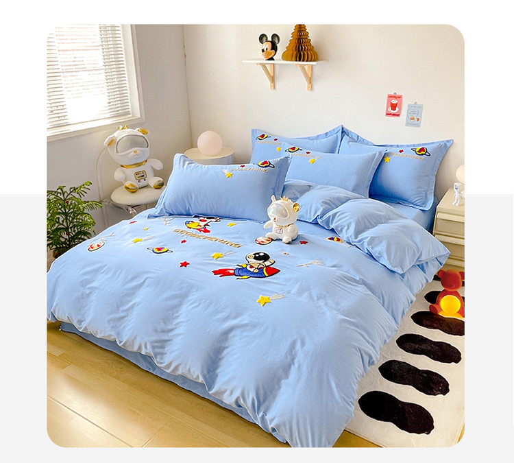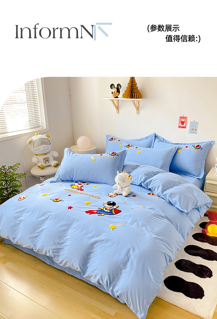 金窝窝家纺 2025新款全消光高克重牛奶绒贴布绣四件套 卡皮熊-天空蓝,卡皮熊-天空蓝