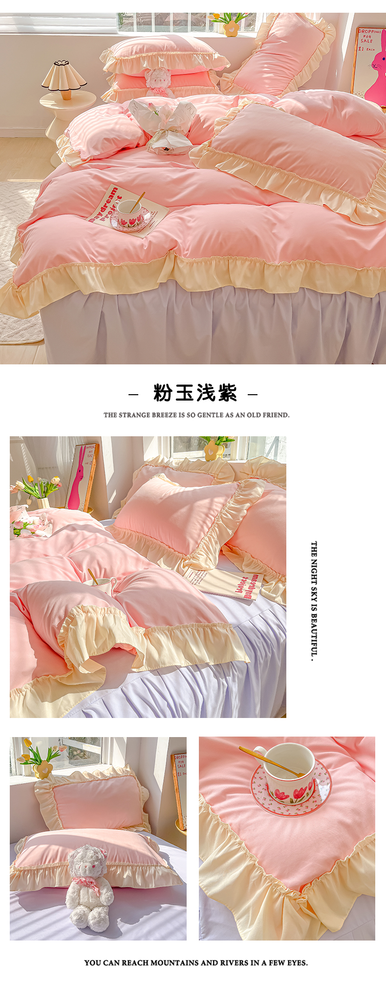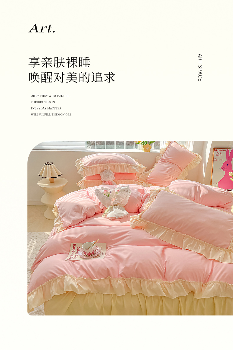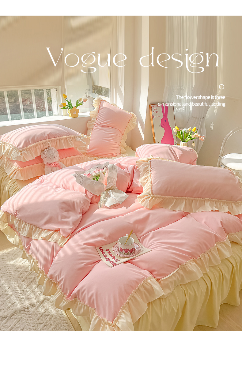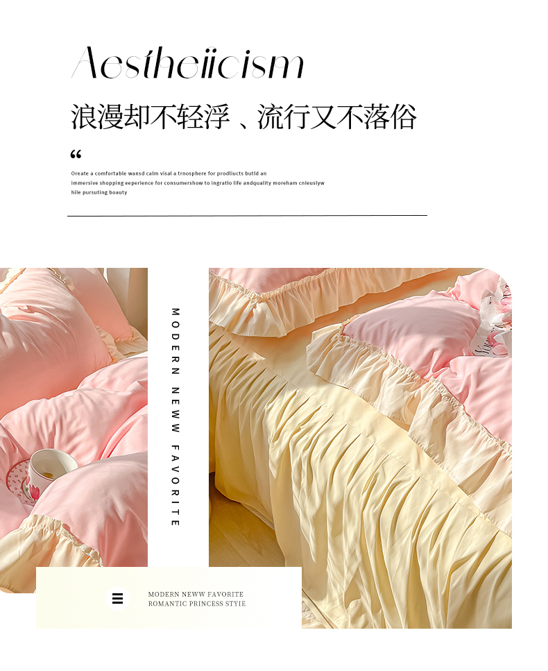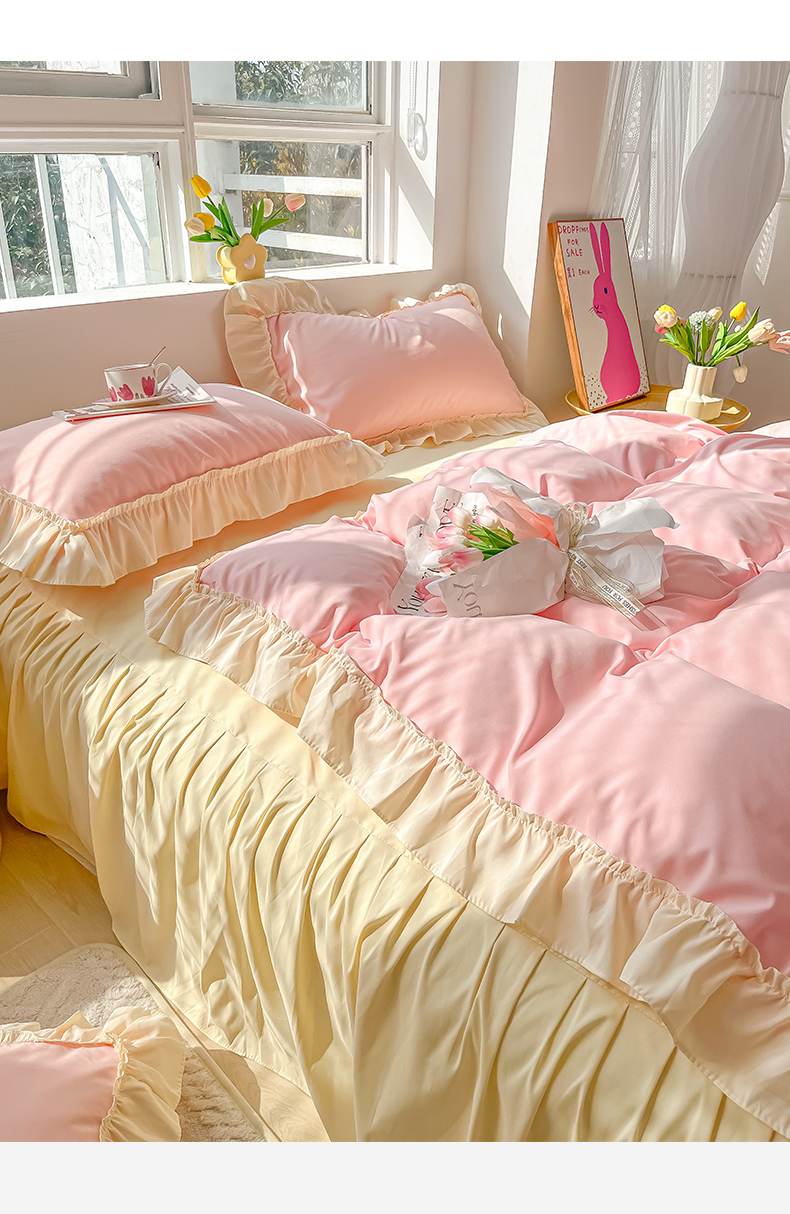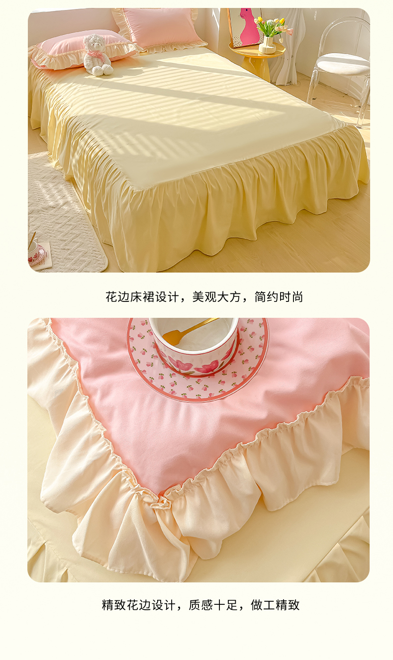 (总)韩都家居 2023新款公主风花边双拼四件套,粉玉奶黄,粉玉浅紫,奶油黄,奶油青绿,青绿奶黄,天蓝浅粉