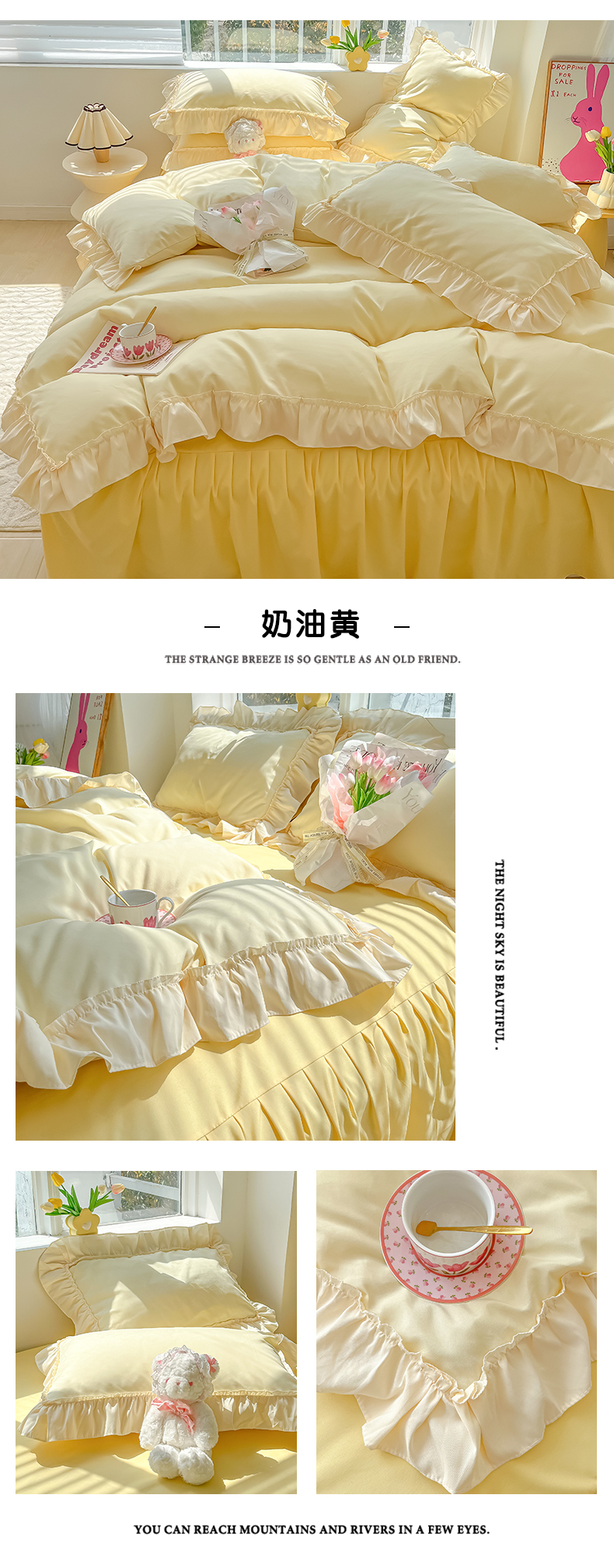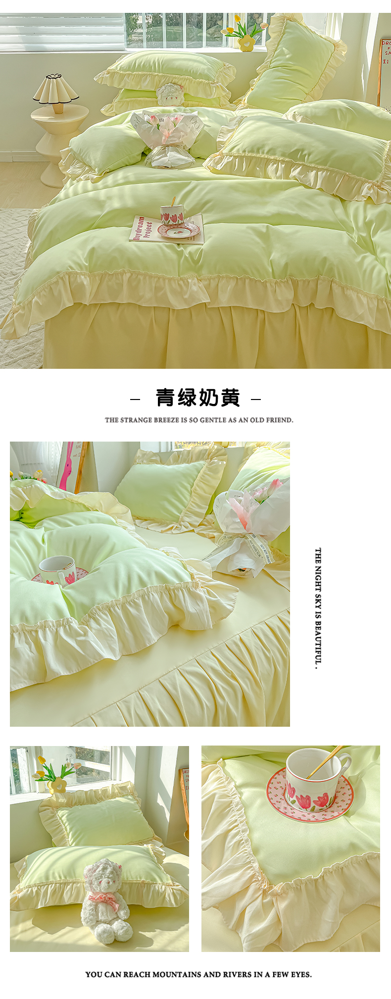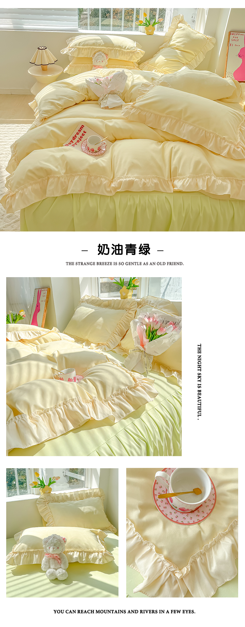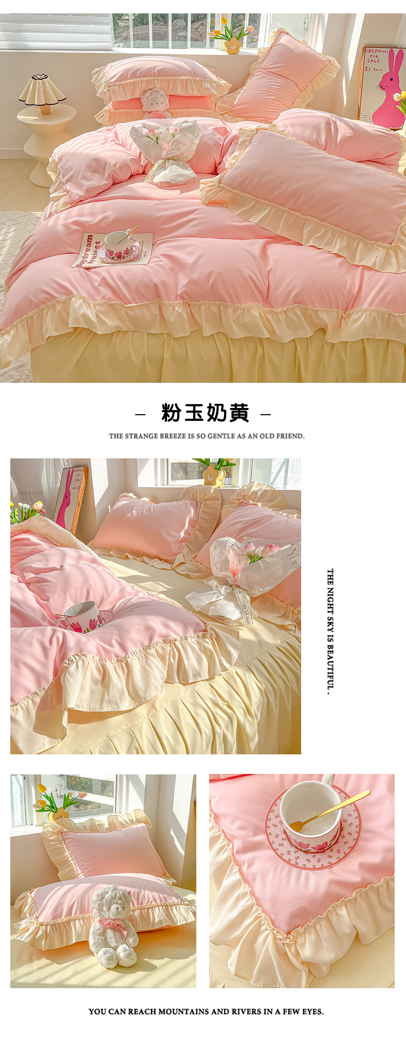 (总)韩都家居 2023新款公主风花边双拼四件套,粉玉奶黄,粉玉浅紫,奶油黄,奶油青绿,青绿奶黄,天蓝浅粉