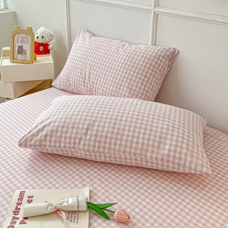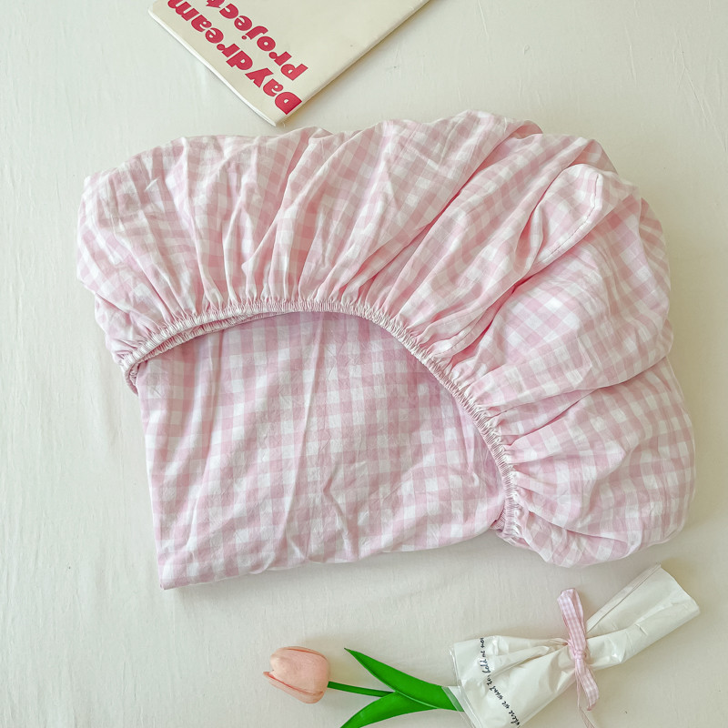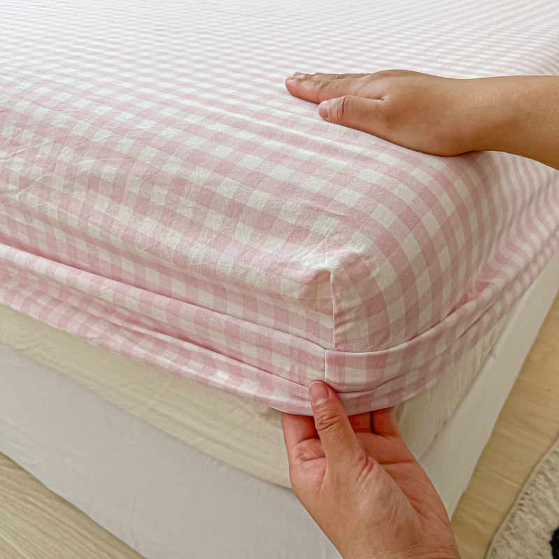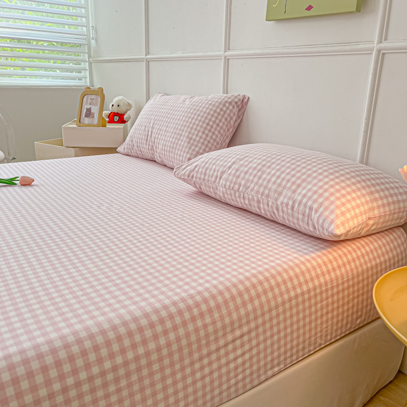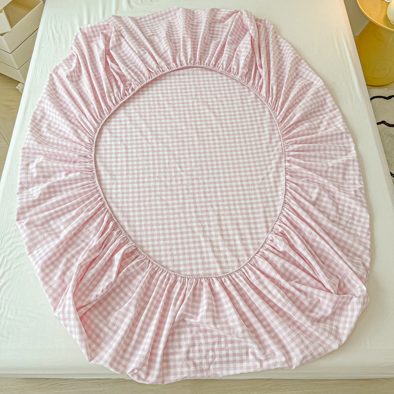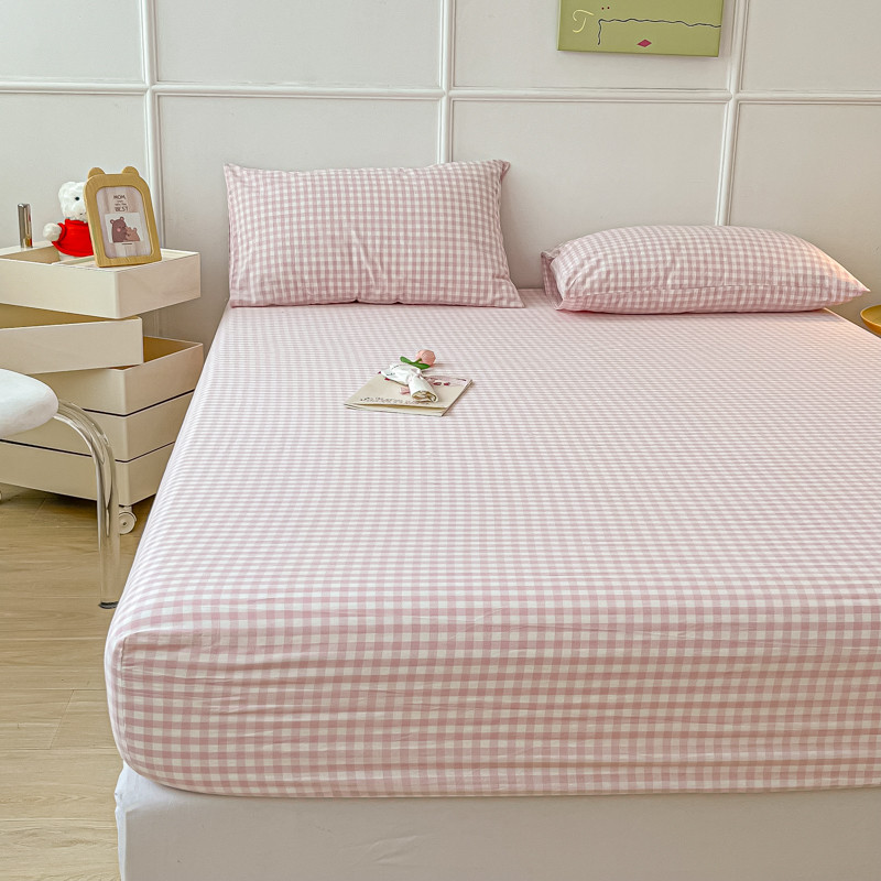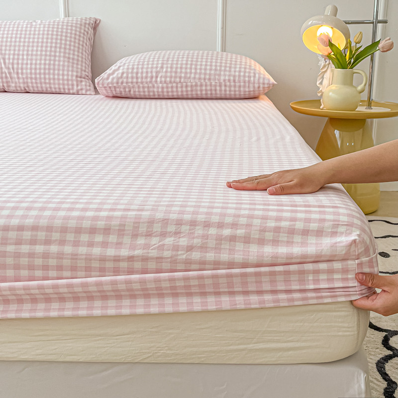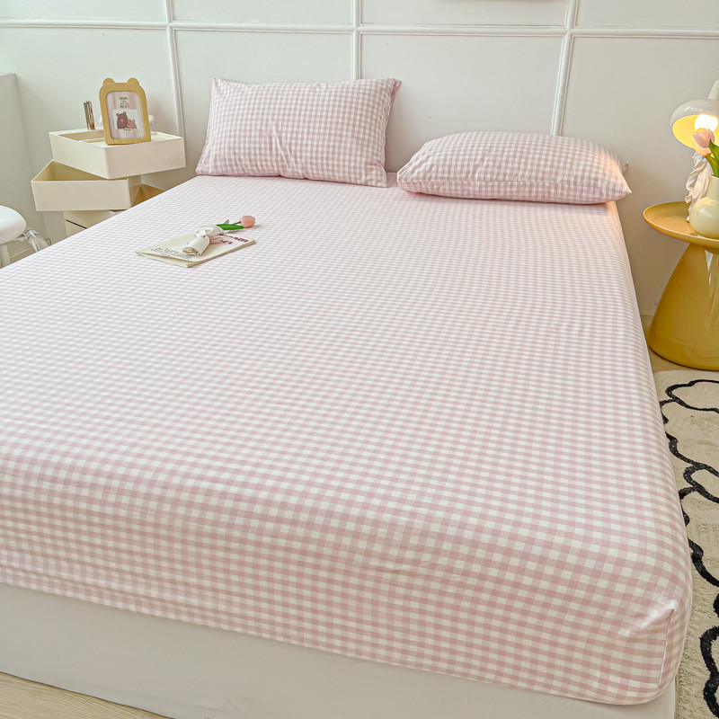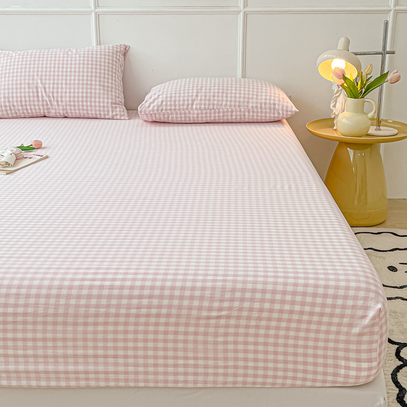 盼季 2023新款水洗棉床笠三件套防滑床罩席梦思全包围保护套 浅粉格