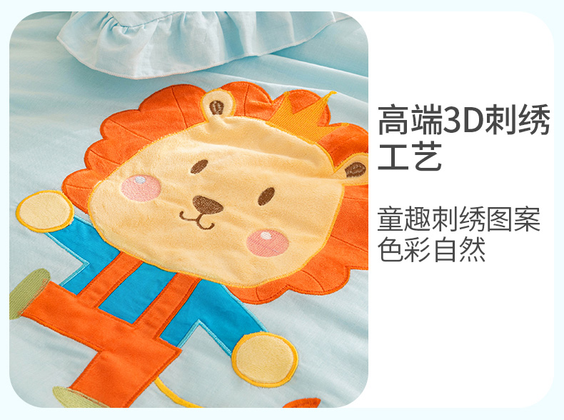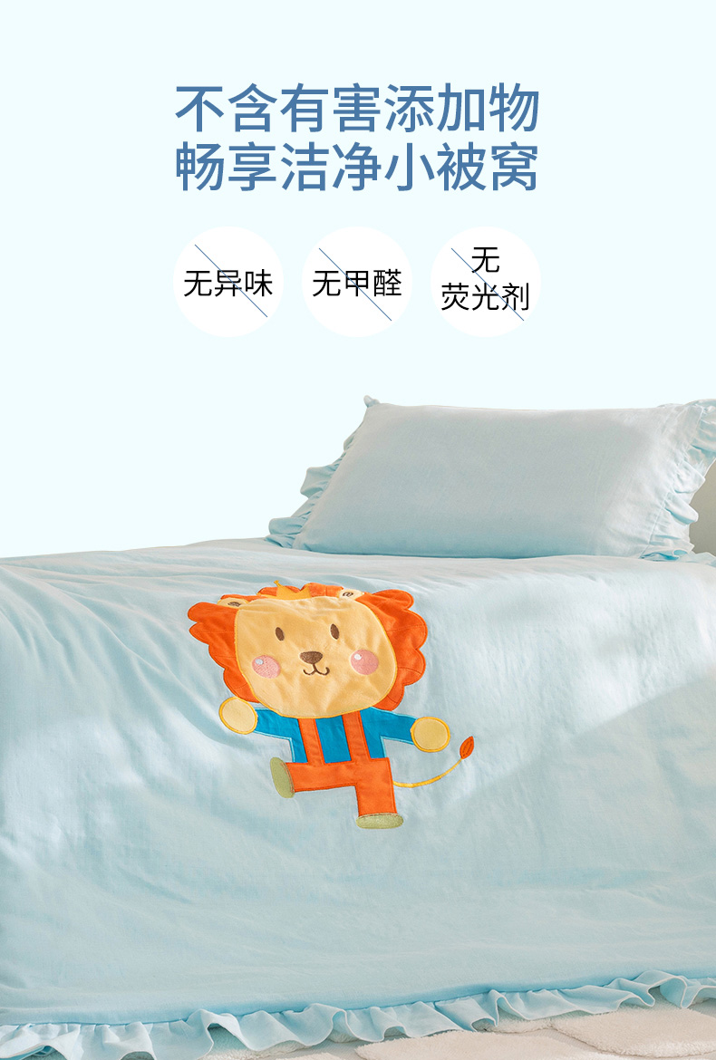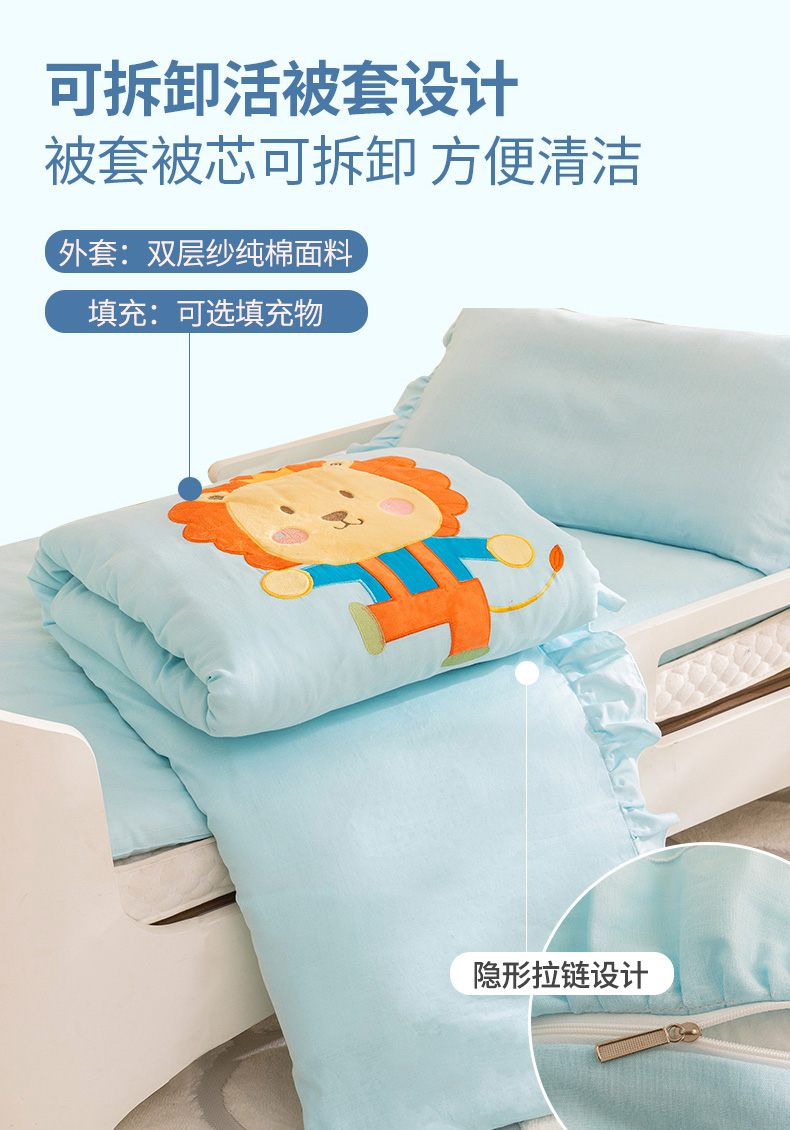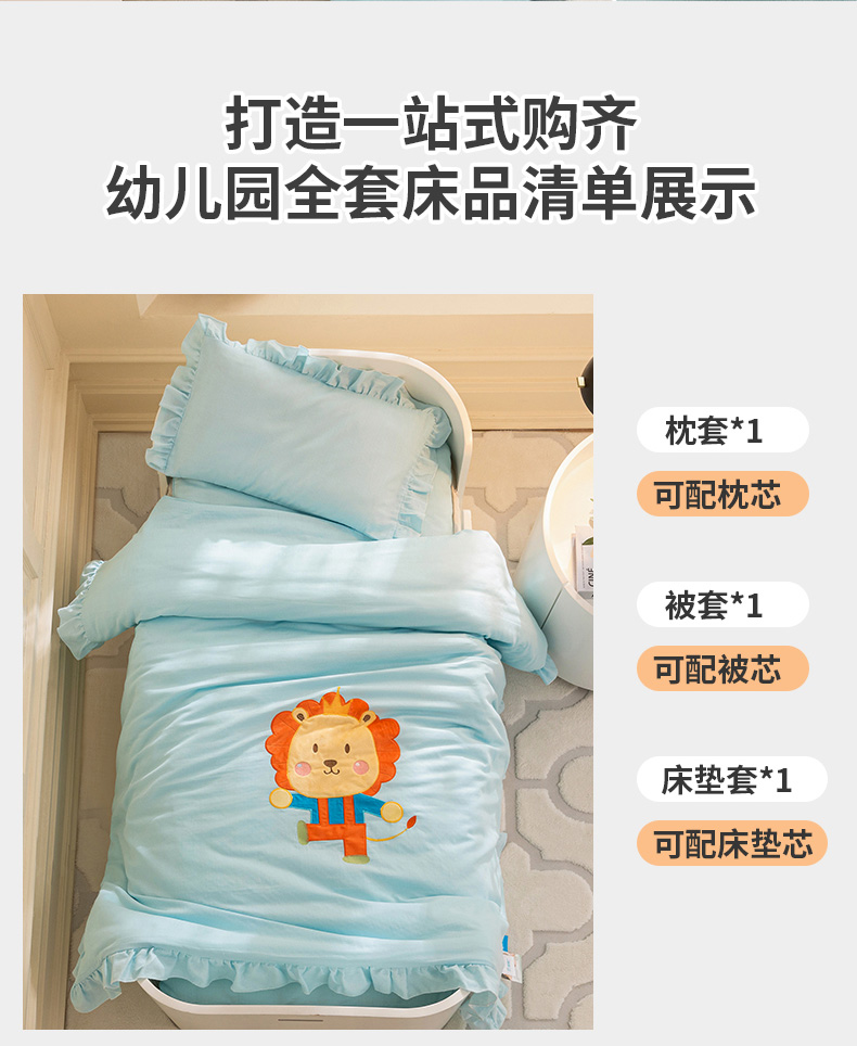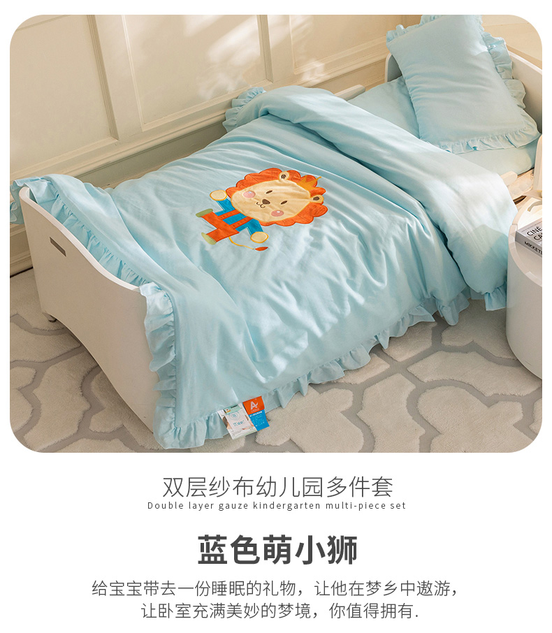 当前位置: 91家纺网 > 商品网购 > 床品套件 > 三件套 > 喜多兔 2023新款纯棉双层纱绣花幼儿园三件套 蓝色萌小狮