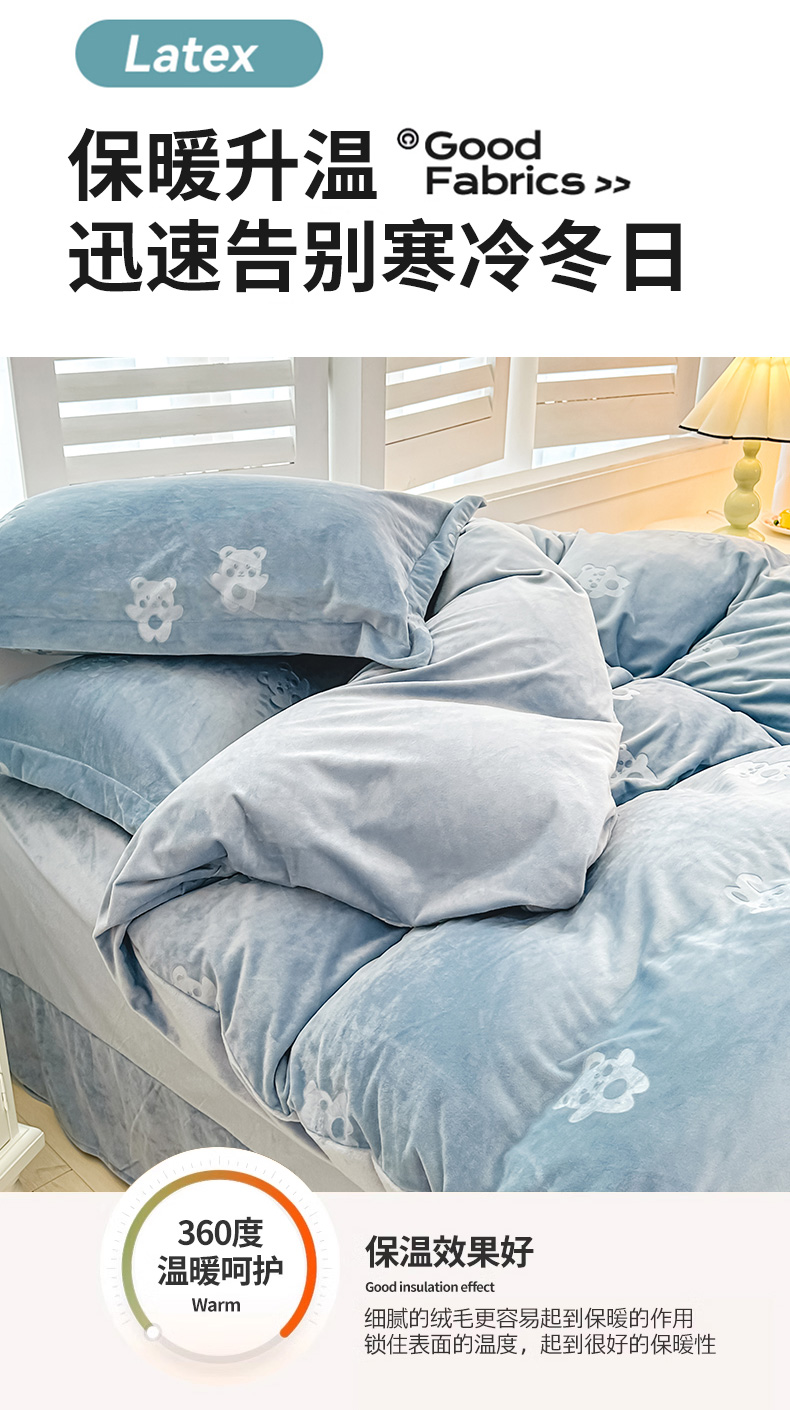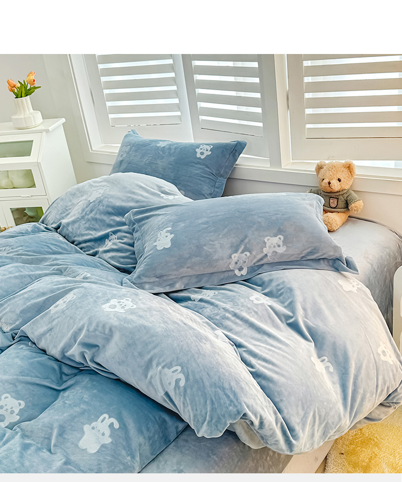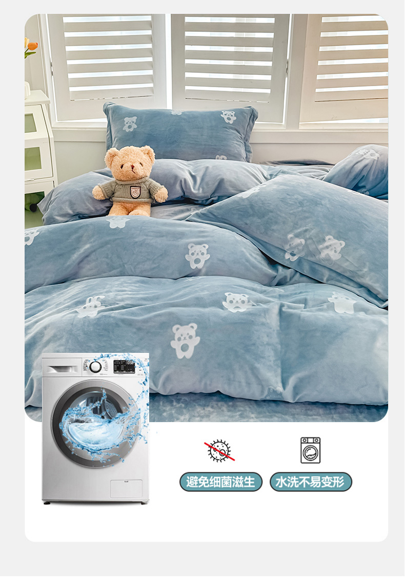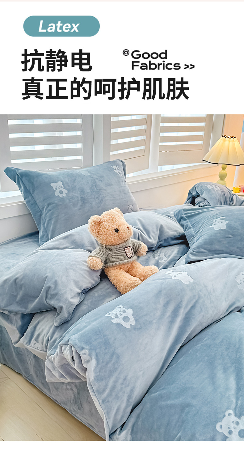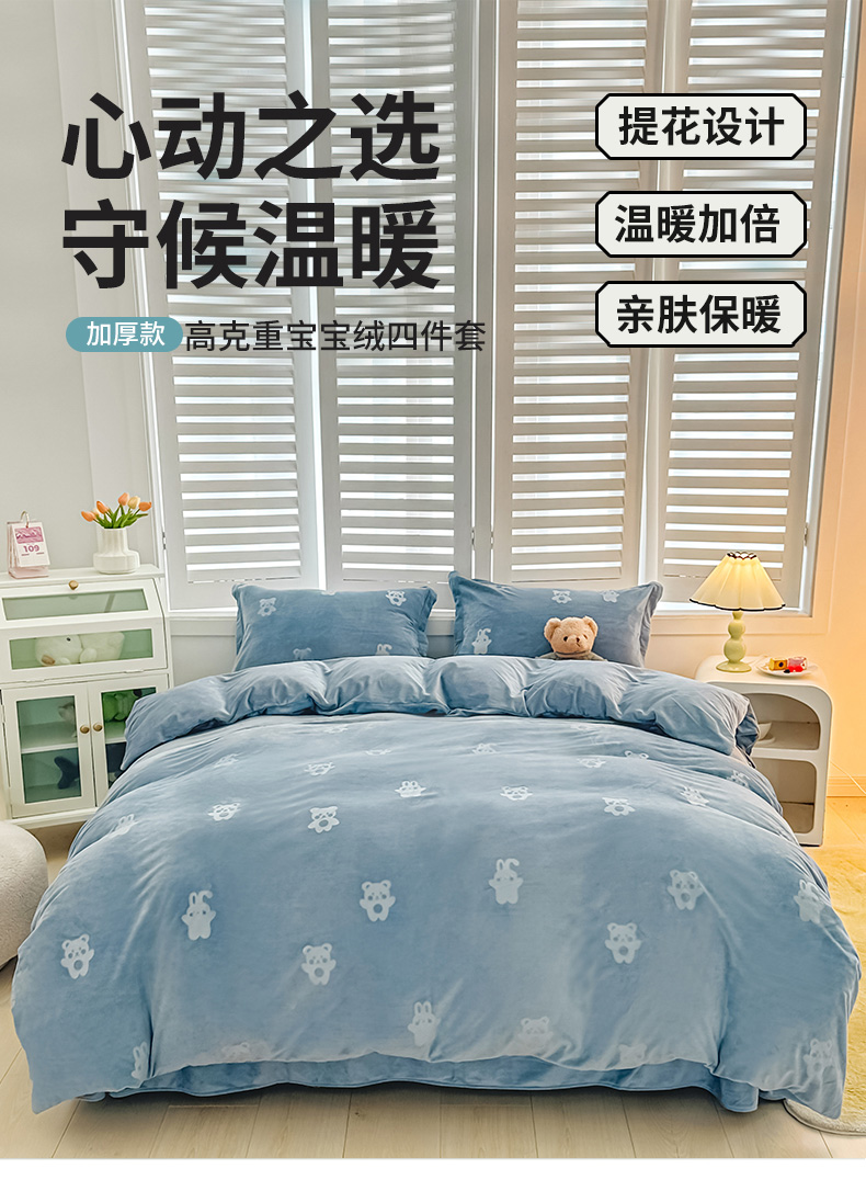 当前位置: 91家纺网 > 商品网购 > 床品套件 > 四件套 > 牛奶绒四件套 > 新款全消光210克婴儿绒宝宝绒压花四件套定制任意尺寸 宝宝绒-蓝小熊