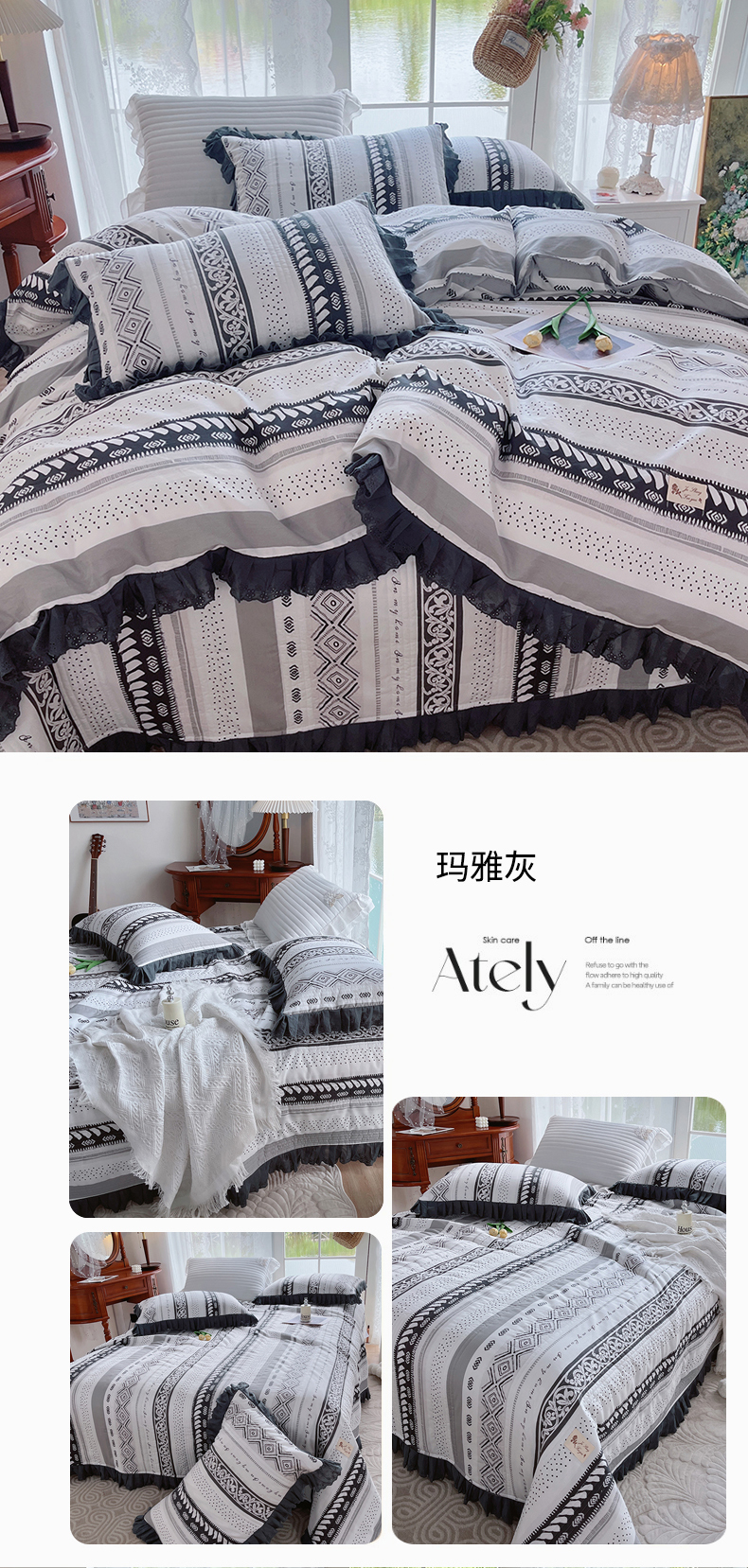 当前位置: 91家纺网 > 商品网购 > 床品套件 > 四件套 > 全棉普通四件套 > 菊上家纺 2023秋冬新品法式花边全棉床盖四件套 玛雅灰
