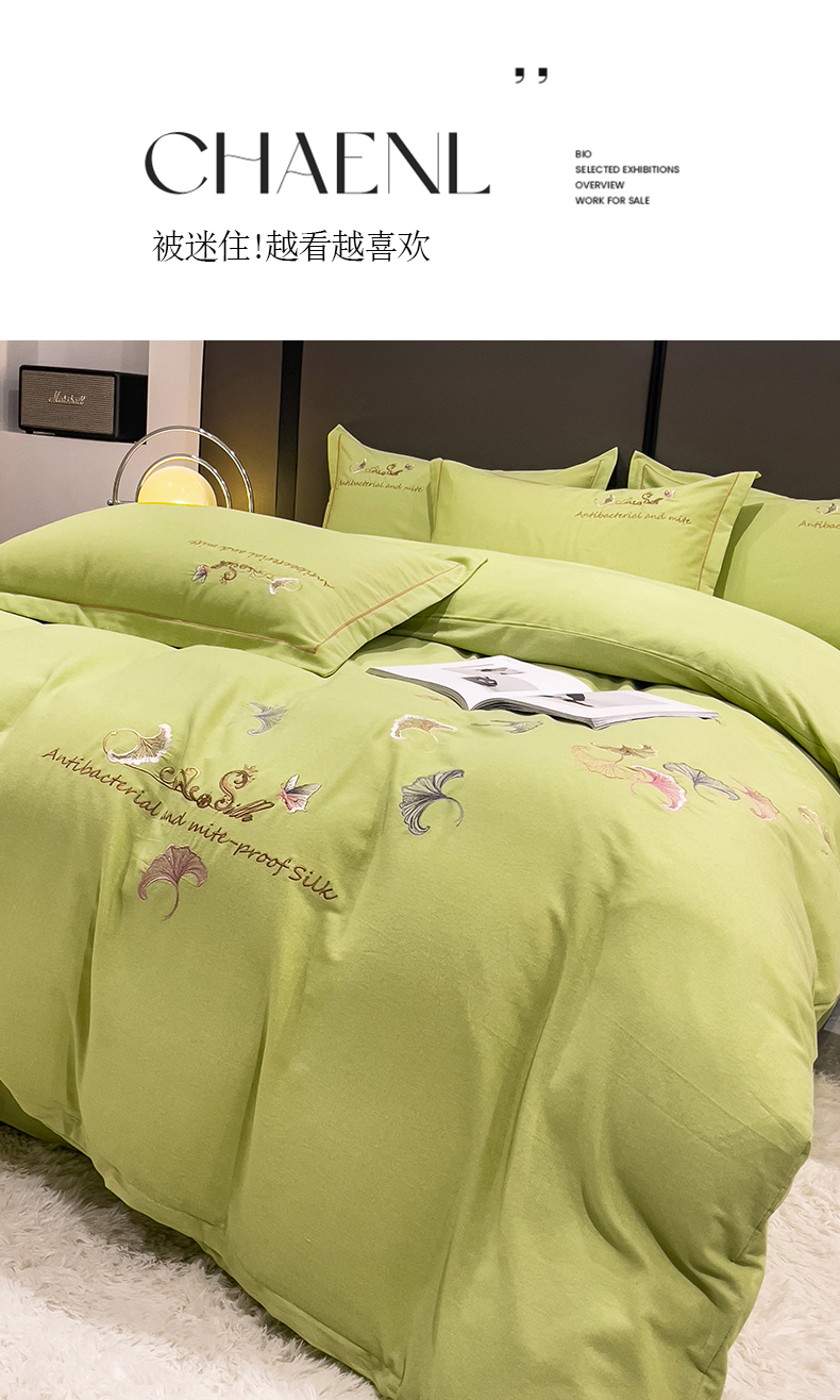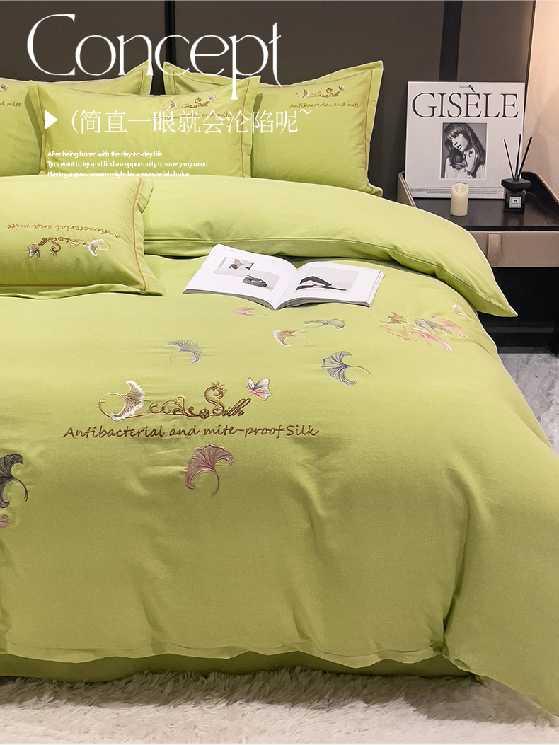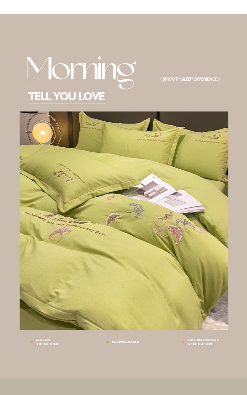 云锦2023新款全棉磨毛绣花四件套系列 悦动牛油果绿