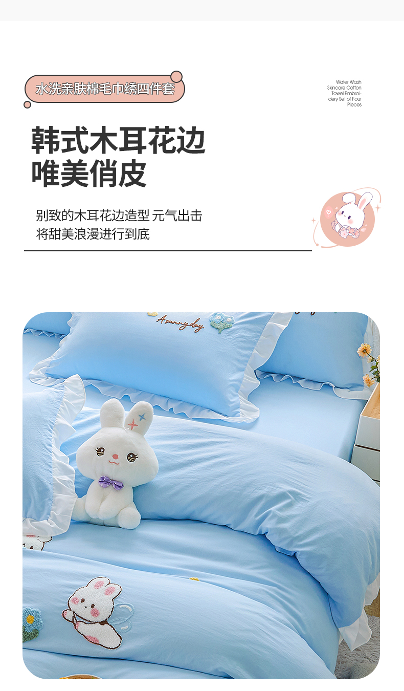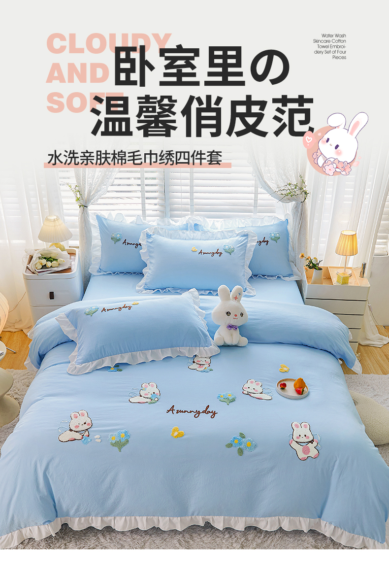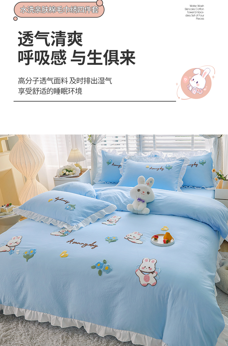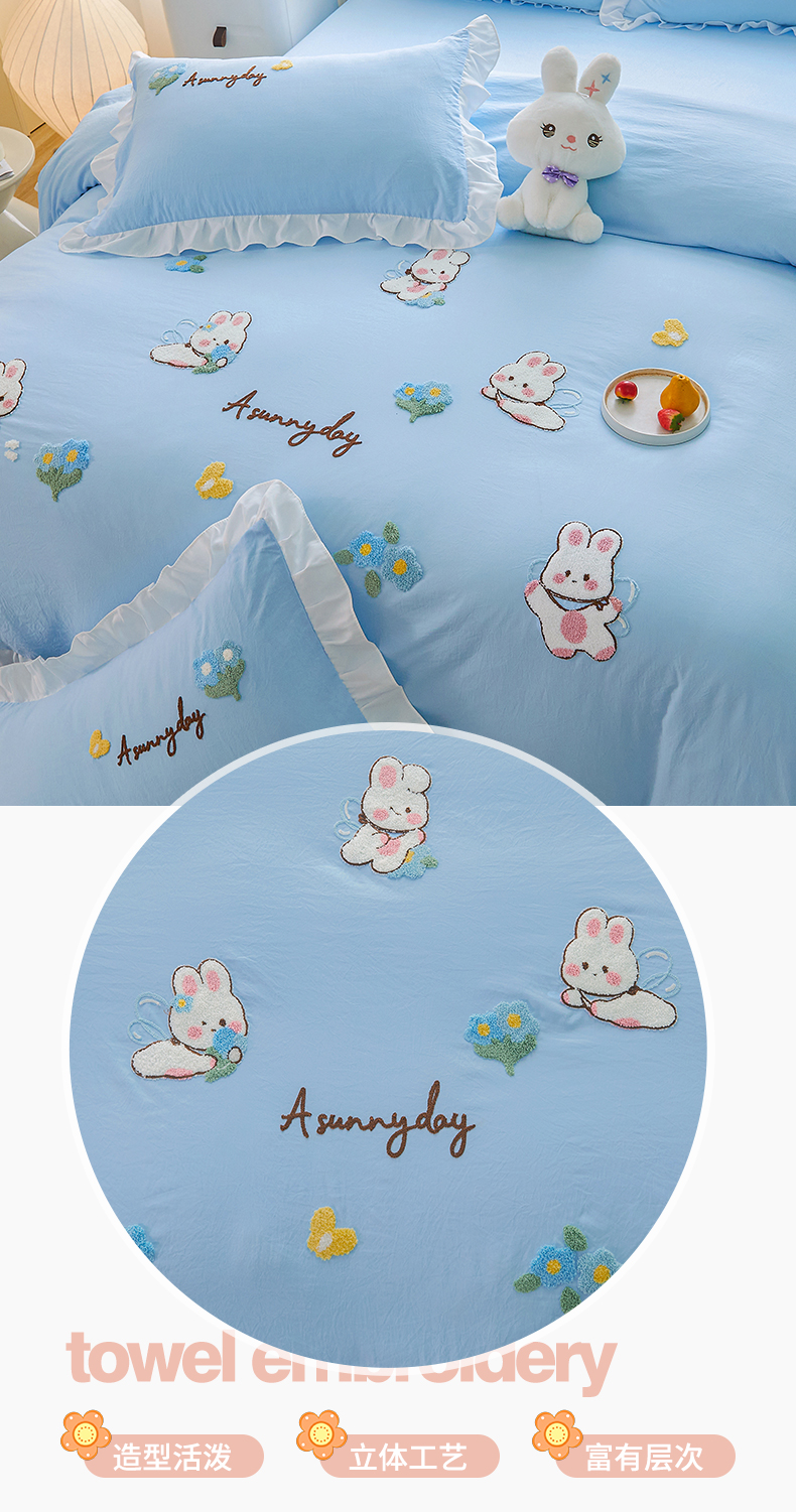 当前位置: 91家纺网 > 商品网购 > 床品套件 > 四件套 > 毛巾绣四件套 > 易禾家纺 2024新款水洗亲肤棉毛巾绣四件套专版花型-幸福兔 幸福兔-兰