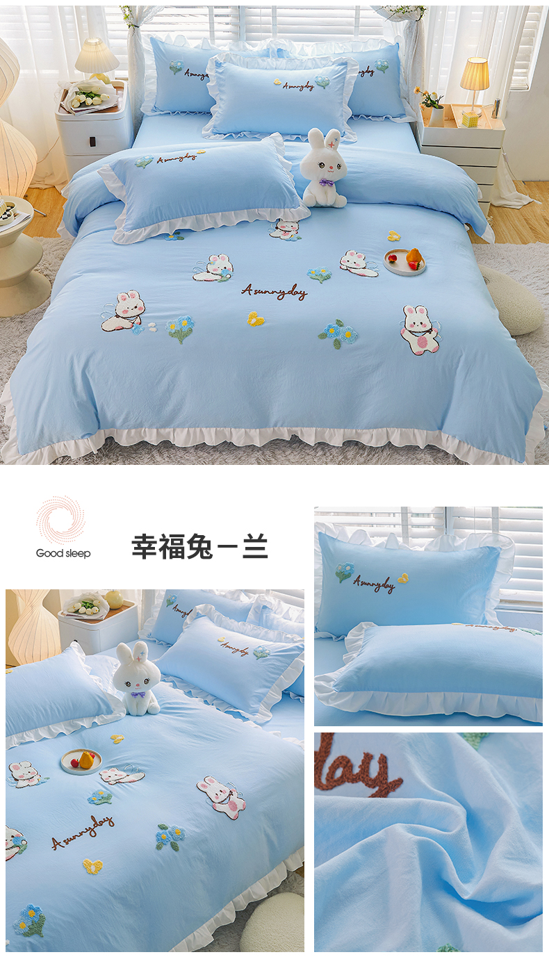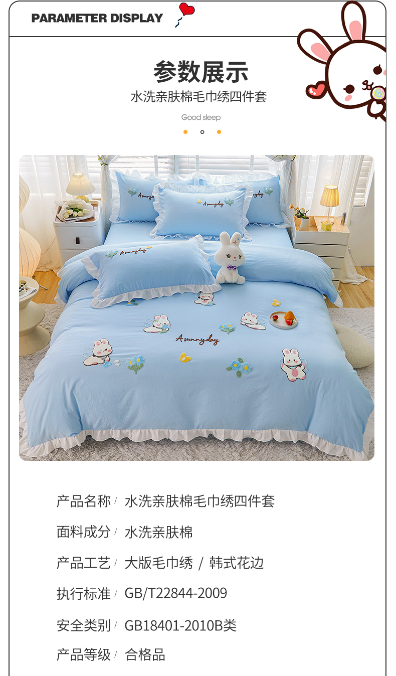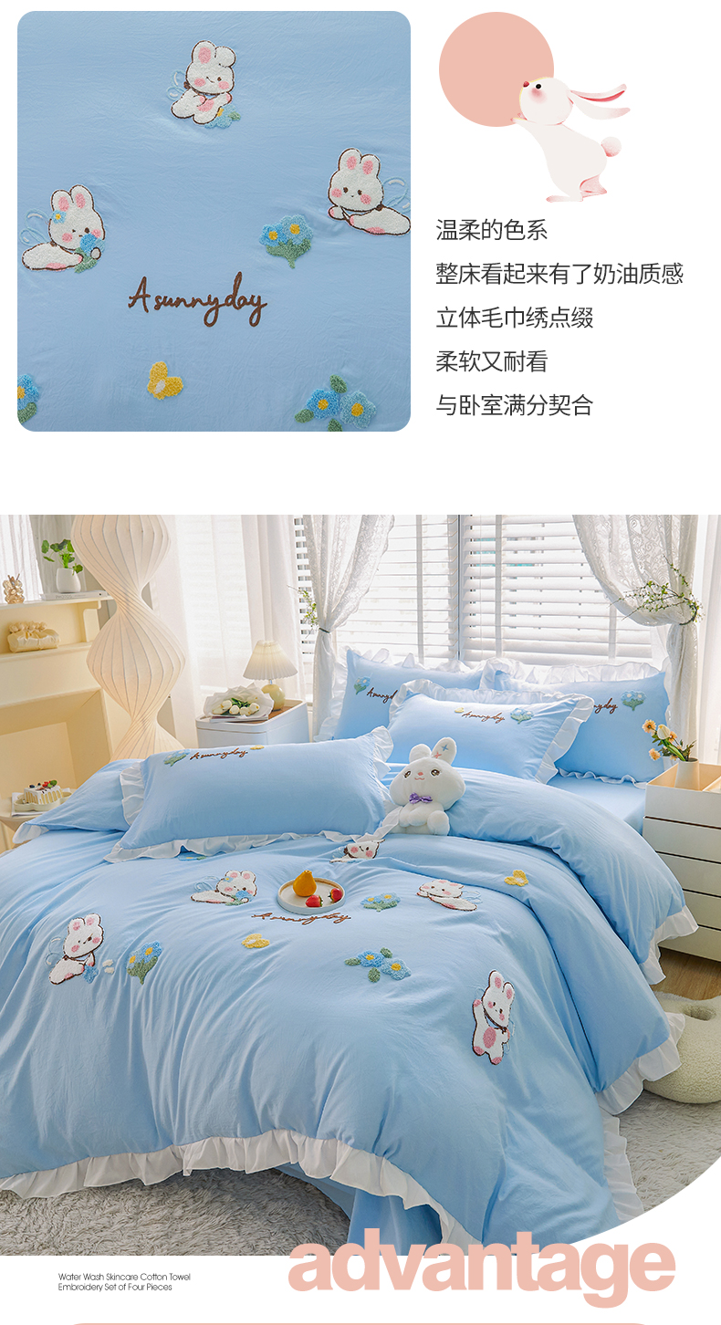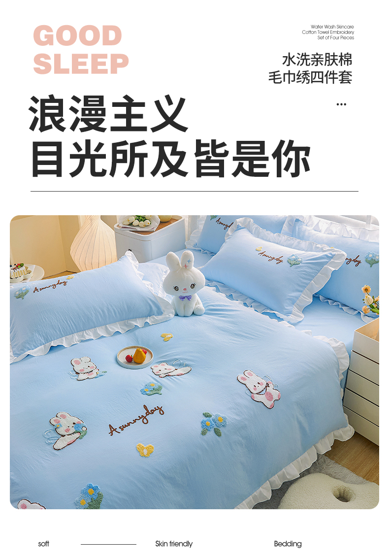 当前位置: 91家纺网 > 商品网购 > 床品套件 > 四件套 > 毛巾绣四件套 > 易禾家纺 2024新款水洗亲肤棉毛巾绣四件套专版花型-幸福兔 幸福兔-兰