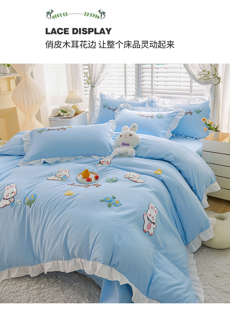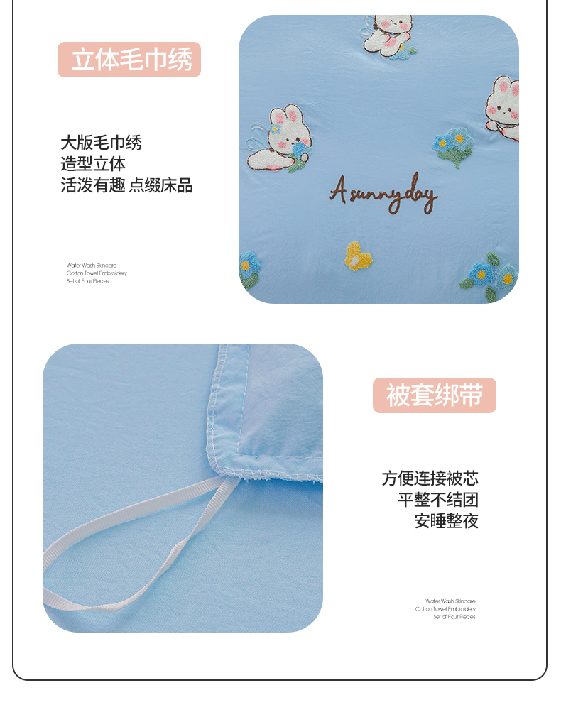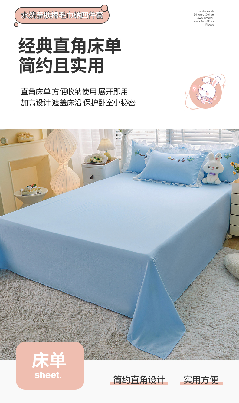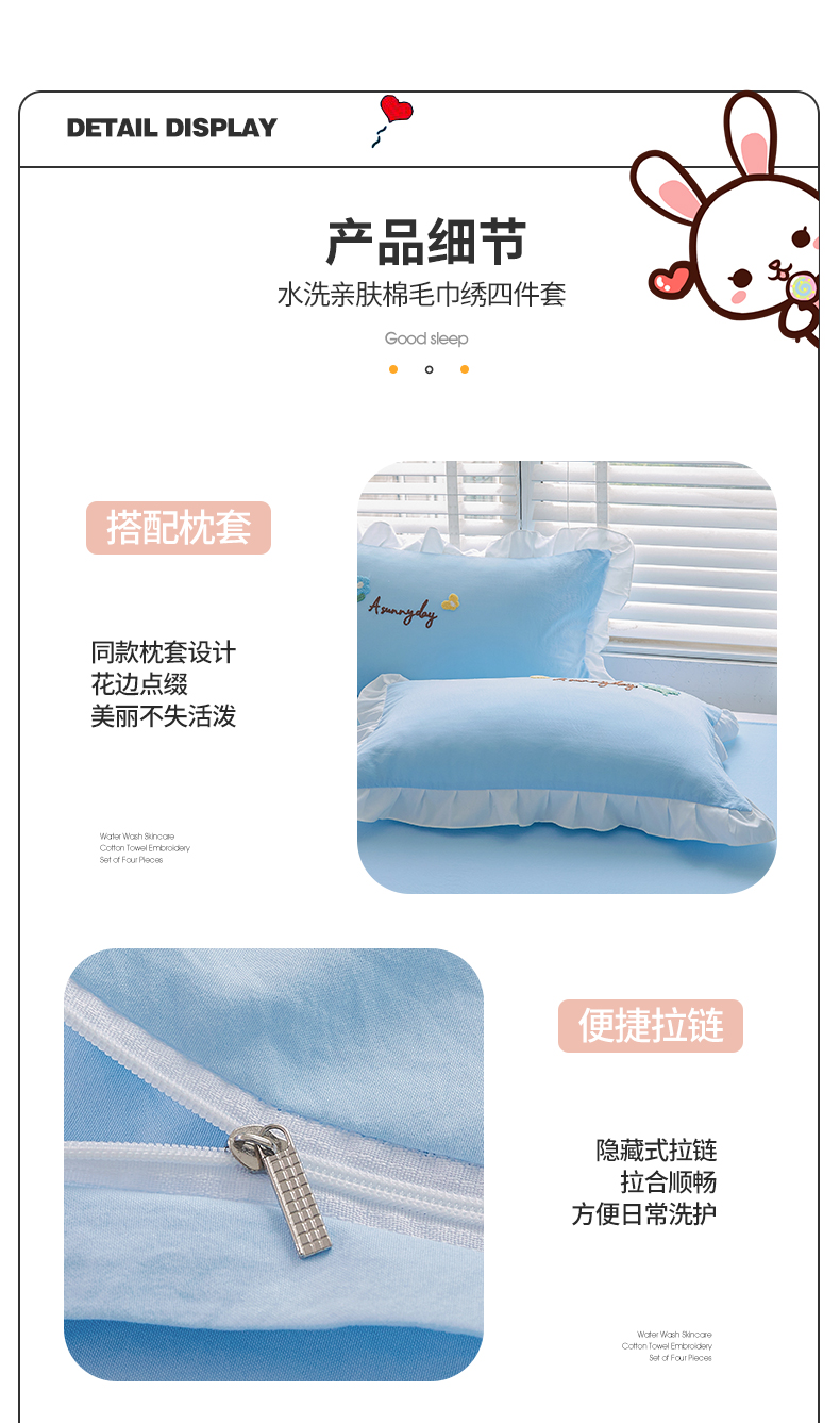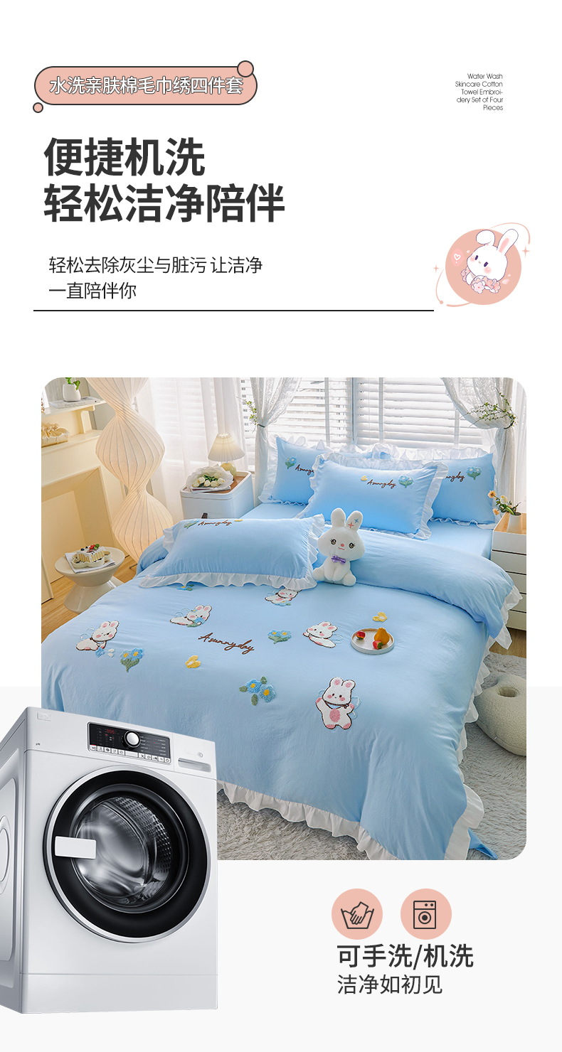当前位置: 91家纺网 > 商品网购 > 床品套件 > 四件套 > 毛巾绣四件套 > 易禾家纺 2024新款水洗亲肤棉毛巾绣四件套专版花型-幸福兔 幸福兔-兰