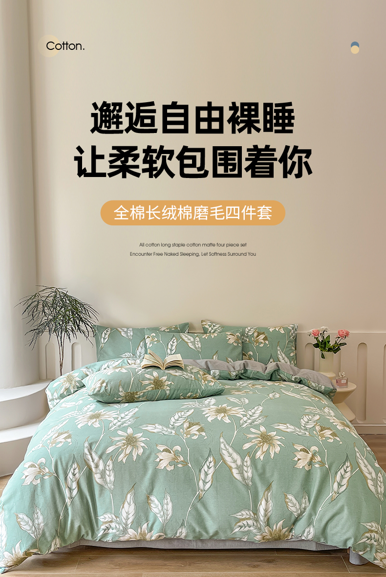 • 91家纺网 家纺一手货源 找家纺 棉乐町家居 2025新款全棉长绒棉磨毛四件套 花香溢梦-绿